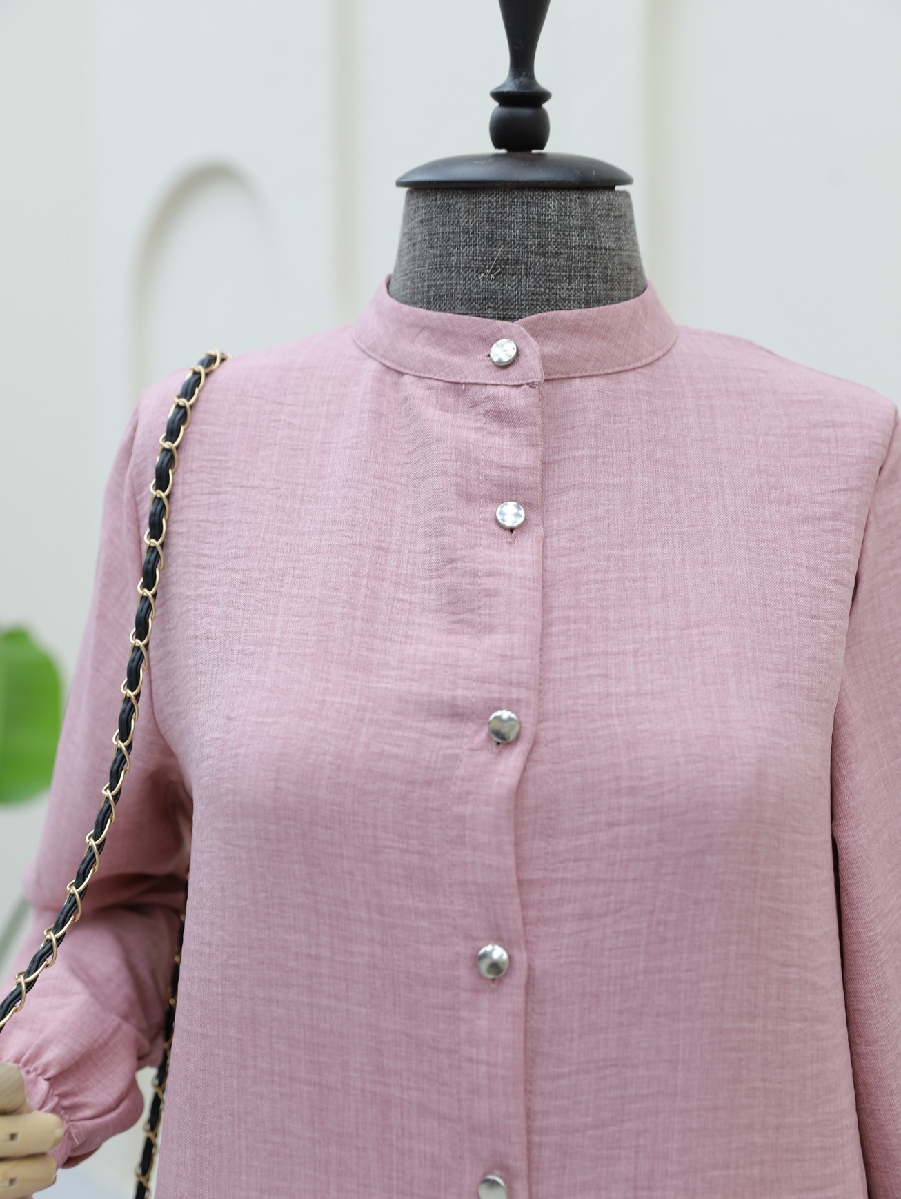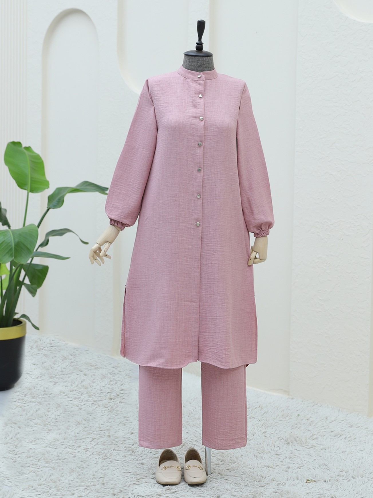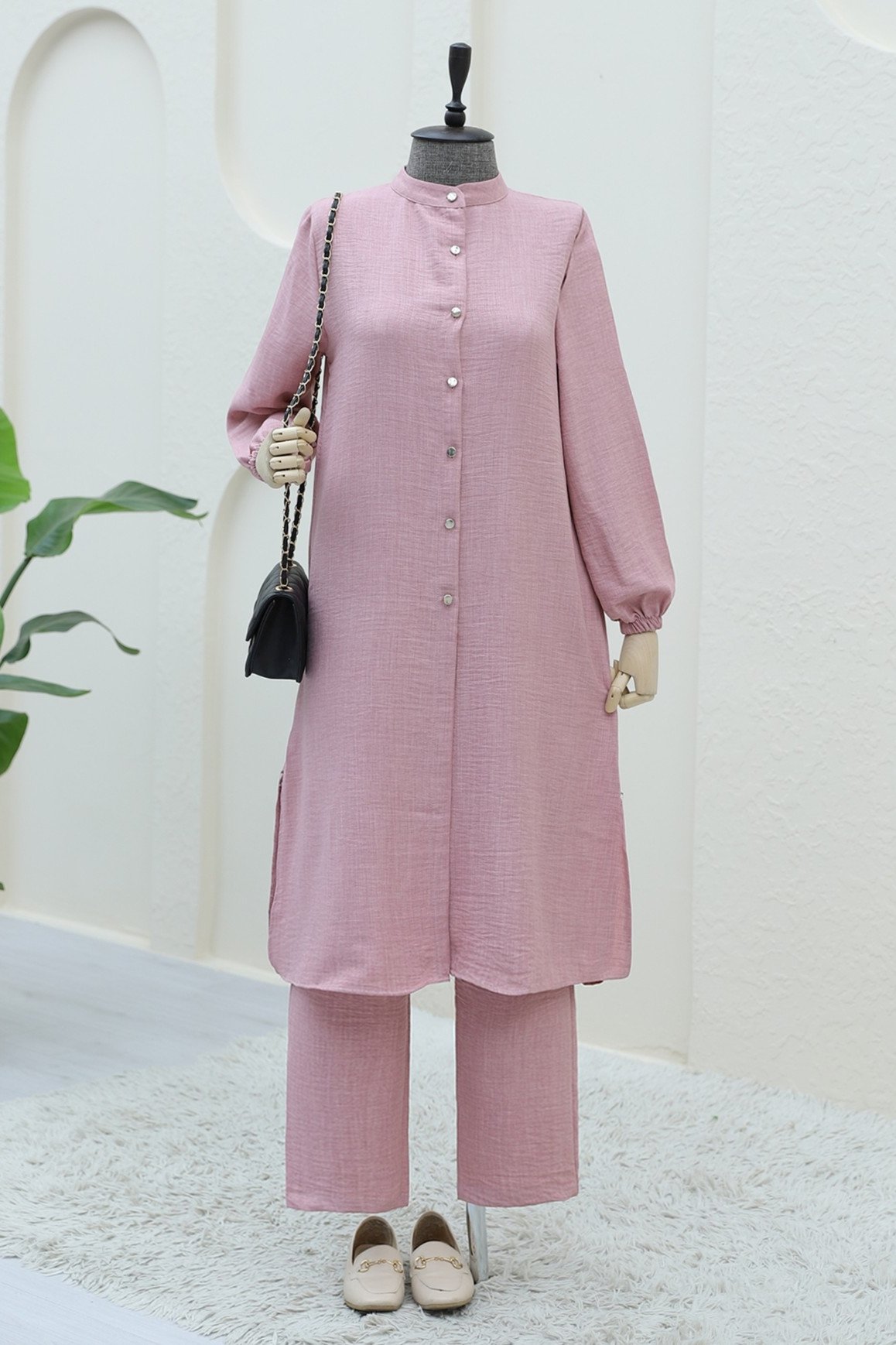 Metal Düğmeli Kolu Lastikli Pantolonlu Takım -Pudra
