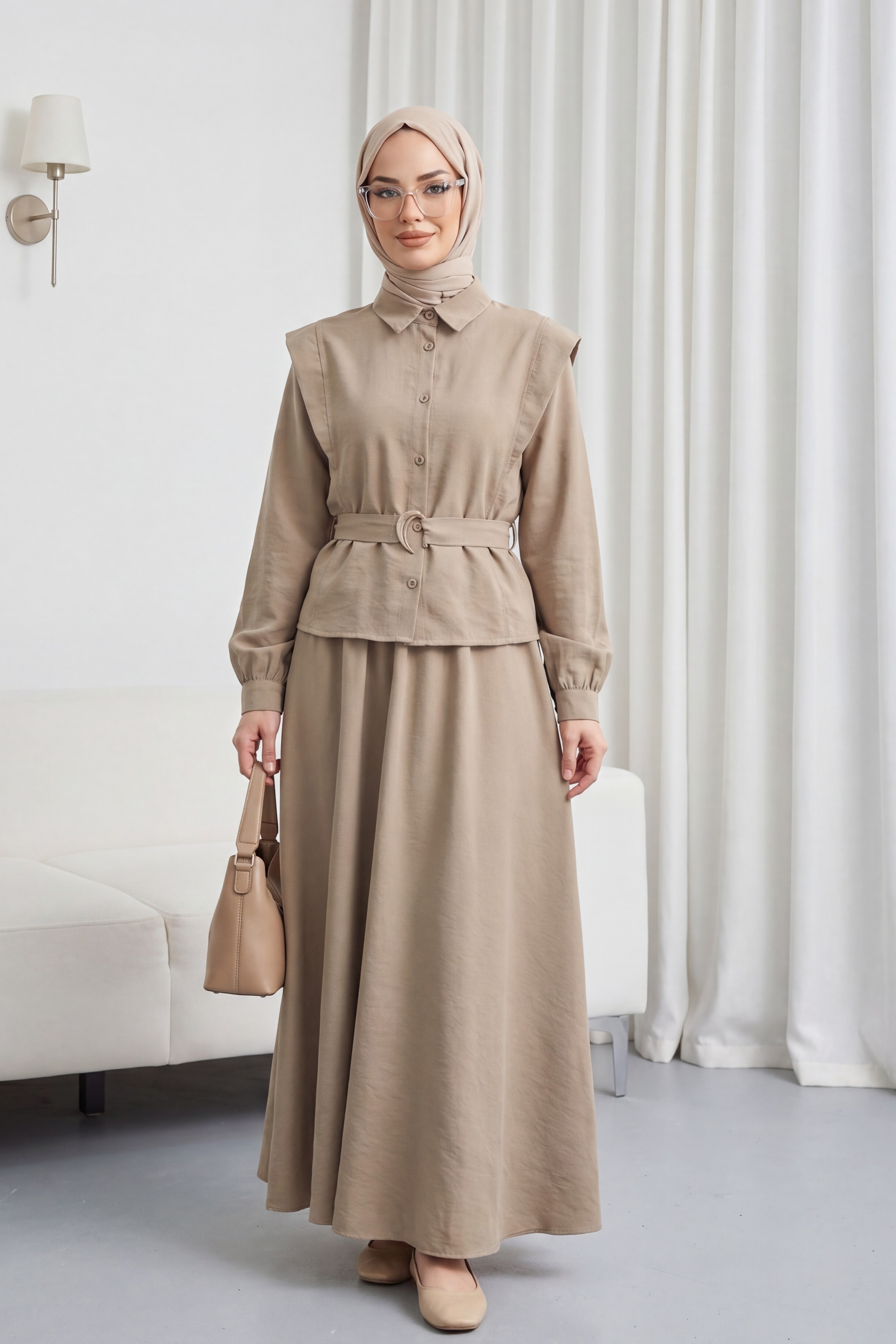 “vatka detaylı modal takım”, “kemerli etekli takım”, “şık kadın takım”, “modern ikili takım modeli” gibi adlandırılabilir.