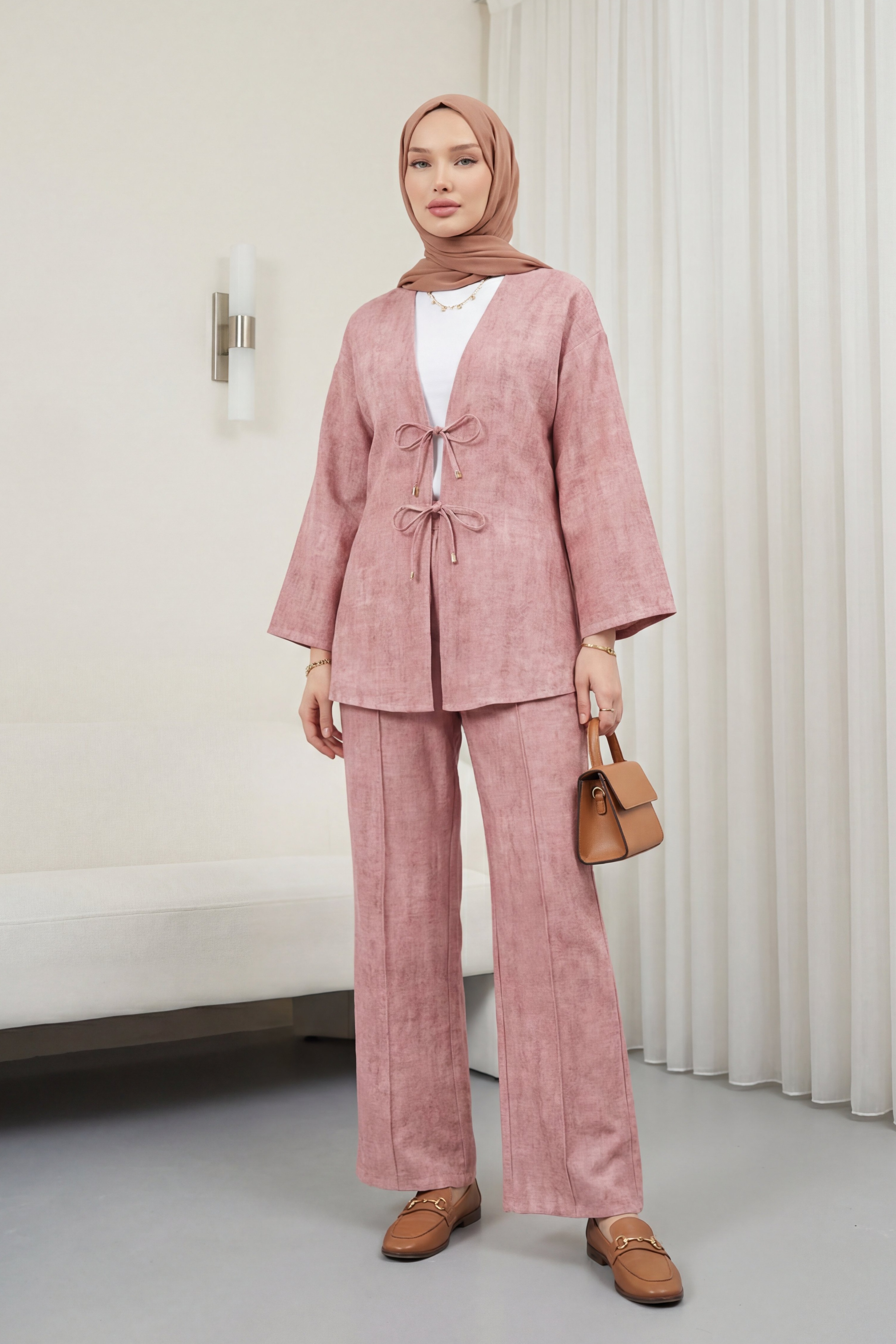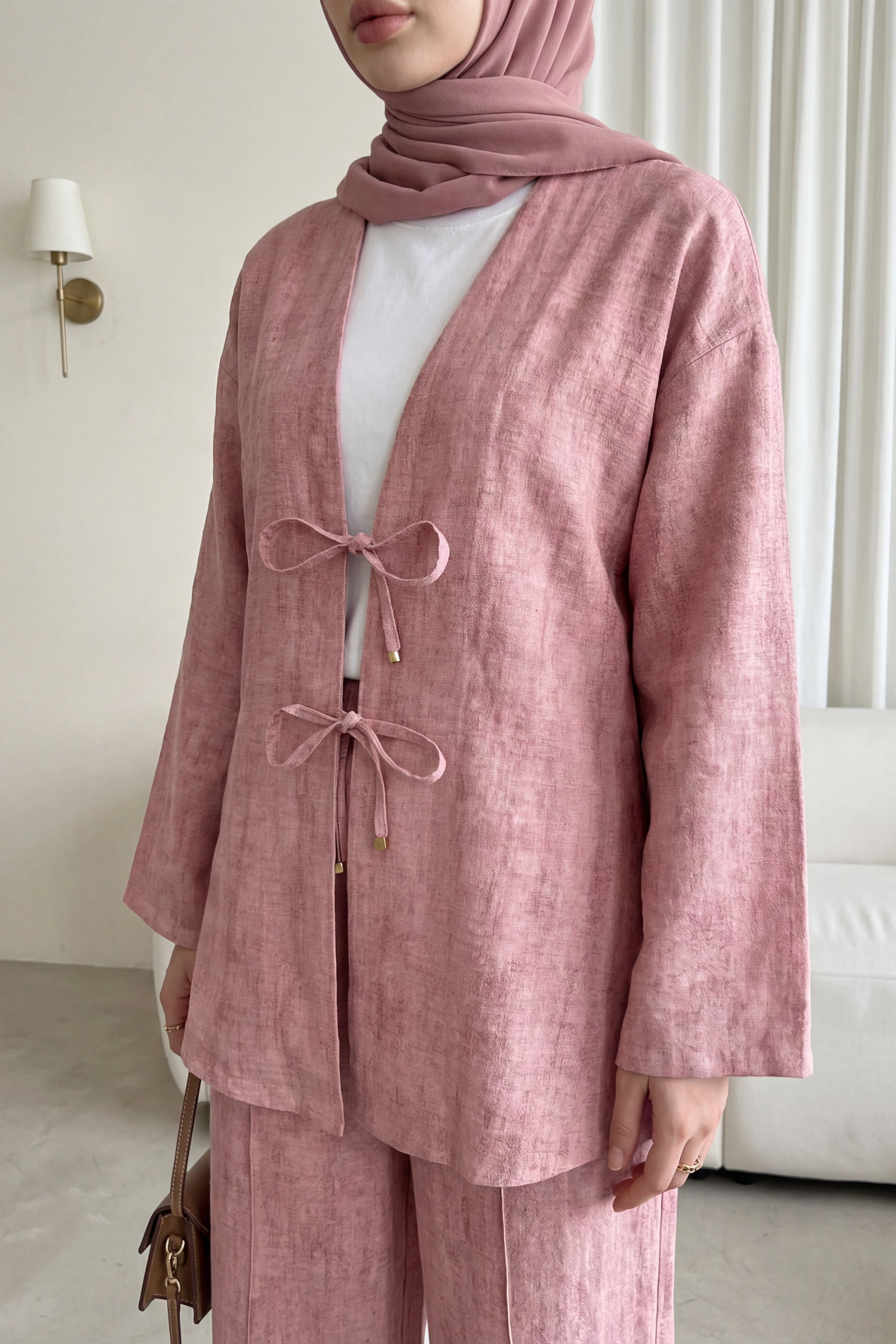 Önü Bağlamalı Pantolonlu Keten Kimono Takım -Pudra