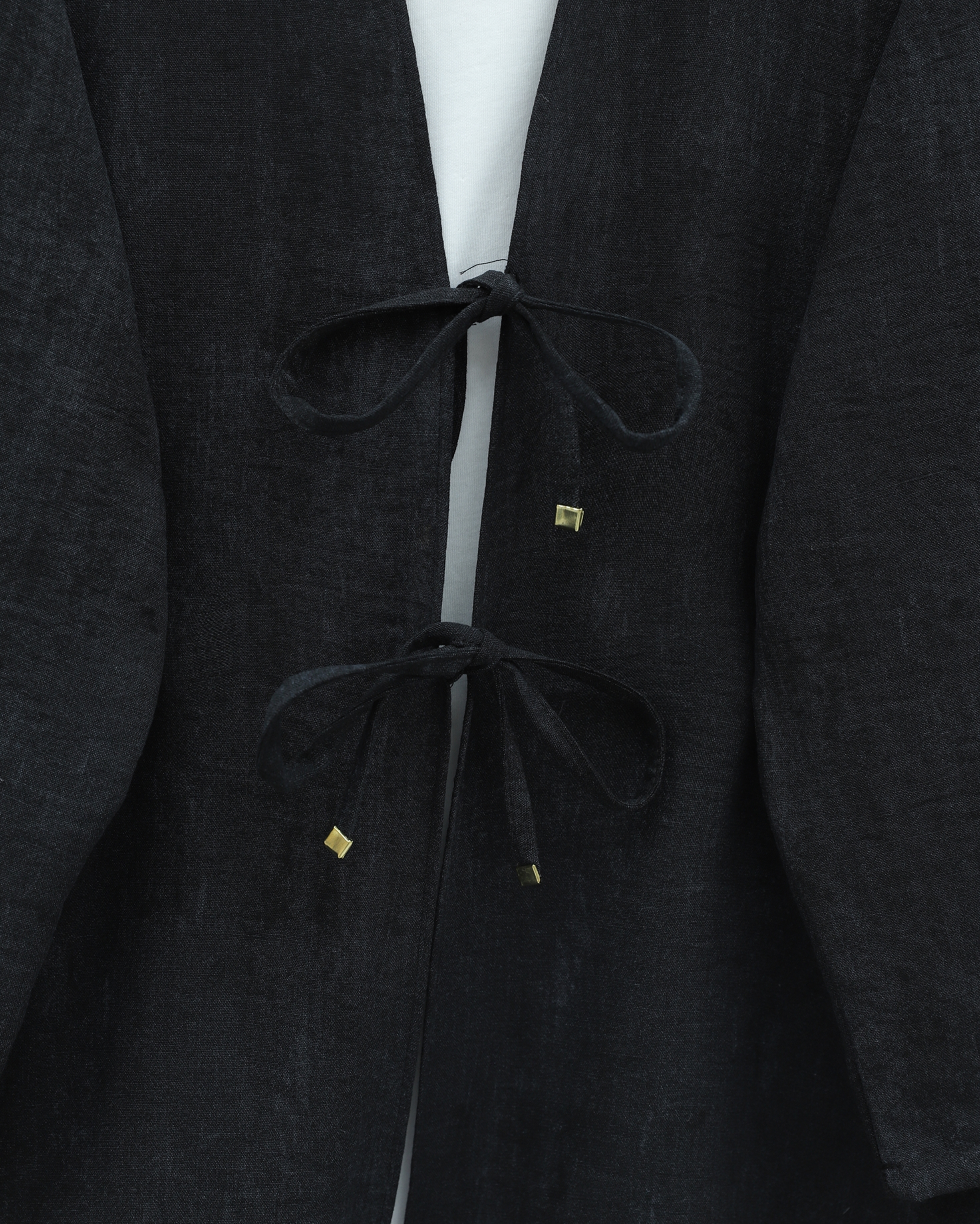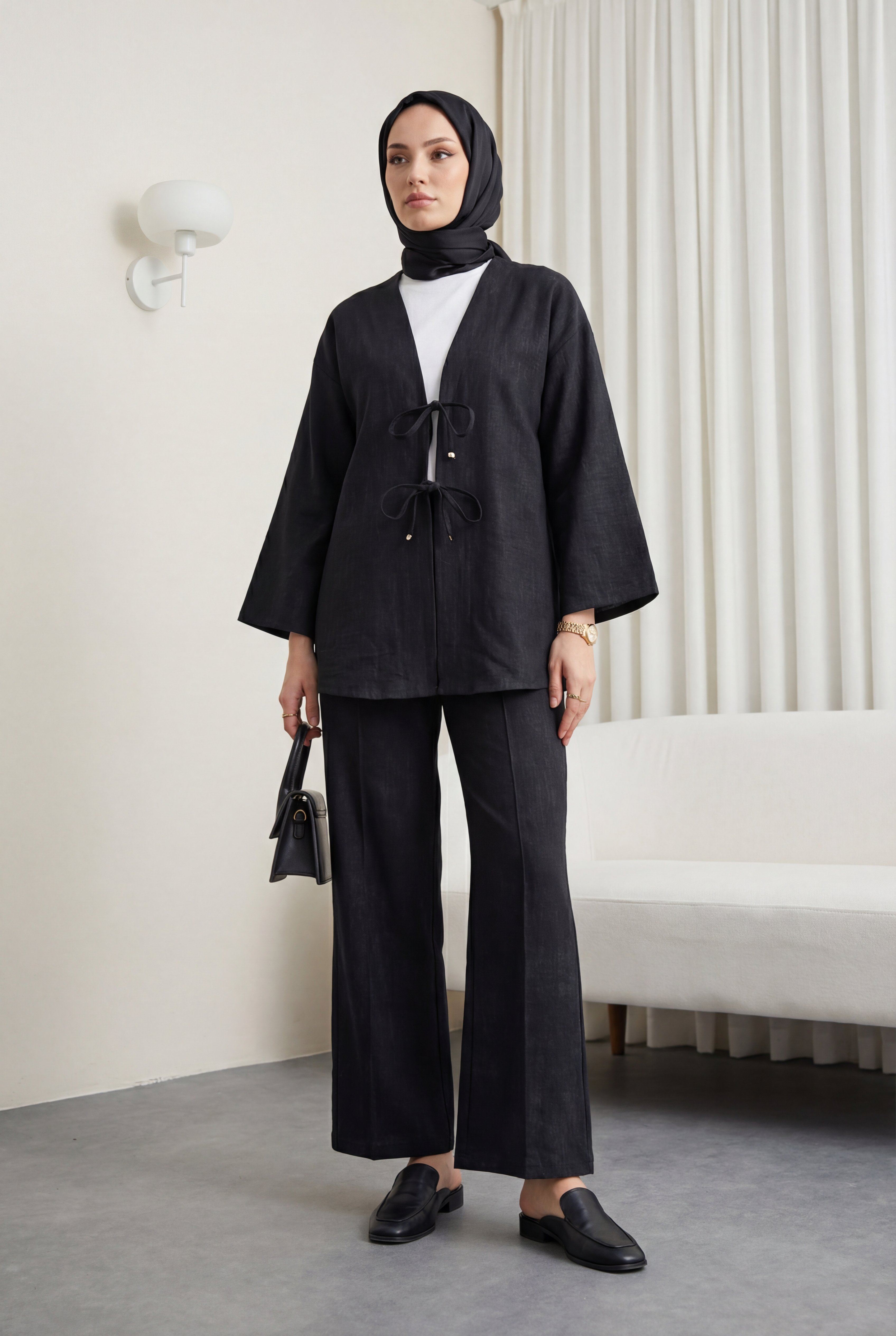 Doğal dokusu ve modern kesimiyle öne çıkan Önü Bağlamalı Pantolonlu Keten Kimono Takım, yaz ve mevsim geçişlerinin en şık ve konforlu tercihlerinden biri olmaya aday! Ön kısmındaki bağlama detayı tasarıma zarif ve feminen bir hava katarken, kimono formu salaş ve akışkan bir siluet oluşturur. Pantolonlu takım yapısı sayesinde zahmetsiz ve bütüncül bir stil sunar. Keten kumaşın hafif, nefes alabilen ve doğal dokusu gün boyu ferah bir kullanım sağlar. Vücuda oturan fakat sıkmayan ideal kalıbı ile hem rahat hem de dengeli bir duruş sunar. Günlük kombinlerden tatil stiline kadar geniş bir kullanım alanına sahiptir.
