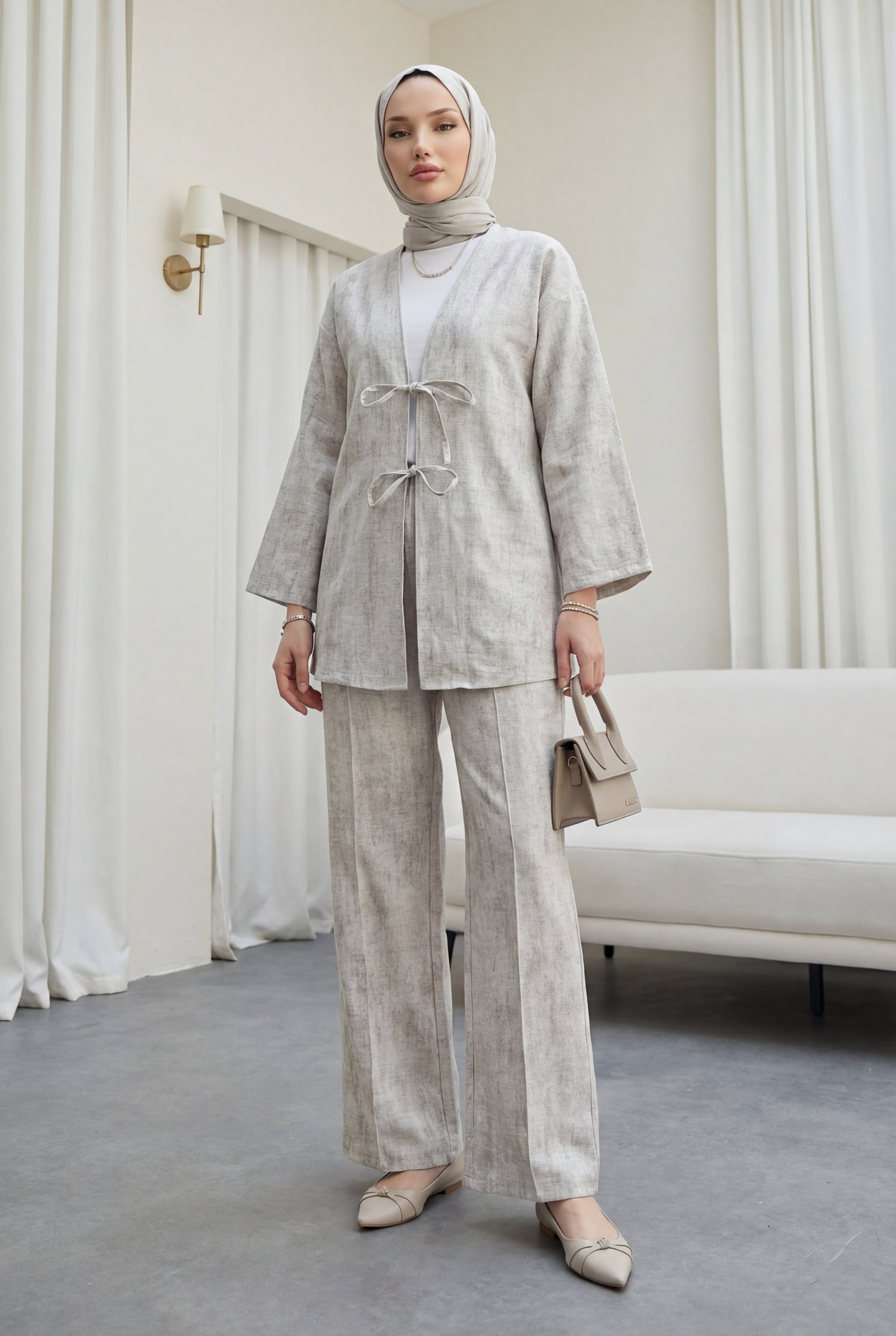 Önü Bağlamalı Pantolonlu Keten Kimono Takım -Taş
