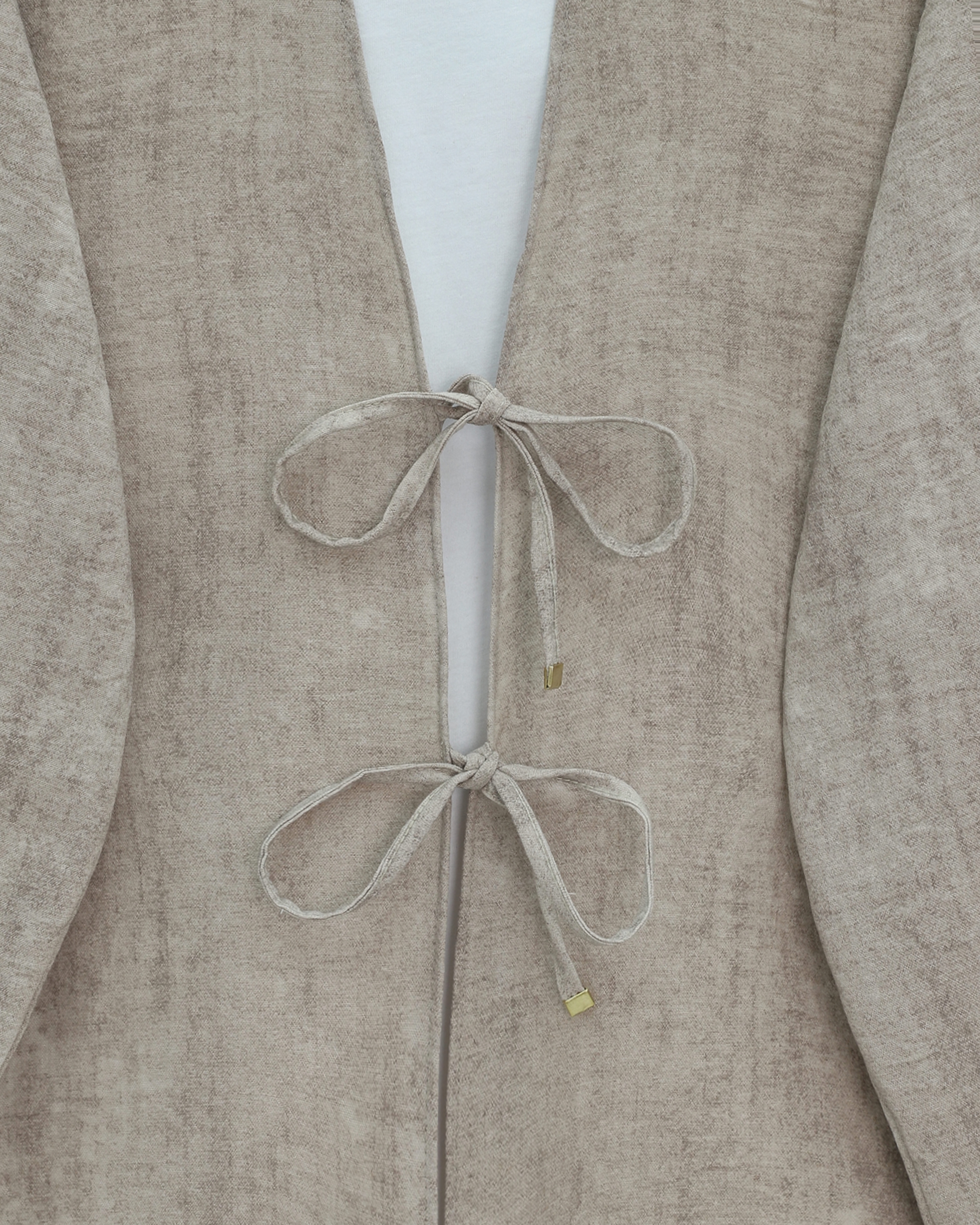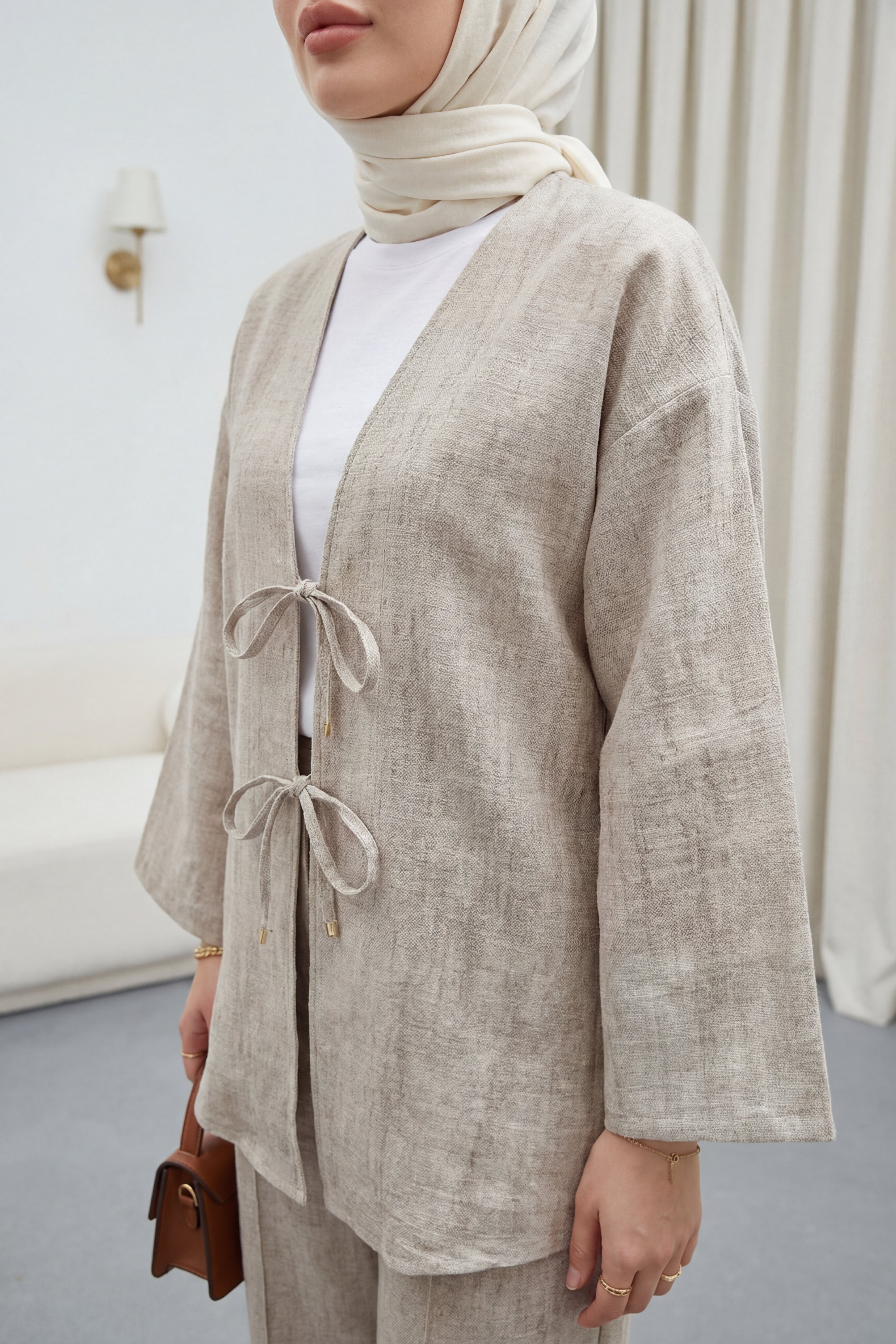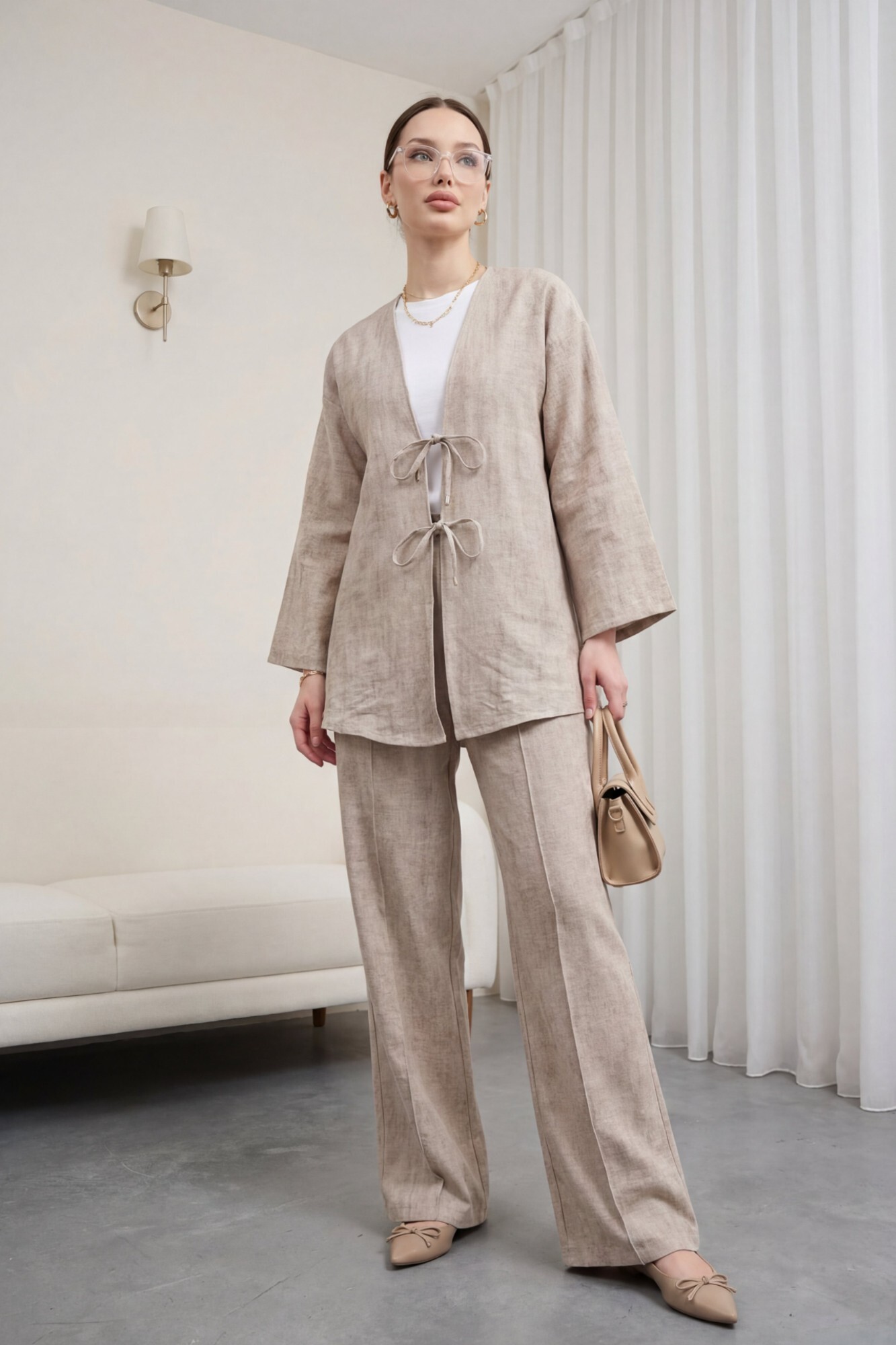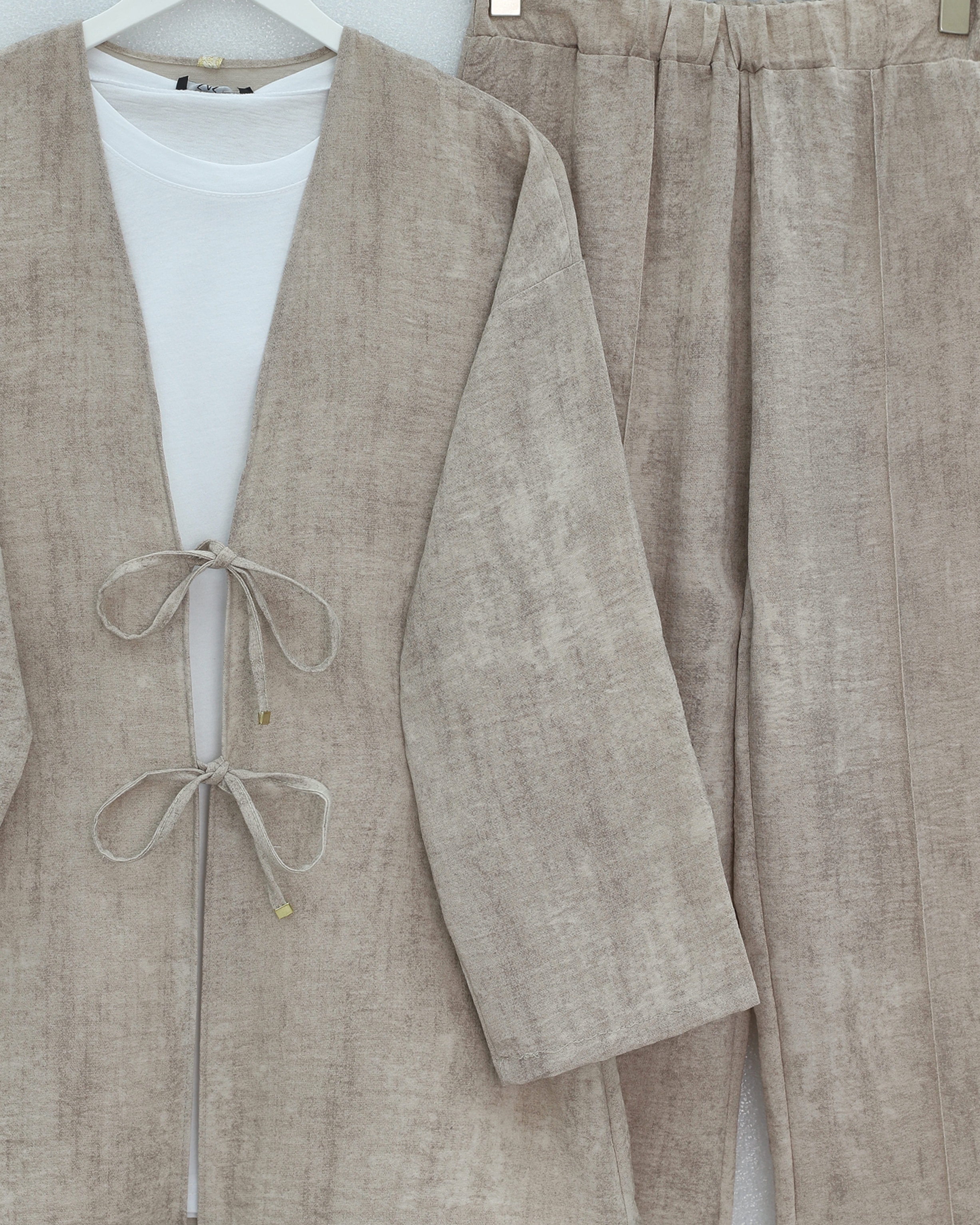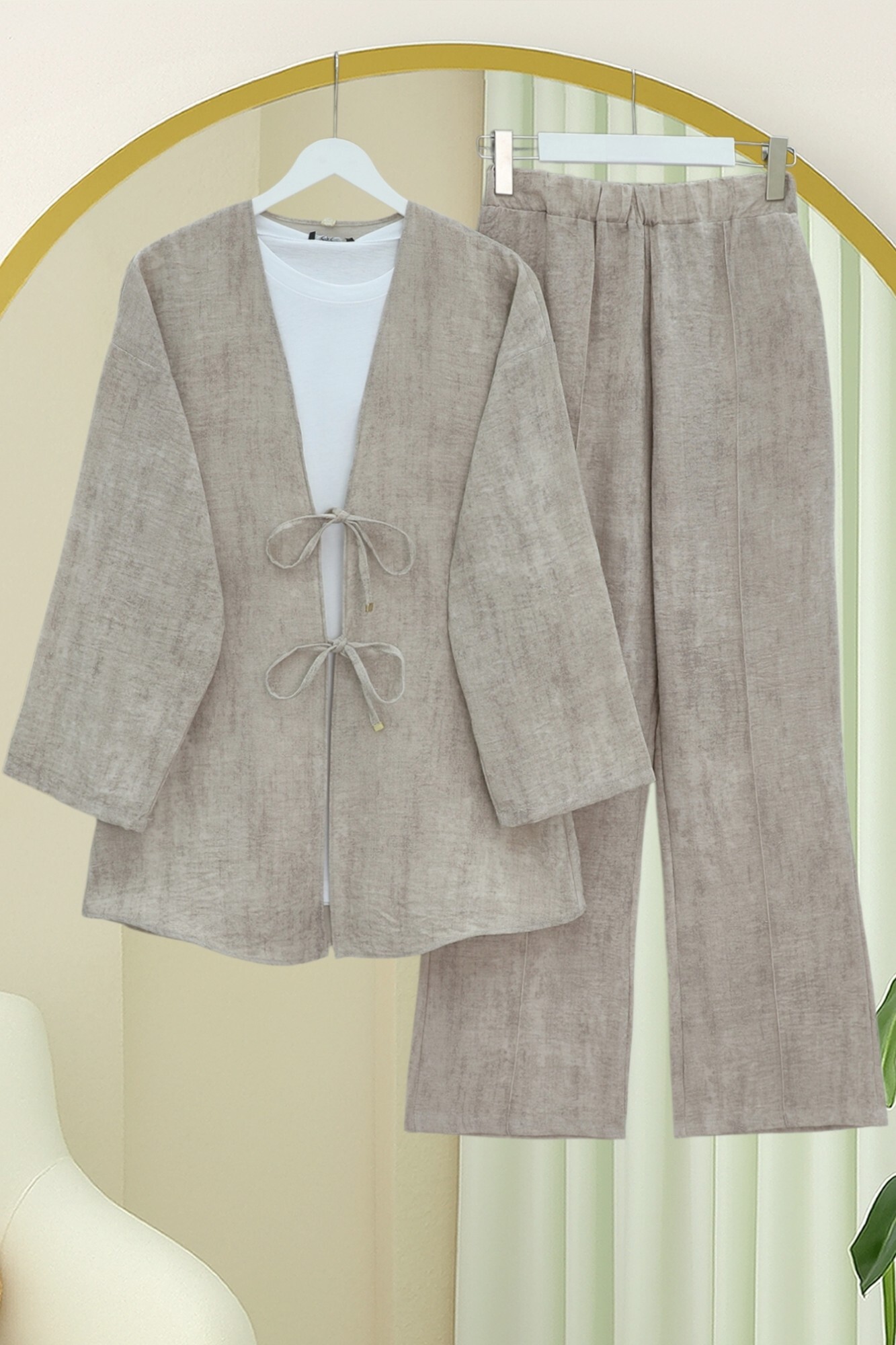 Önü Bağlamalı Pantolonlu Keten Kimono Takım -Vizon