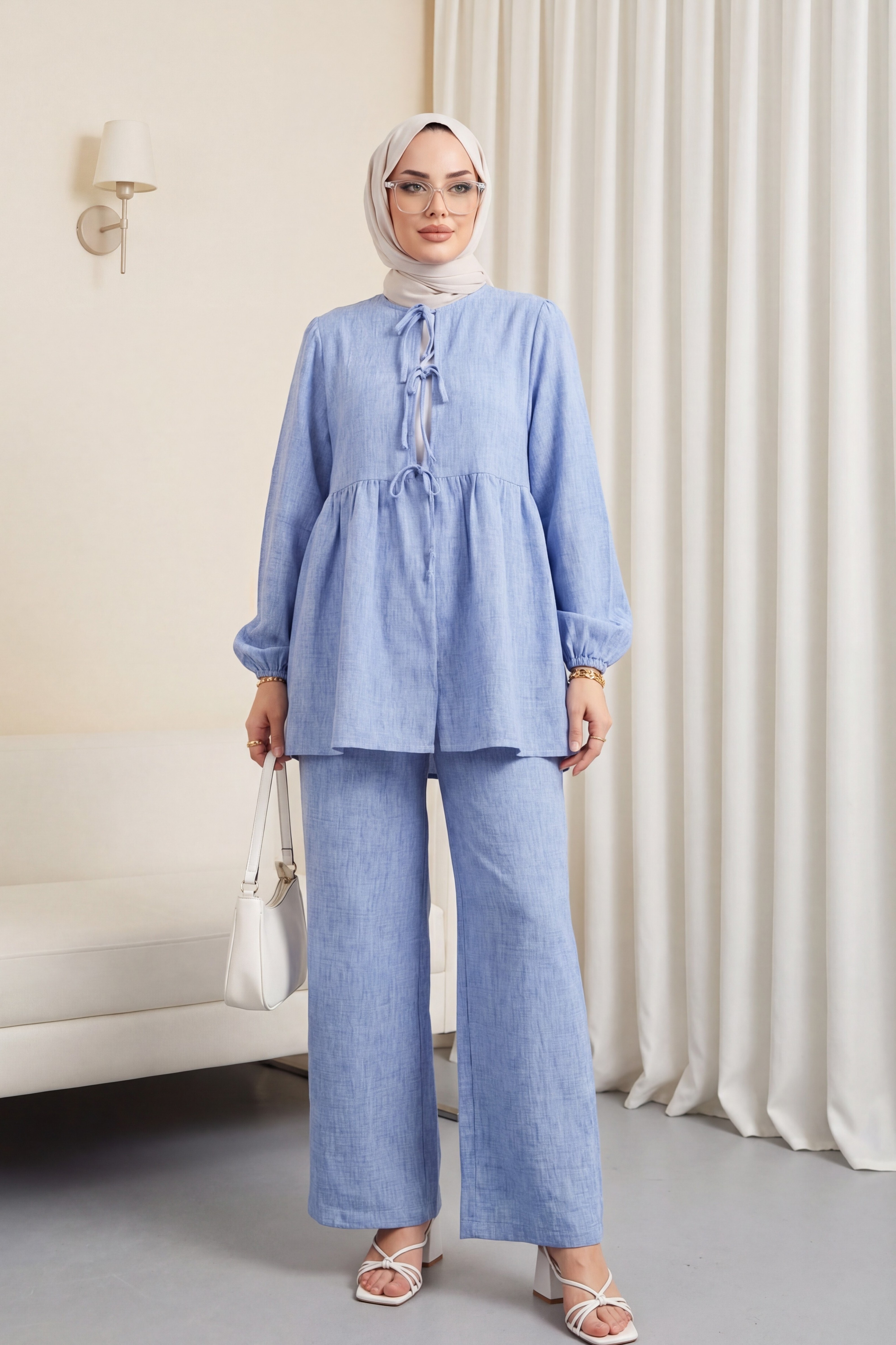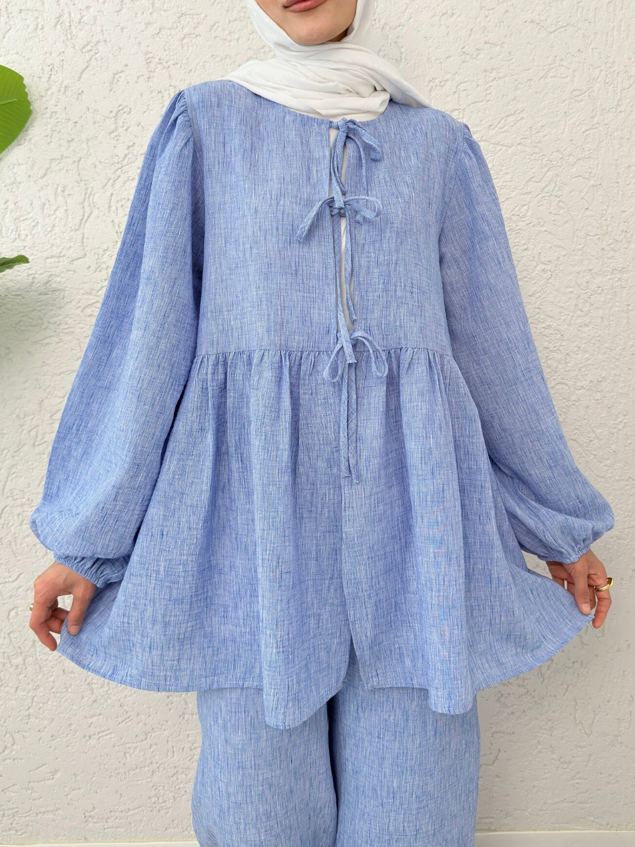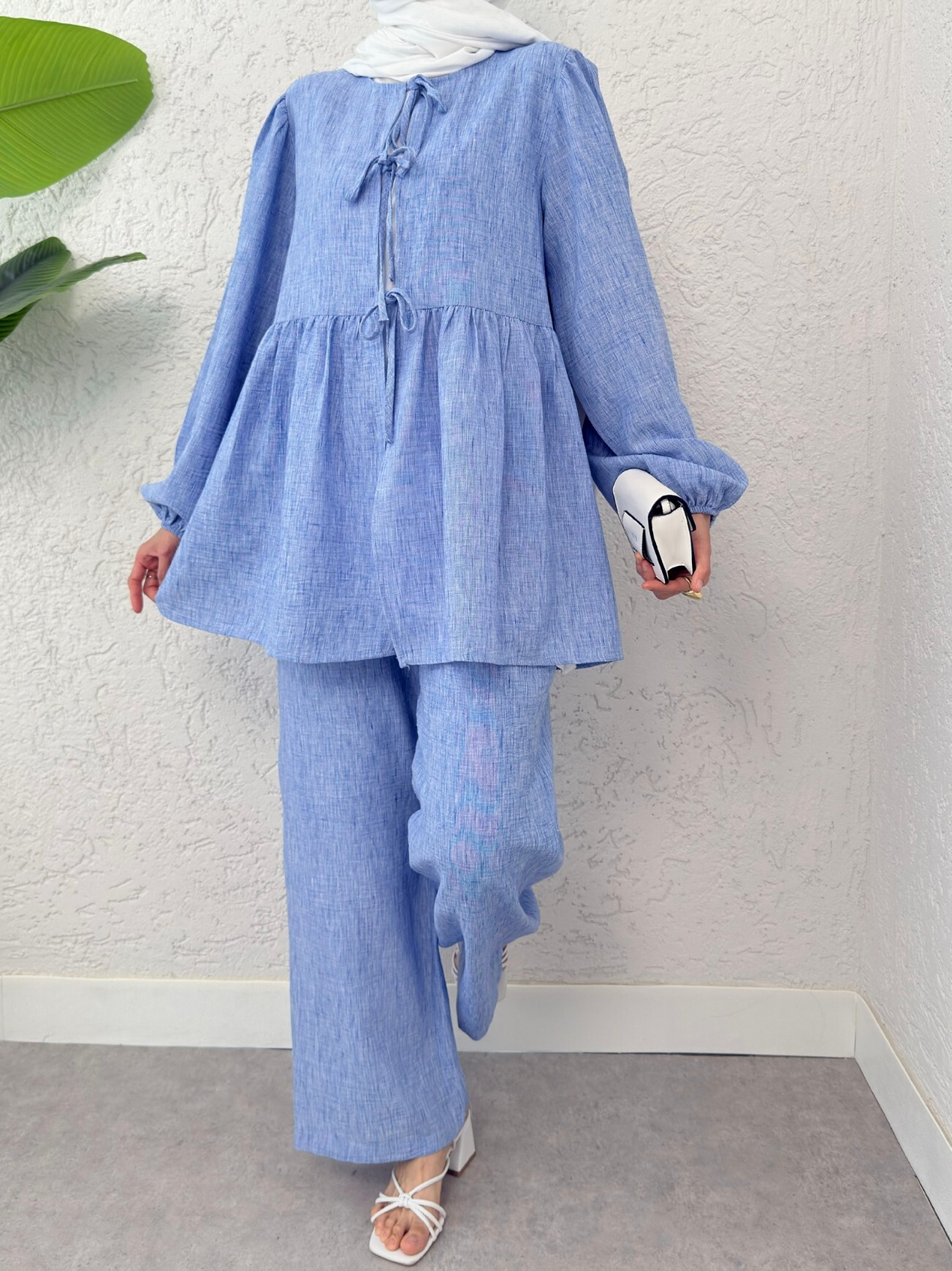 Önü bağlamalı tasarımı ve parçalı detaylarıyla dikkat çeken bu kolu lastikli takım, modern şıklığı ve rahatlığı bir arada sunar. Günlük şıklığınızdan özel davetlere kadar her anınızı tamamlayan bu takım, her gardırobun vazgeçilmezi olacak!