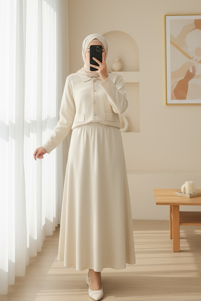 Önü Düğmeli Etekli Yakalı Triko Takım -Ekru