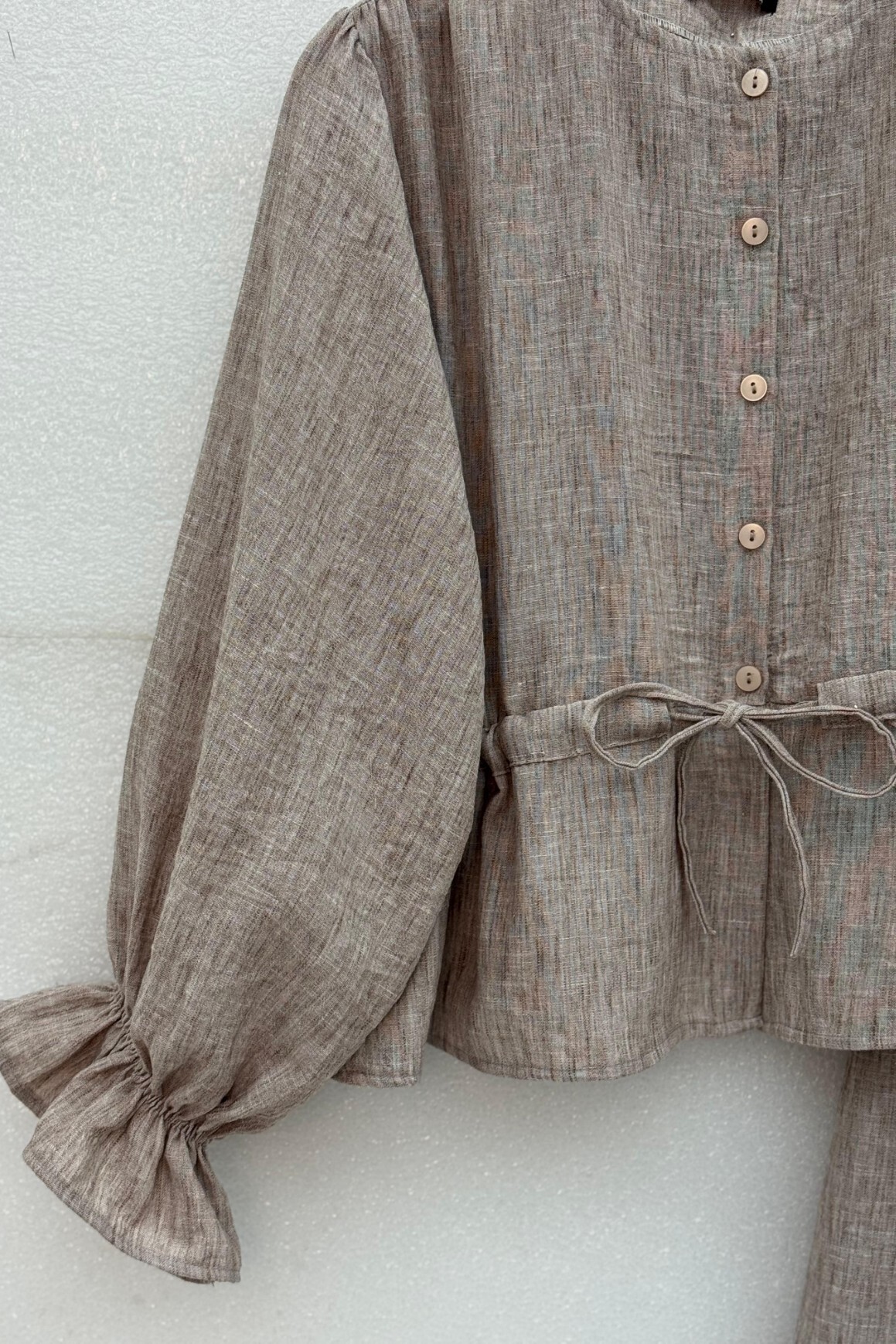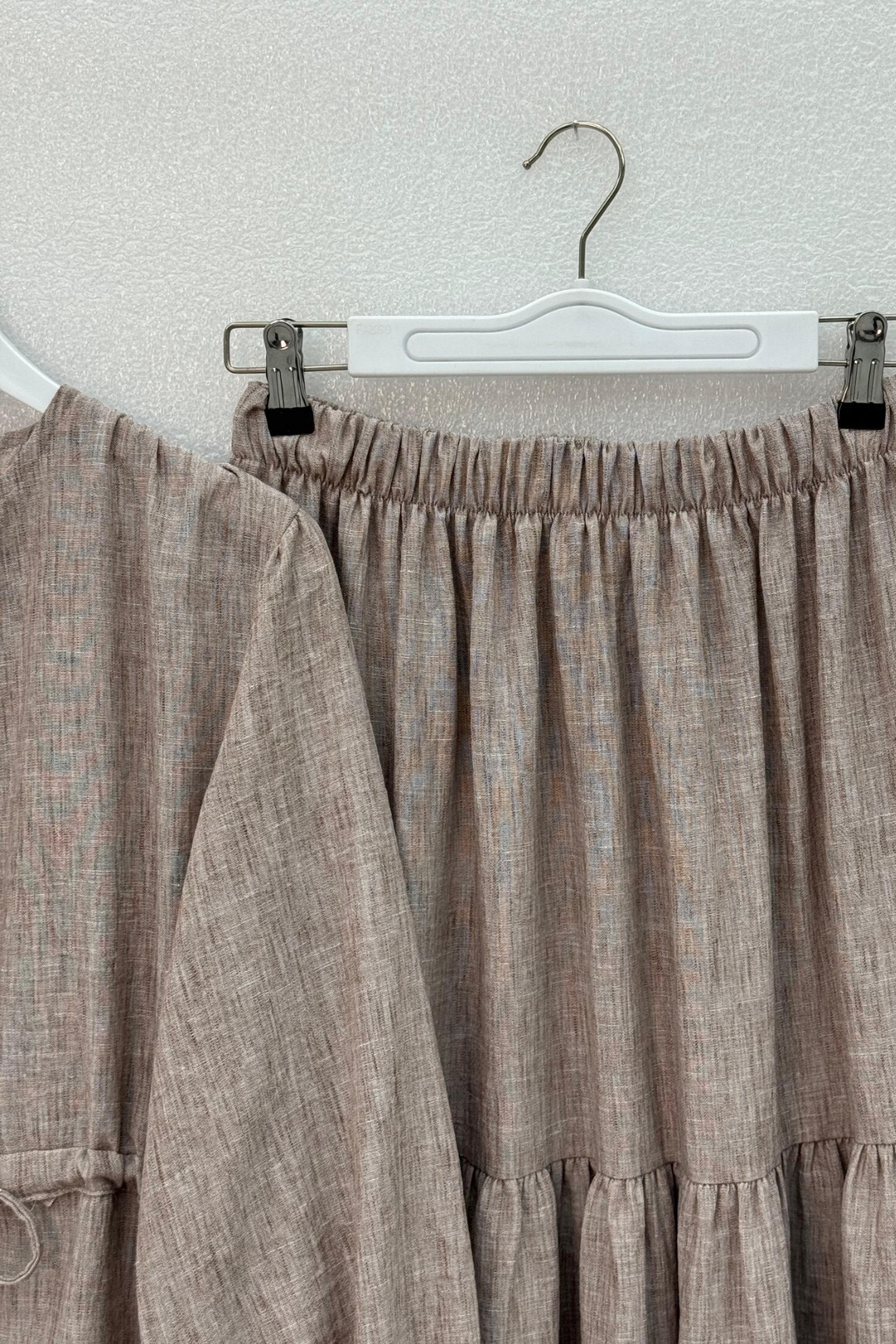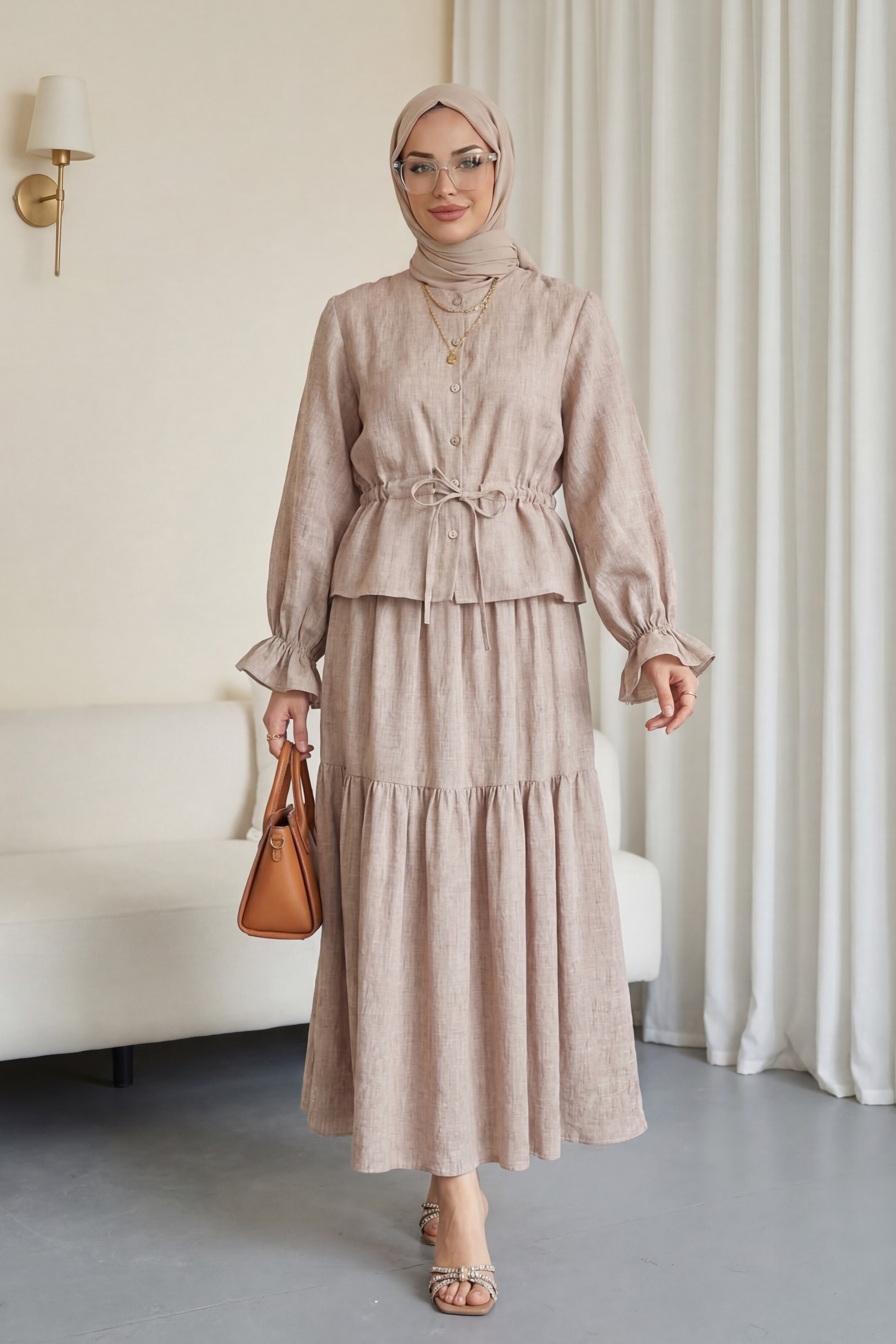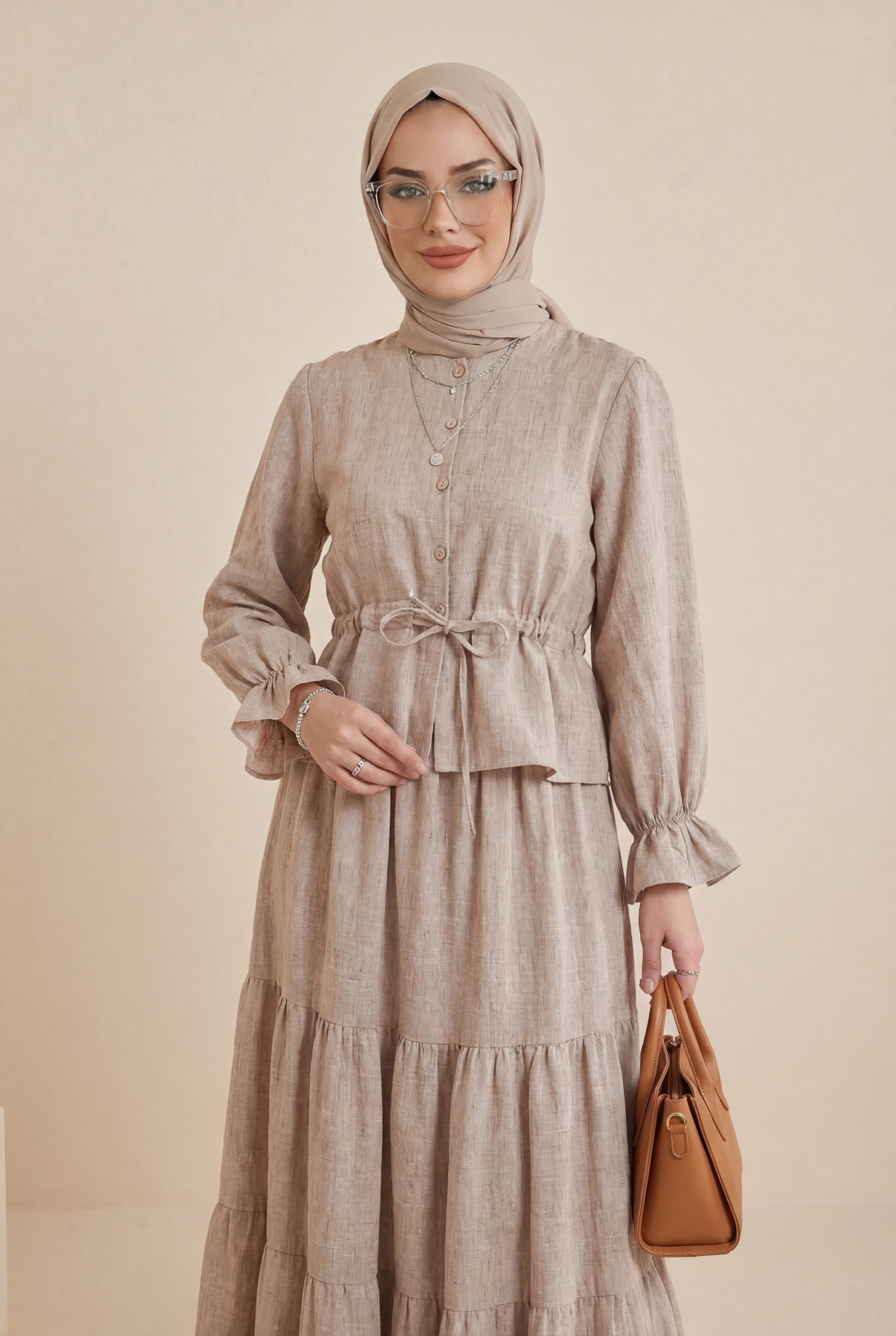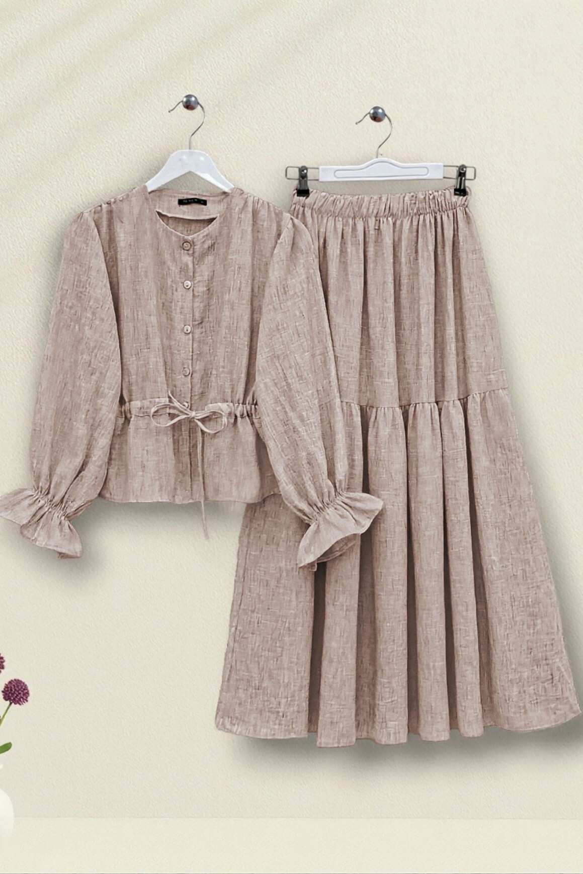 Doğal keten dokusuyla ferah bir kullanım sunan Önü Düğmeli Kolu Lastikli Tünel Bağcıklı Keten Takım, hem şıklığı hem rahatlığı bir arada sunar. Önü düğmeli tasarımıyla kolay giyilir, tünel bağcık detayıyla bele oturur ve zarif bir siluet oluşturur. Günlük stilinizde konforlu ve trend bir tercih!
