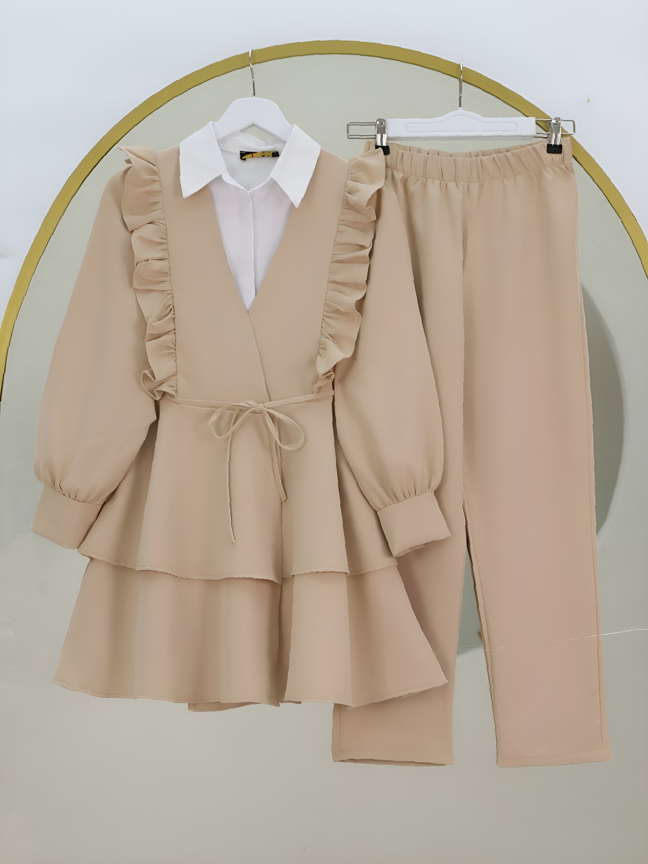 Ürün tunik ve pantolon olarak ikili takımdan oluşmaktadır. Gömlek dekor amaçlıdır, dahil değildir.