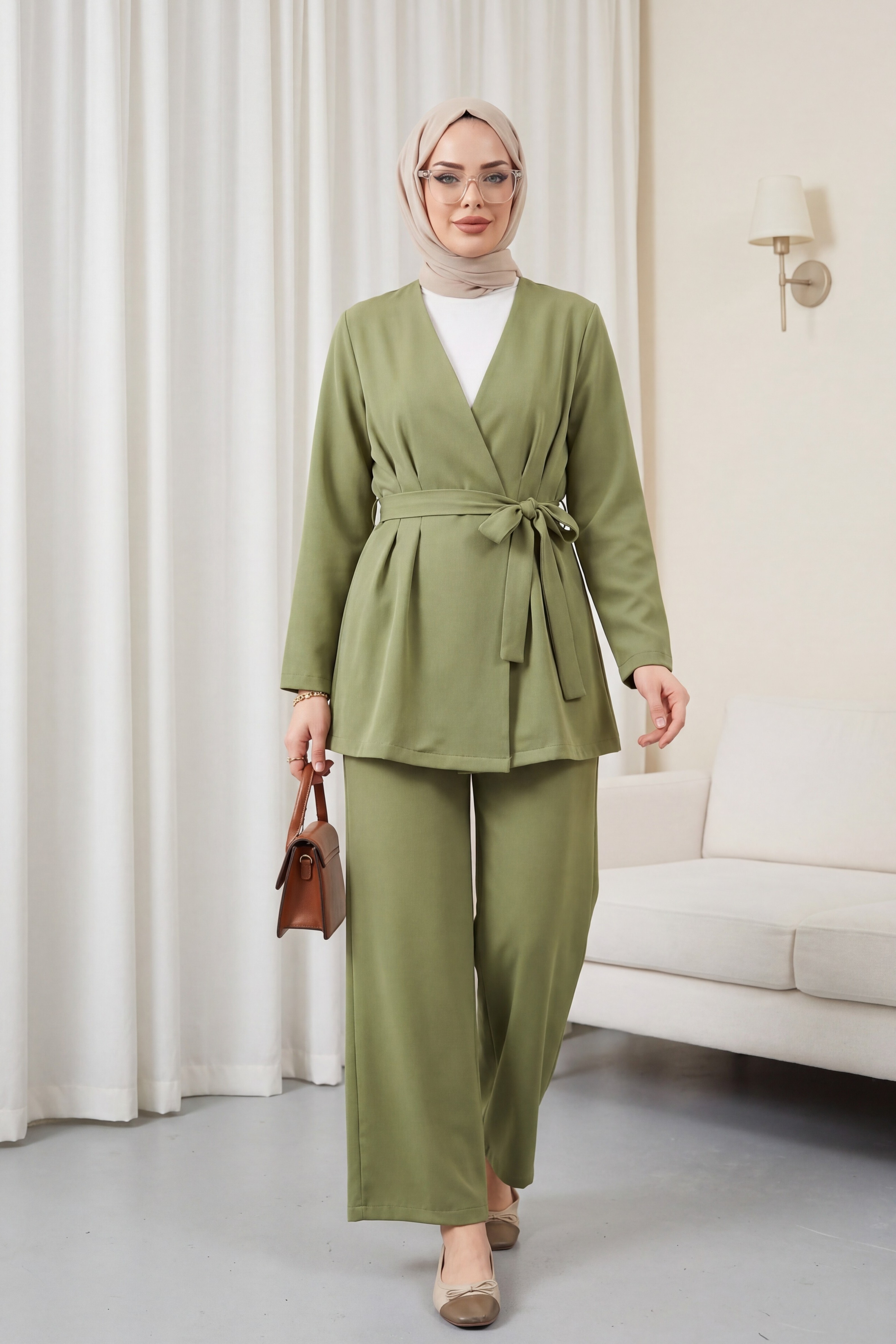 “krep pantolonlu takım”, “çapraz bağlamalı takım”, “şık kadın takım modeli”, “modern ikili takım” gibi adlandırılabilir.