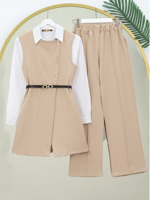 Püskül Detaylı İnci Düğmeli Etekli Takım, inci düğmeleri ve hareketli püskül detaylarıyla zarif ve şık bir görünüm sunar. Özel davetlerden günlük şıklığa kadar her ortamda stilinizi öne çıkarır. Modern ve feminen kombinler için ideal bir parçadır.
