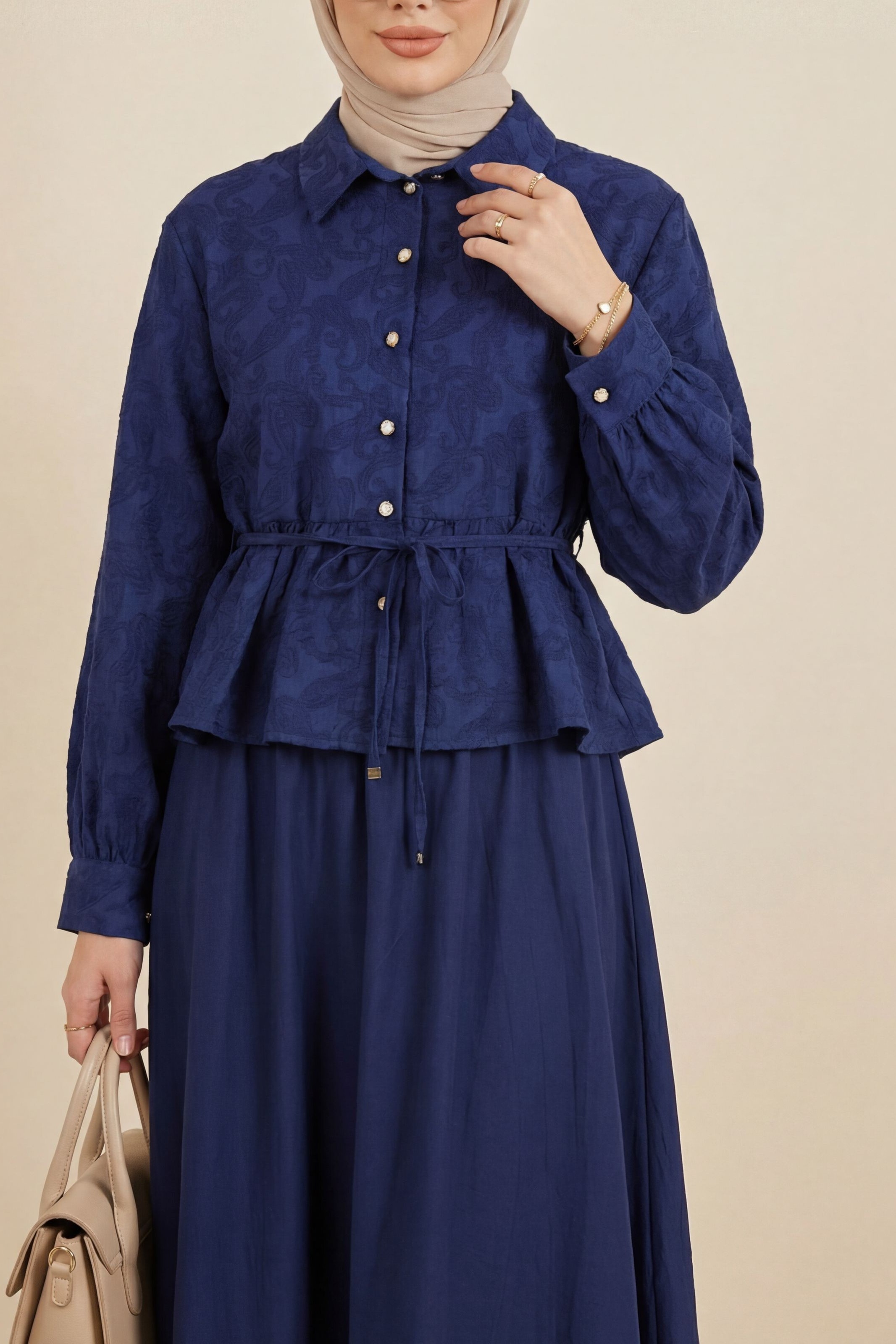 Taşlı Düğmeli Beli Bağlamalı Etekli Jakar Takım, zarif ve dikkat çekici bir stil sunar. Taşlı düğme detayları ışıltılı bir dokunuş katarken, beli bağlamalı formu silueti zarif şekilde vurgular. Jakar kumaşı dokulu ve şık bir görünüm sağlar. Etekli tasarımı feminen bir duruş sunar.
