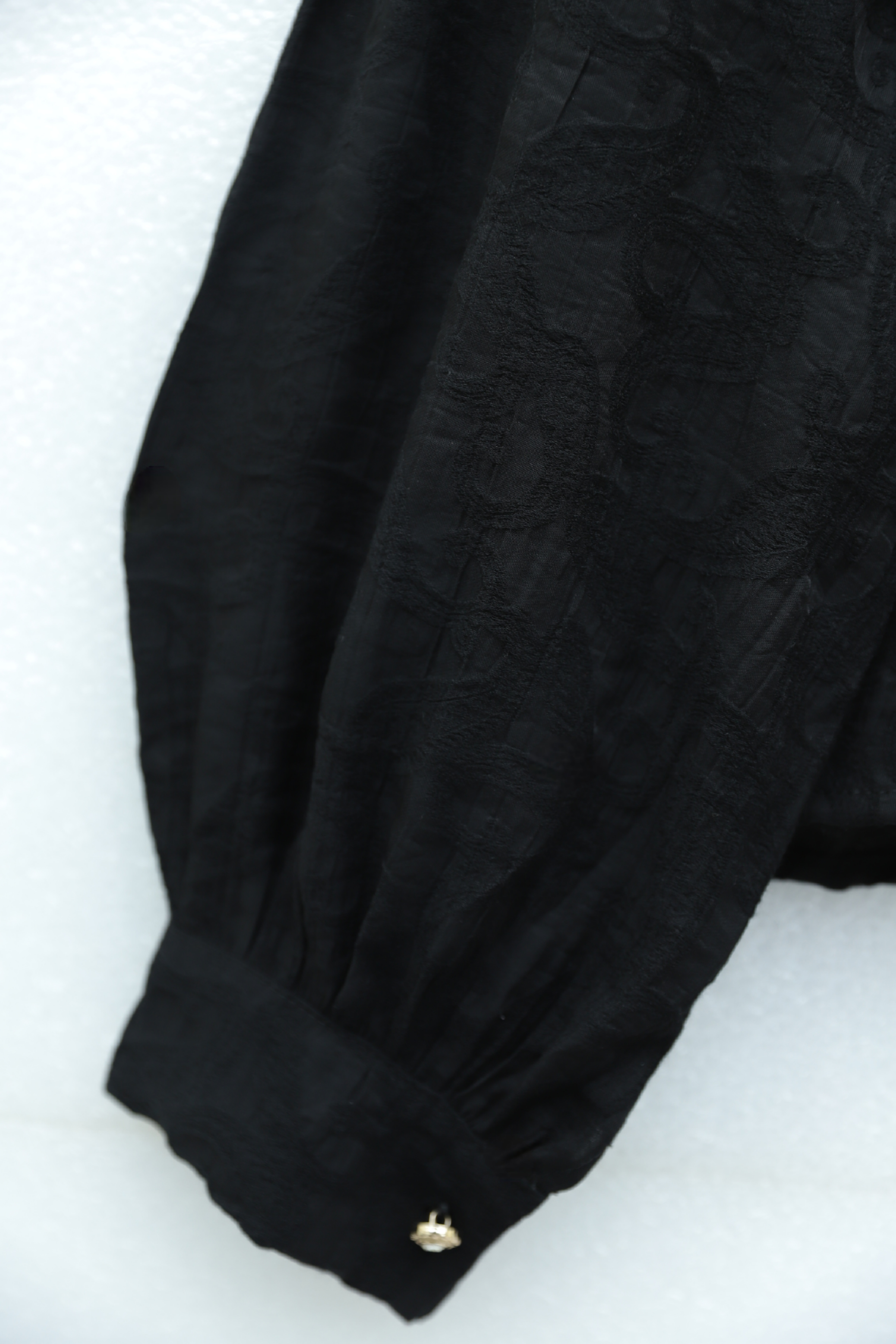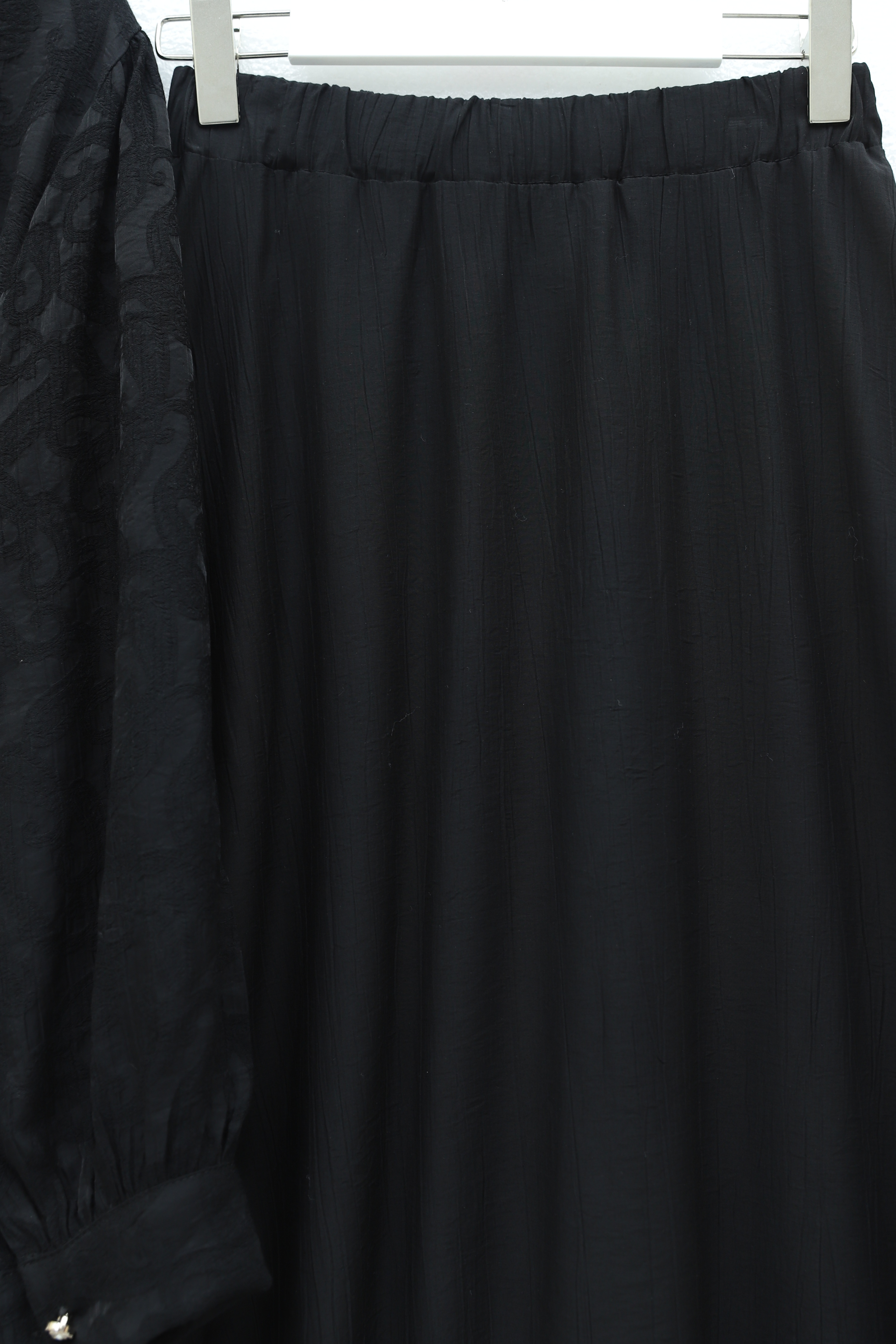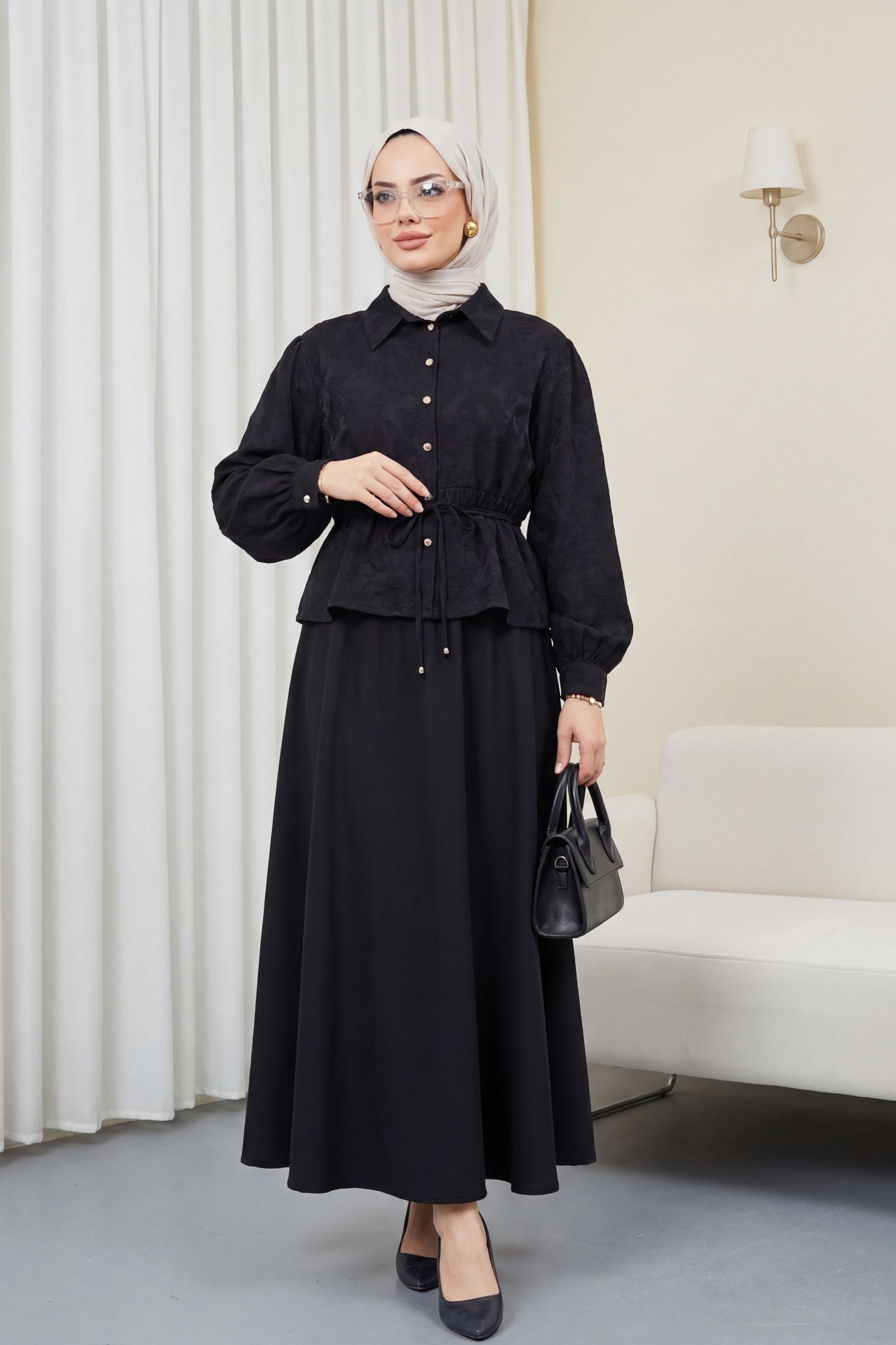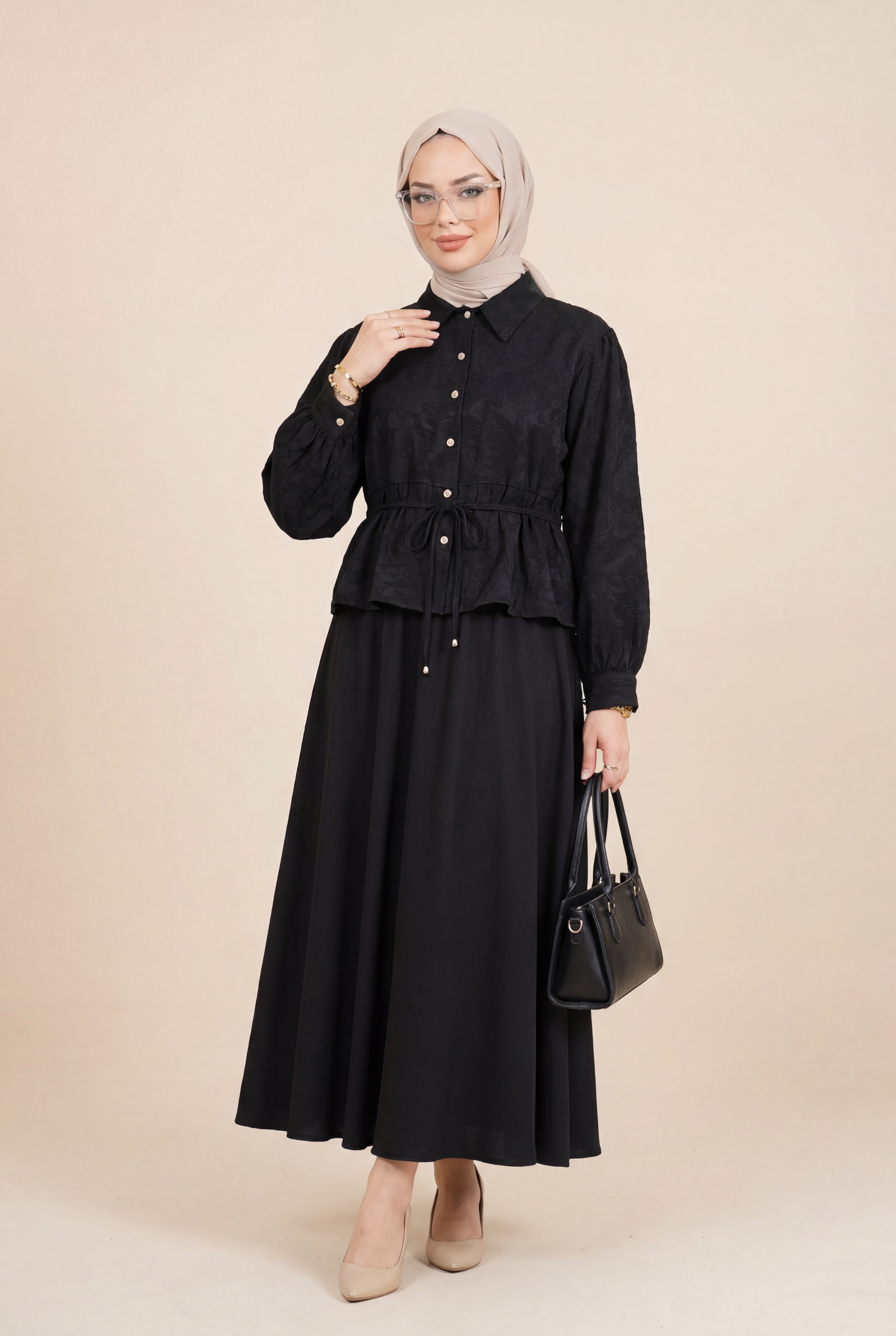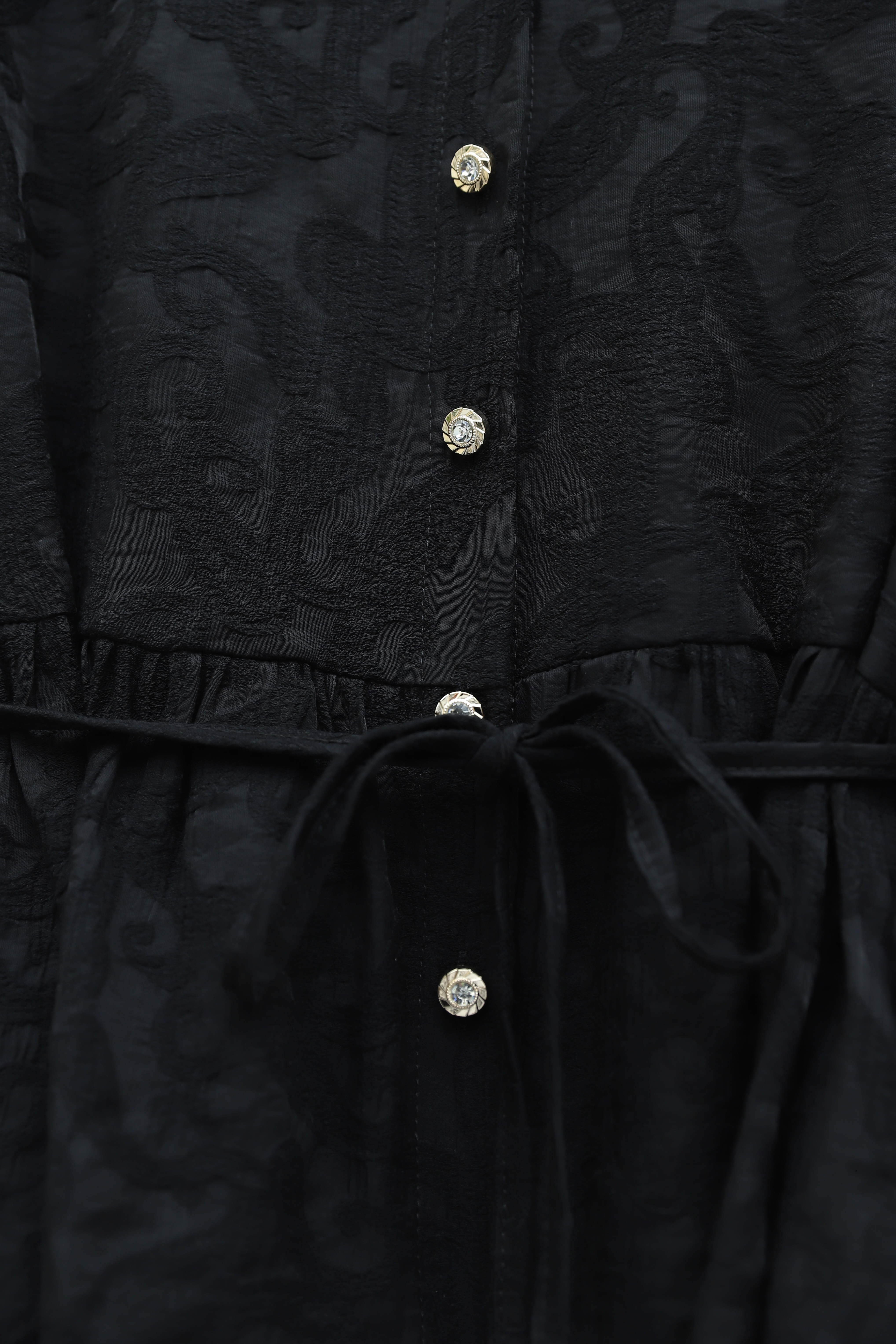Taşlı Düğmeli Beli Bağlamalı Etekli Jakar Takım -Siyah