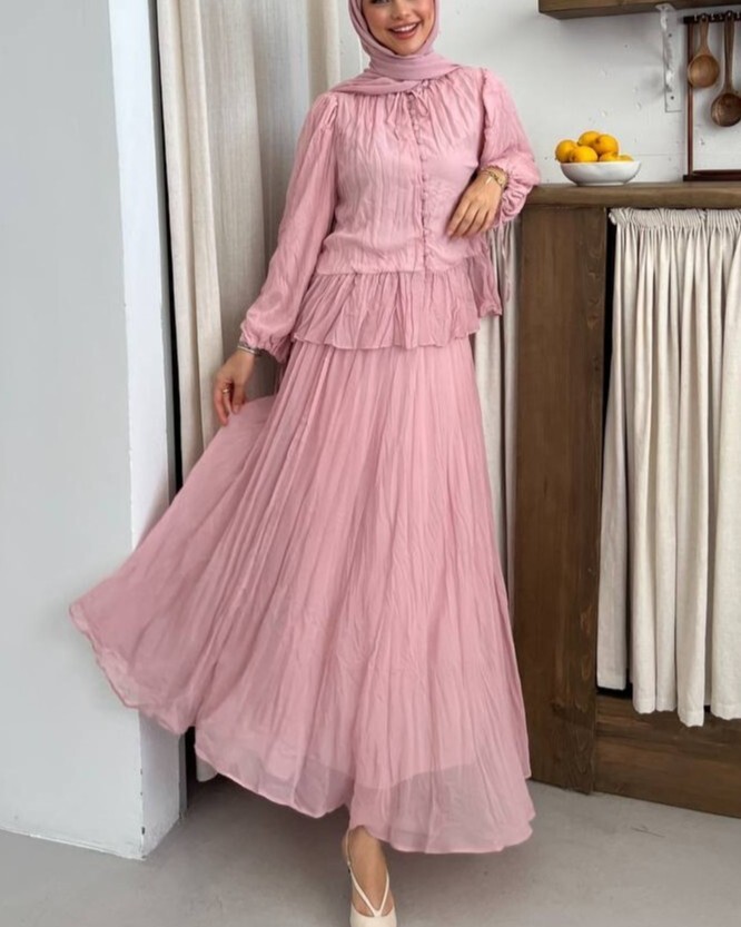 Modern ve romantik detaylarla tasarlanan bu takım, fırfırlı yaka ve düğme detaylarıyla zarafeti ön plana çıkarıyor. Hafif ve dökümlü şifon kumaşı sayesinde gün boyu konfor sunarken, kraş etek tasarımı ile stilinize hareket katıyor. Özel günlerde, davetlerde ya da günlük şıklığınızda fark yaratmak için ideal bir tercih!