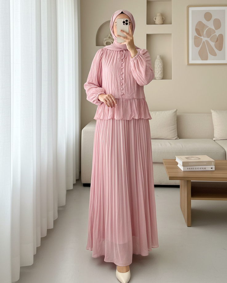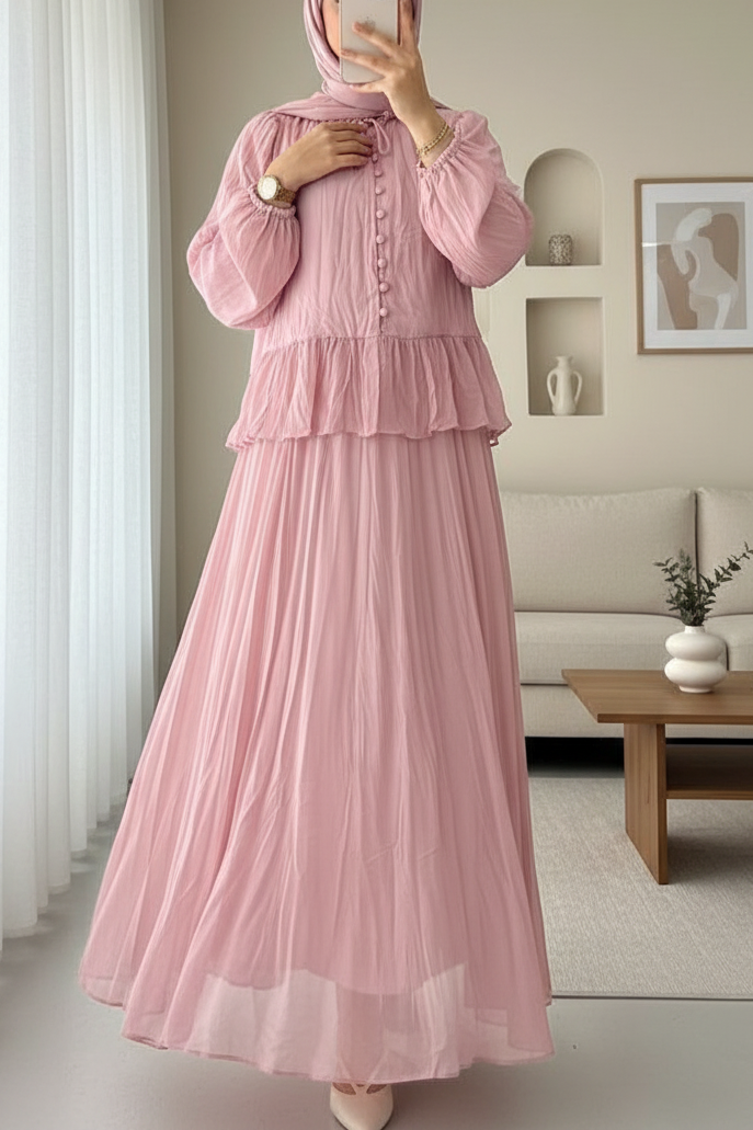 Şıklığın Zarif Hâli: Yakası Fırfırlı Düğmeli Şifon Kraş Etekli Takım