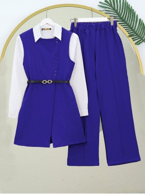 Kemerli Düğmeli Uzun Yelek-Pantolon Takım -Saks