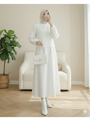 Önü Fiyonk Detaylı Etekli Scuba Takım -Beyaz