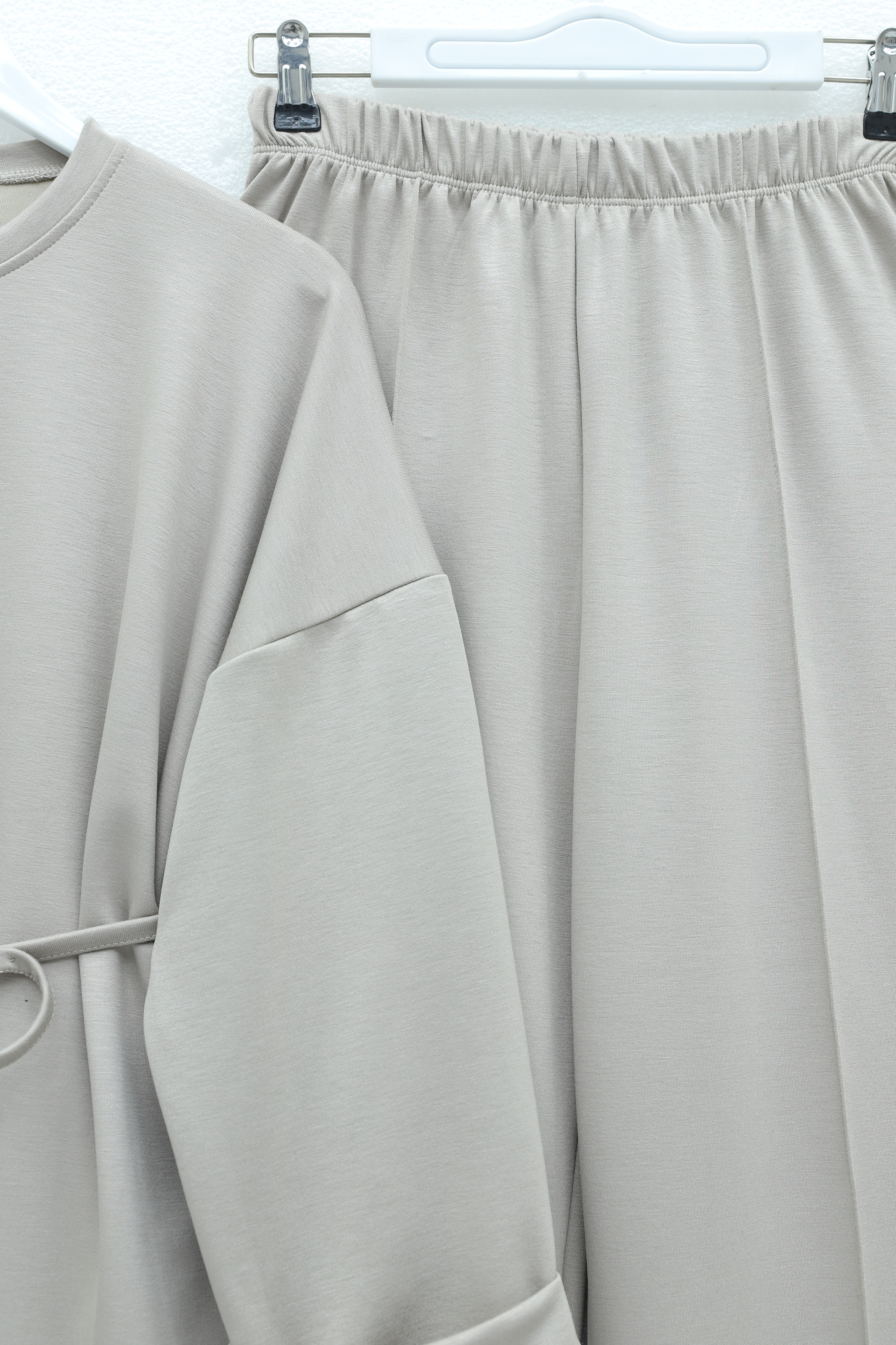 Yırtmaçlı Beli Bağcıklı Kolu Katlamalı Pantolonlu Oyşo Takım -Taş