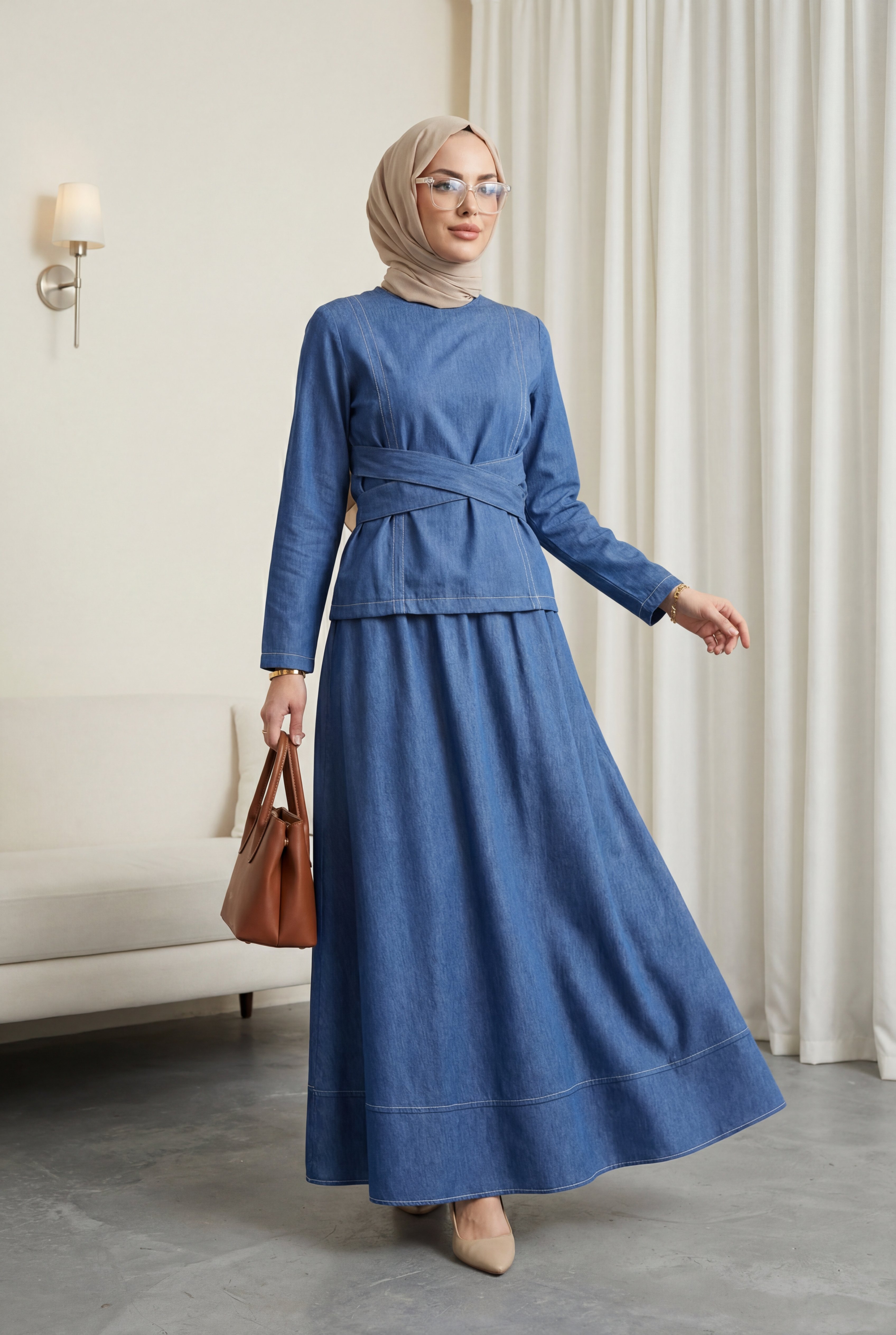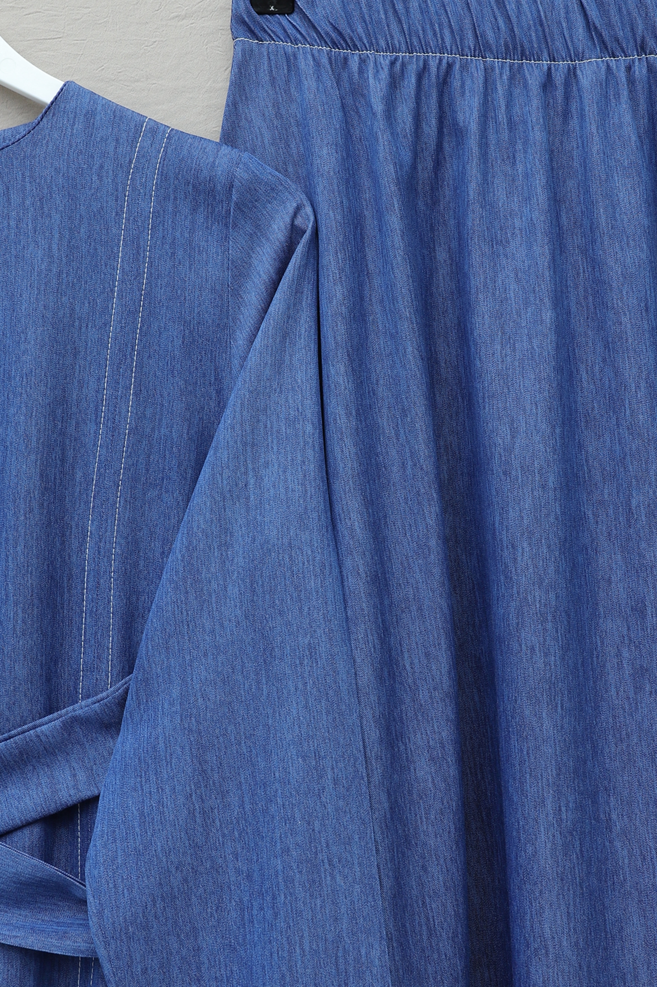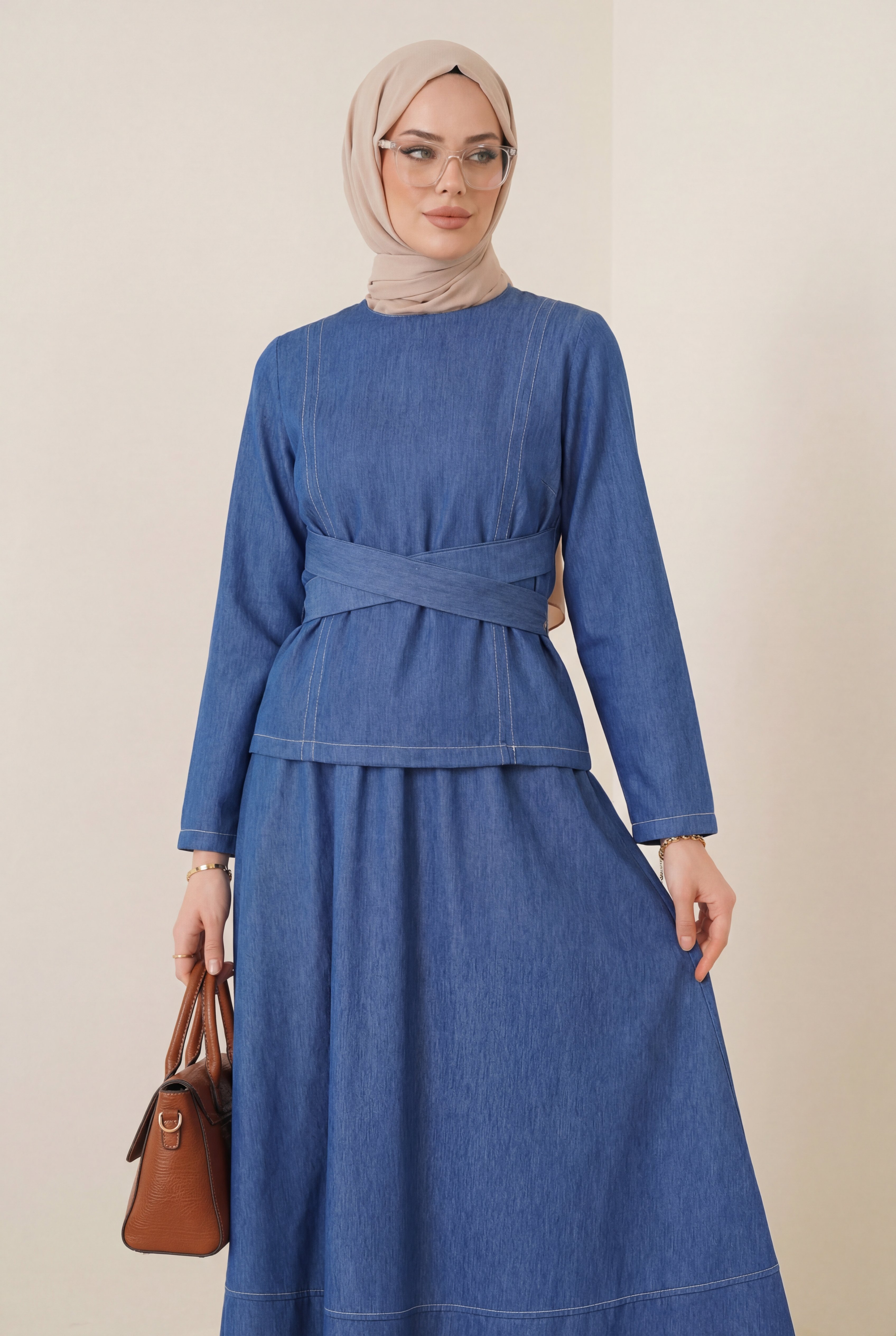 Yuvarlak Yaka Beli Çapraz Bağcıklı Etekli Tensel Takım, rahat ve feminen bir stil sunar. Yuvarlak yaka tasarımı sade bir görünüm sağlarken, çapraz bağcık detayı beli zarif şekilde vurgular. Etekli formu akışkan bir siluet oluşturur. Tensel kumaşı hafif ve nefes alabilendir. Vücuda oturan fakat sıkmayan ideal kalıbı ile konforlu bir duruş sunar.