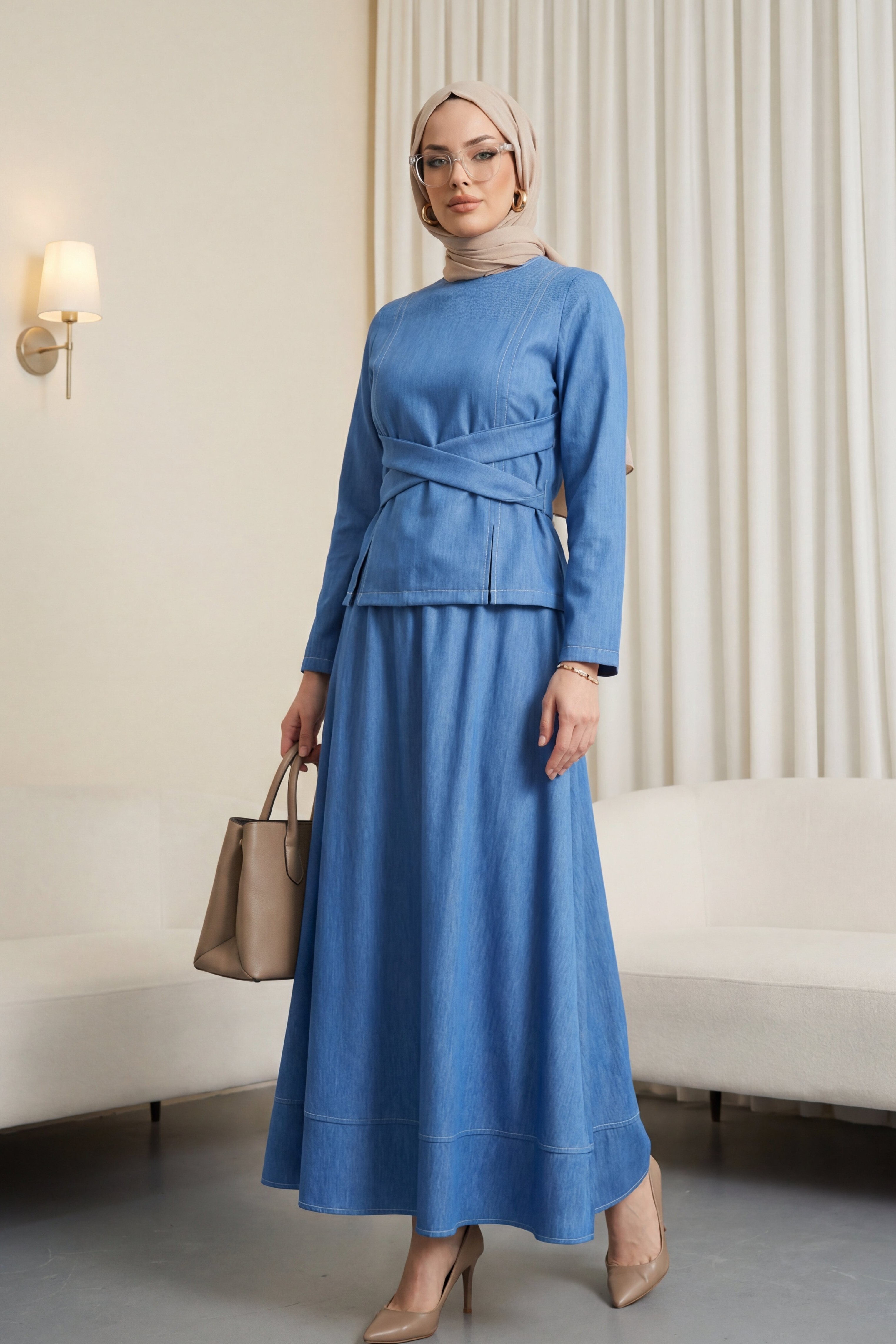 Yuvarlak Yaka Beli Çapraz Bağcıklı Etekli Tensel Takım, rahat ve feminen bir stil sunar. Yuvarlak yaka tasarımı sade bir görünüm sağlarken, çapraz bağcık detayı beli zarif şekilde vurgular. Etekli formu akışkan bir siluet oluşturur. Tensel kumaşı hafif ve nefes alabilendir. Vücuda oturan fakat sıkmayan ideal kalıbı ile konforlu bir duruş sunar.