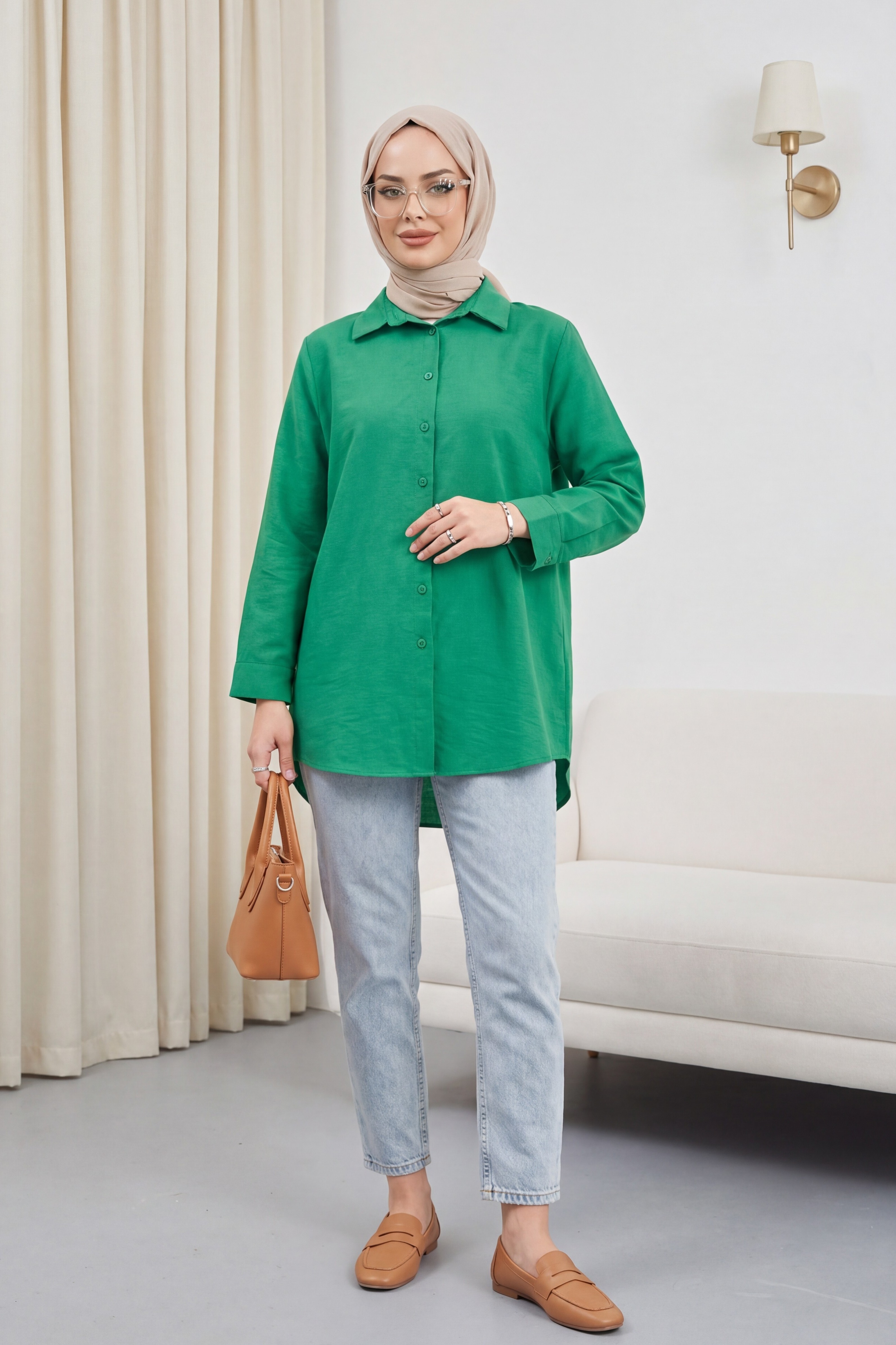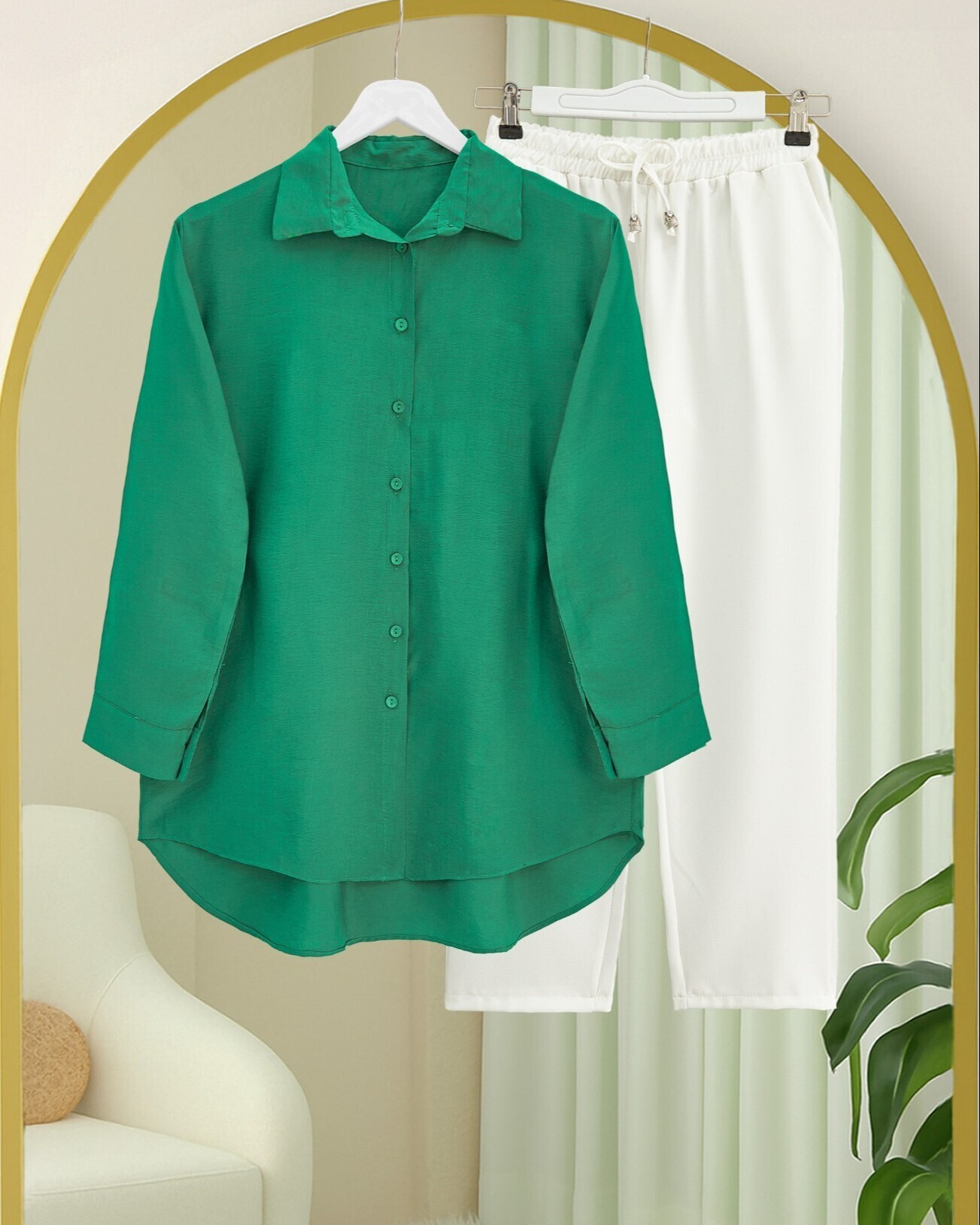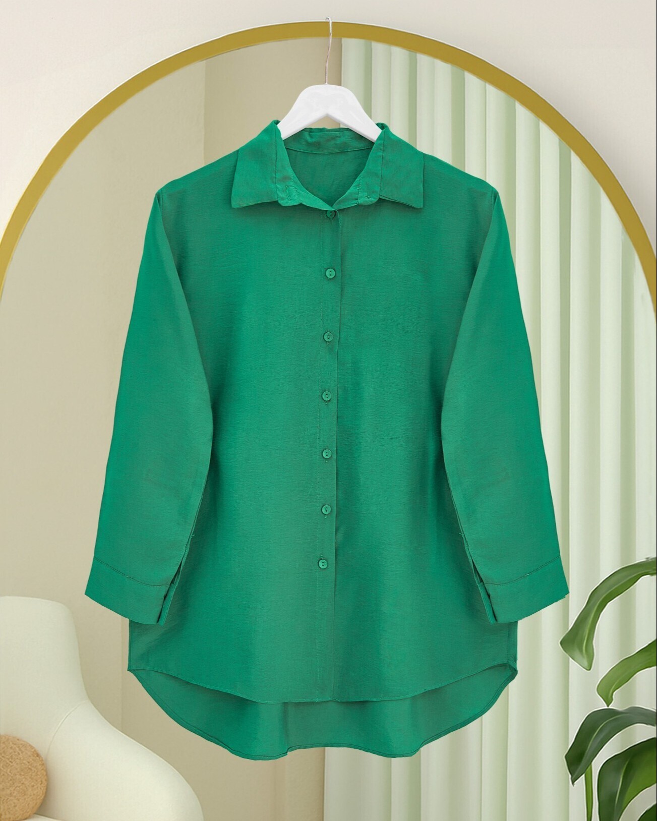 Arkası Uzun Düğmeli Poplin Gömlek -Yeşil