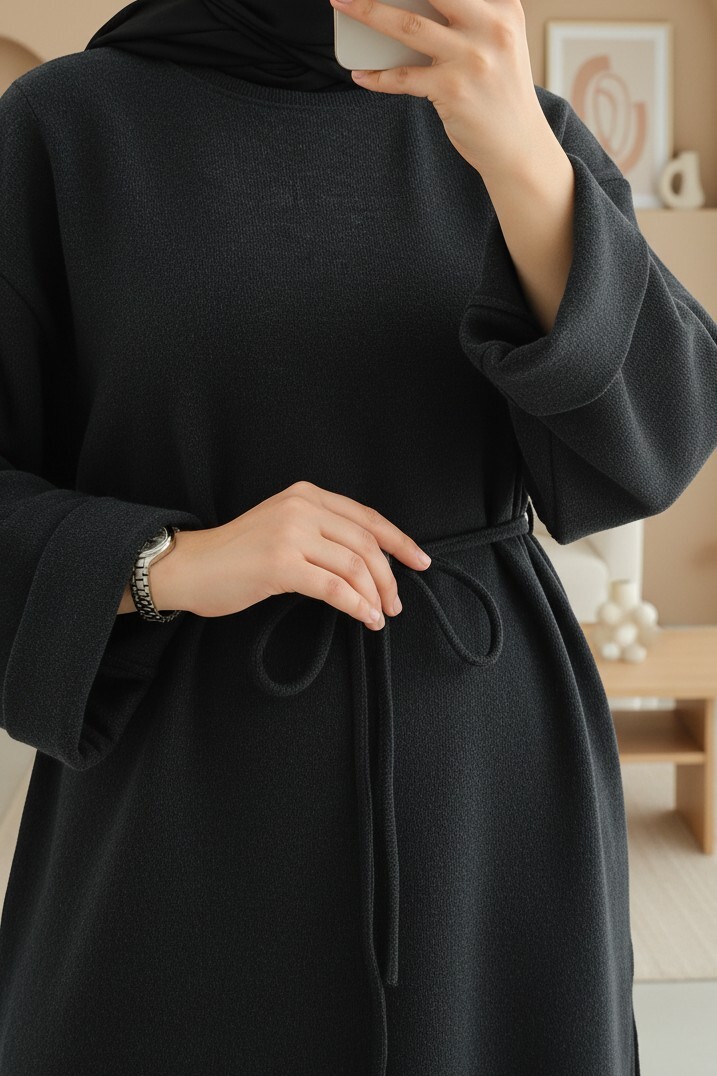 Kolu Katlı Beli Bağlamalı Yırtmaçlı Selanik Tunik-Antrasit