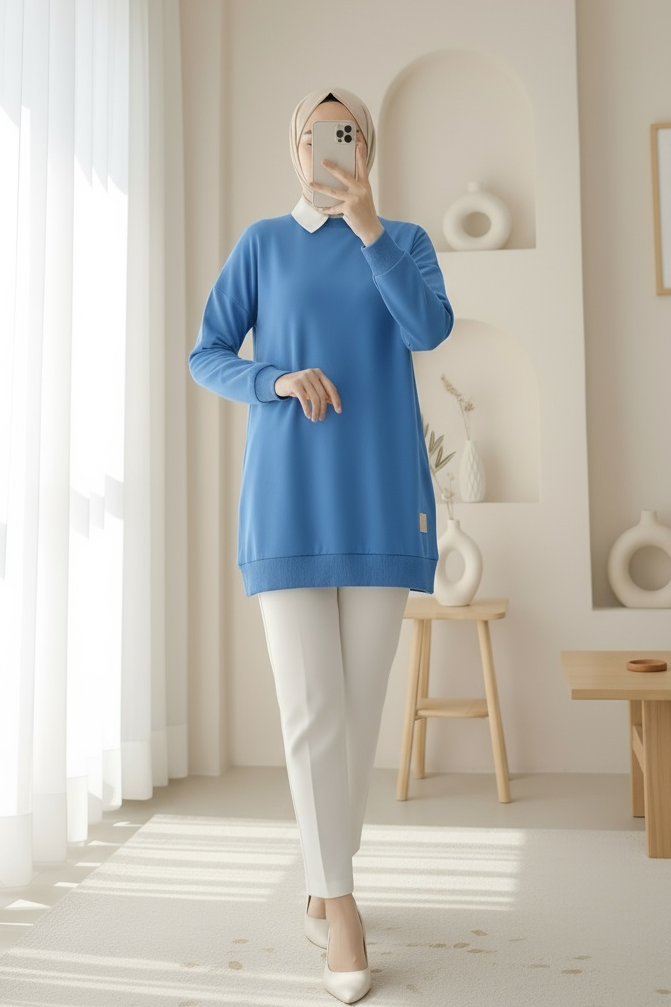Bisiklet Yaka Yırtmaçlı Armalı Sweat -Mavi