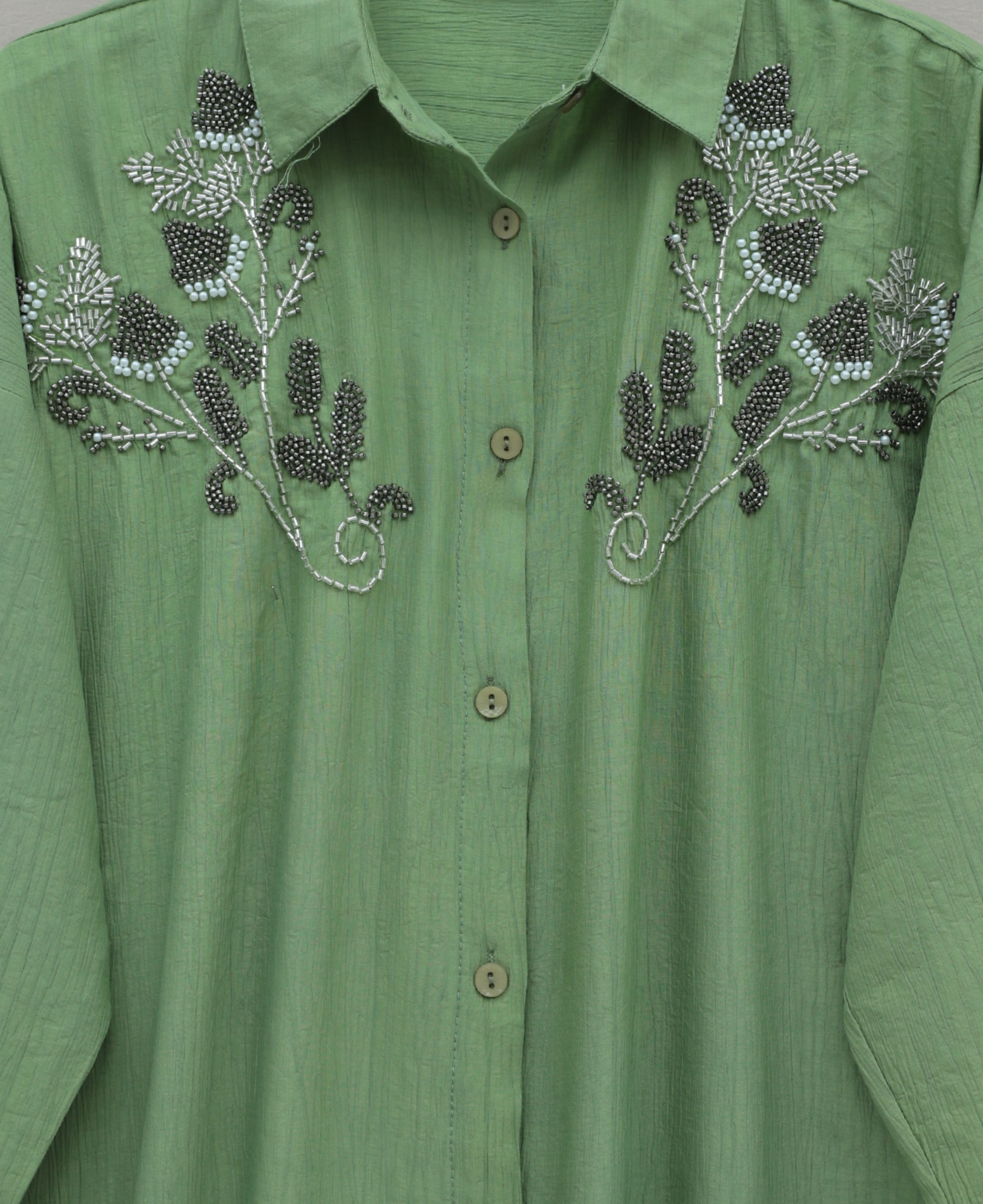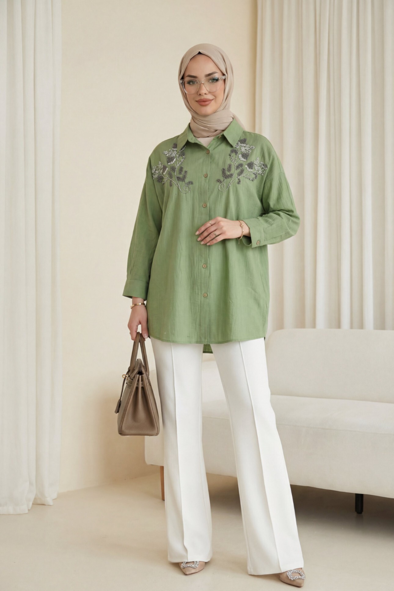“Desenli kadın gömlek”, “çiçekli düğmeli gömlek”, “boncuk detaylı gömlek”, “şık günlük gömlek modeli” gibi adlandırılabilir.