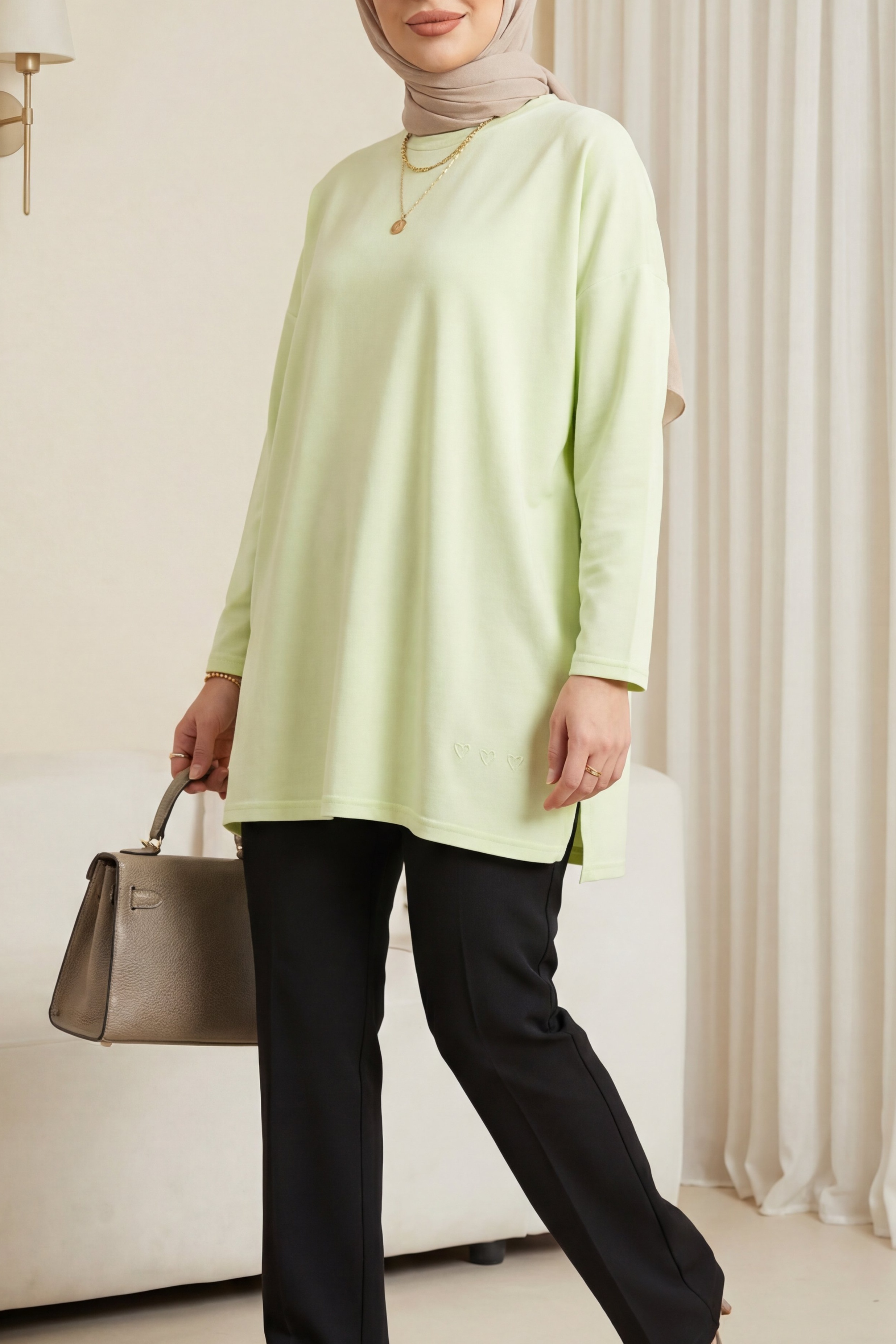 “Kalp detaylı tunik”, “yırtmaçlı penye tunik”, “salaş kadın tunik”, “günlük rahat tunik modeli” gibi adlandırılabilir.