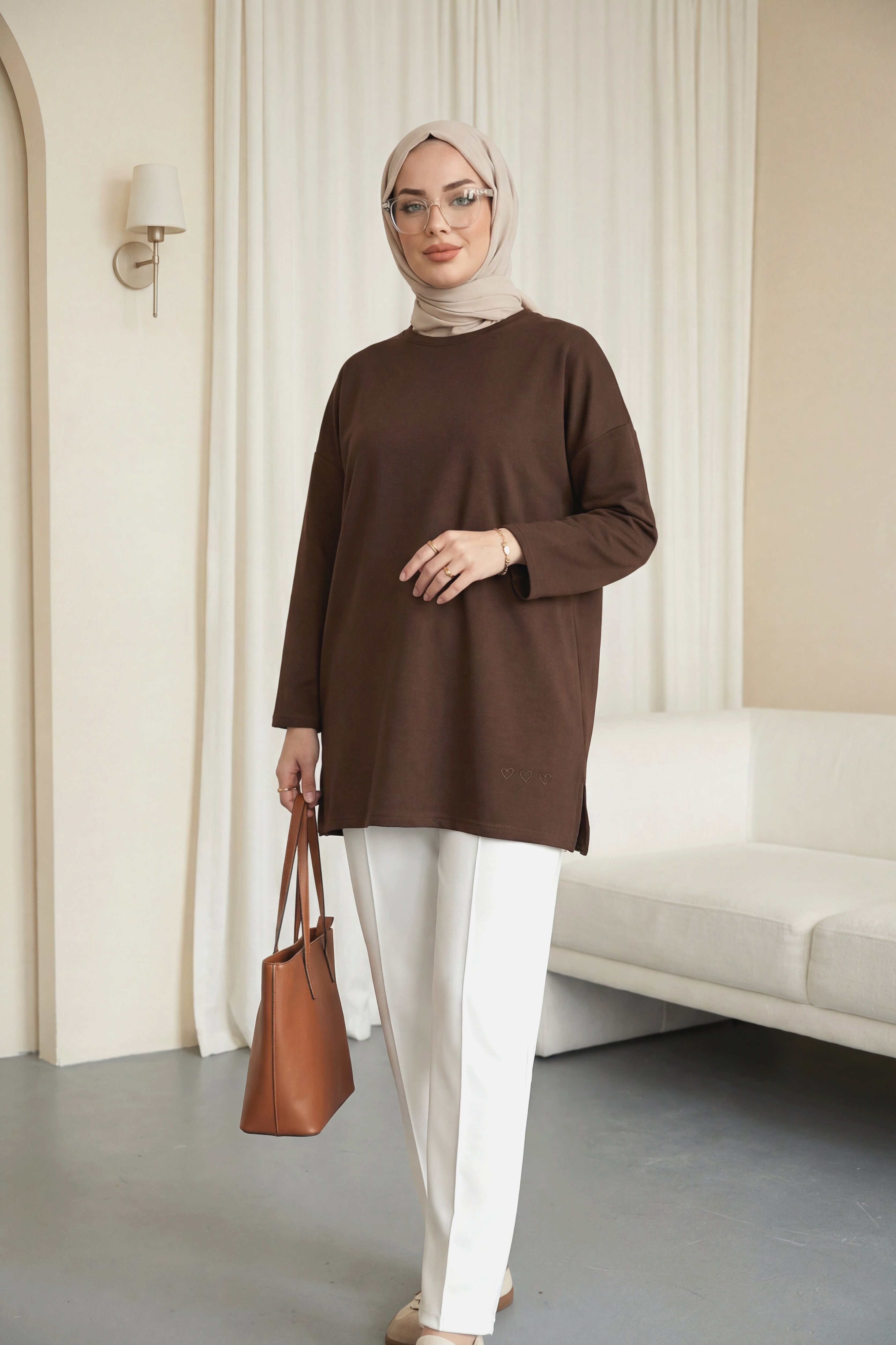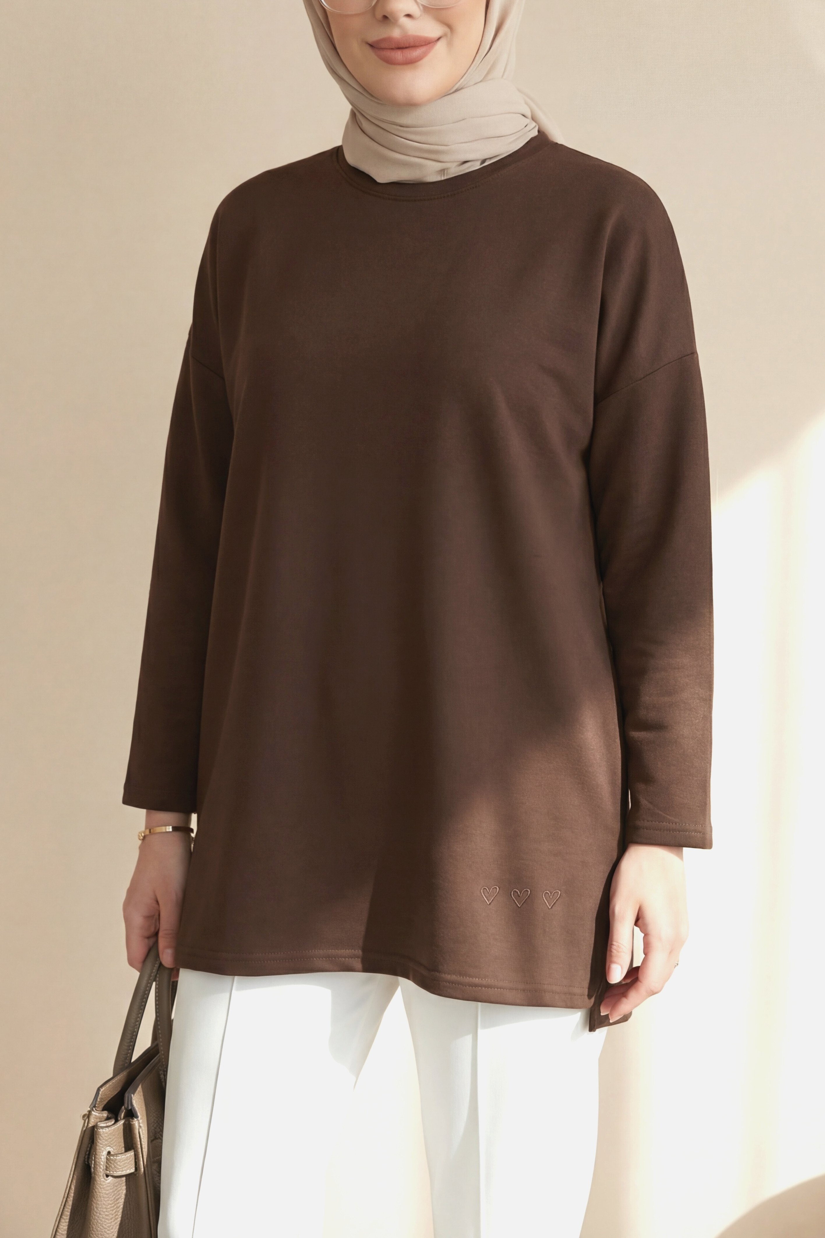 Eteği Kalp Detaylı Yırtmaçlı Salaş Penye Tunik -Kahve