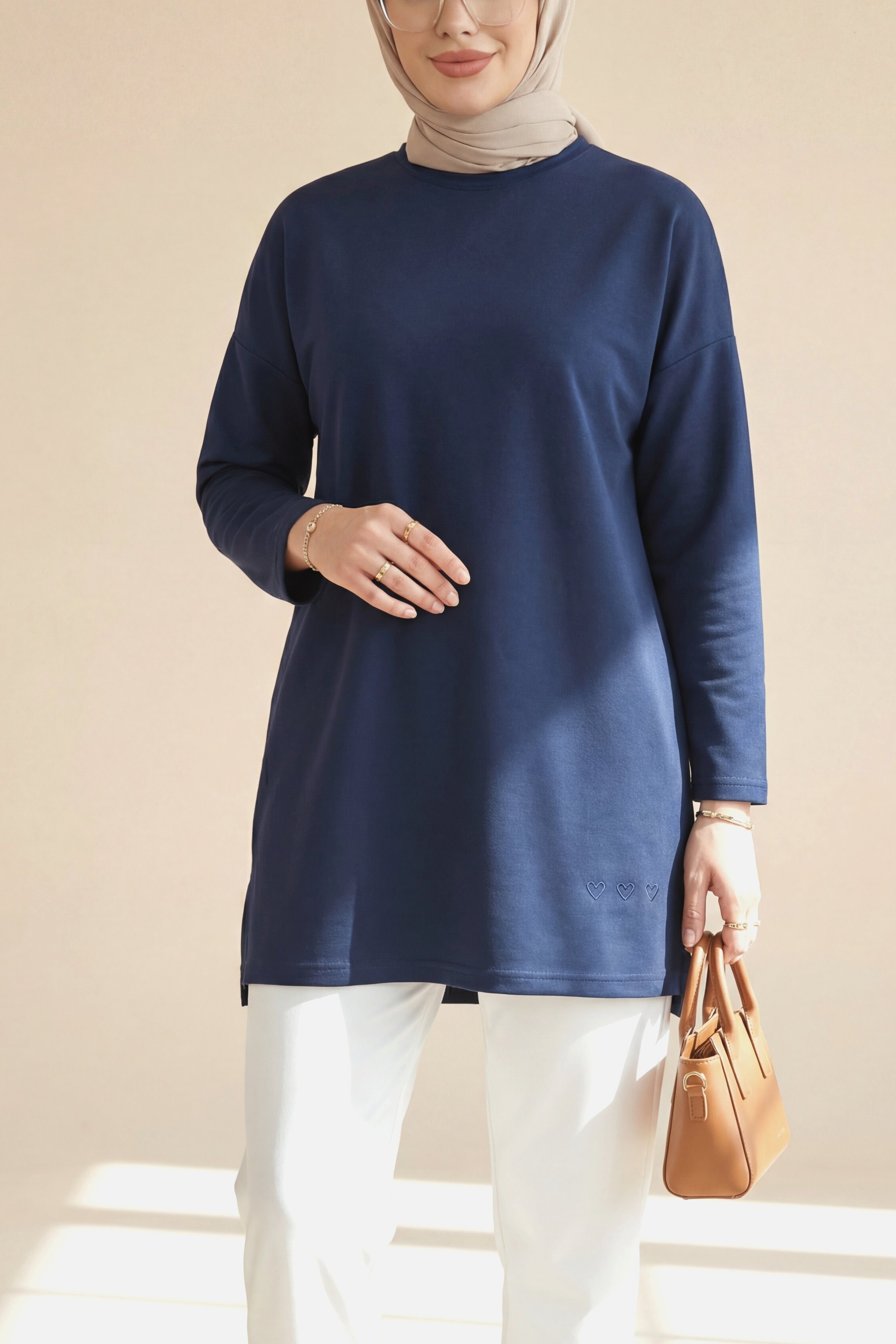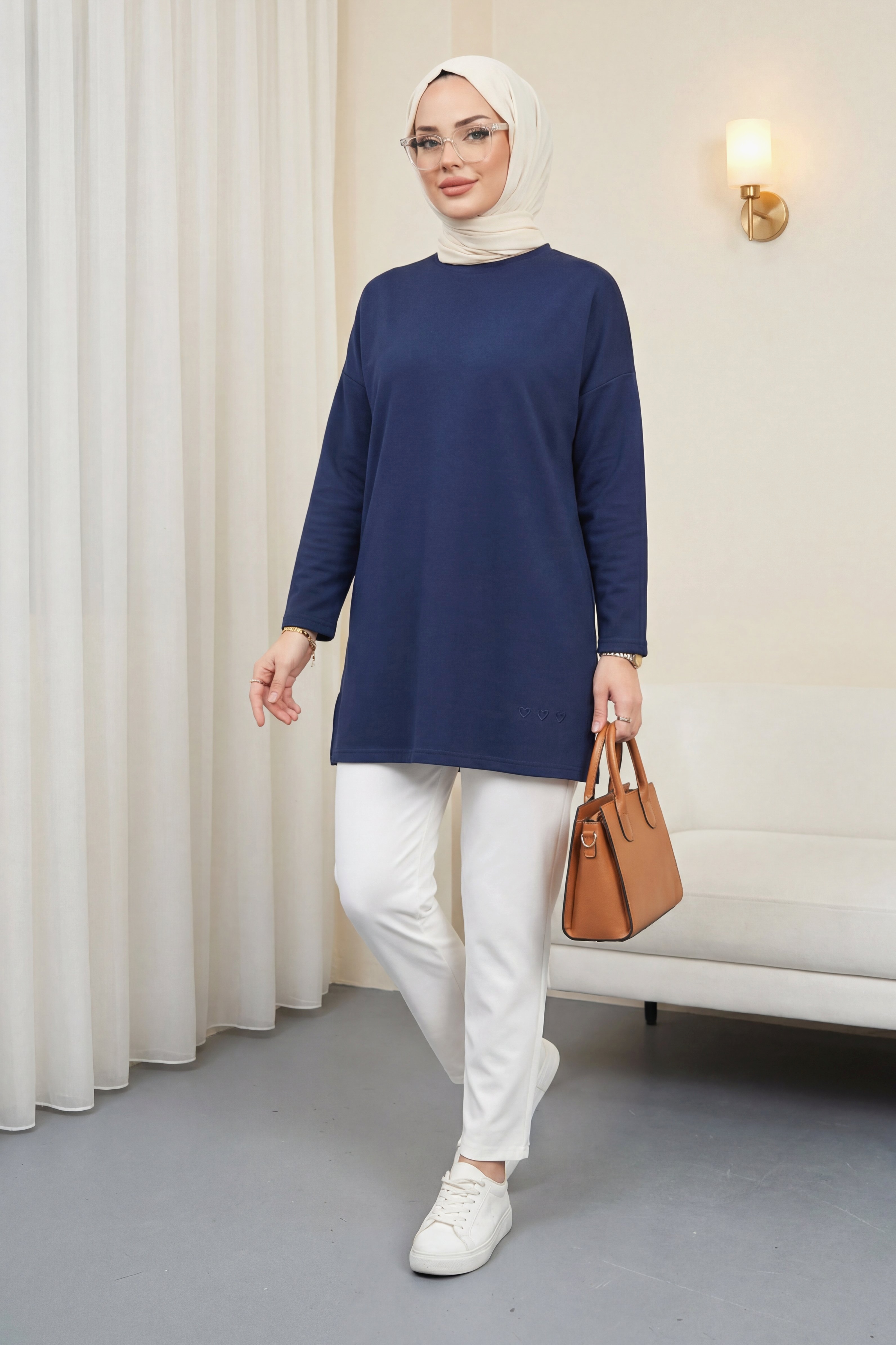 Eteği Kalp Detaylı Yırtmaçlı Salaş Penye Tunik, rahat ve enerjik bir stil sunar. Etek kısmındaki kalp detayı tasarıma hareket katarken, yırtmaç formu modern bir görünüm sağlar. Salaş kesimi gün boyu konfor sunar. Penye kumaşı yumuşak ve nefes alabilendir. Vücuda oturan fakat sıkmayan ideal kalıbı ile dengeli bir duruş sağlar.