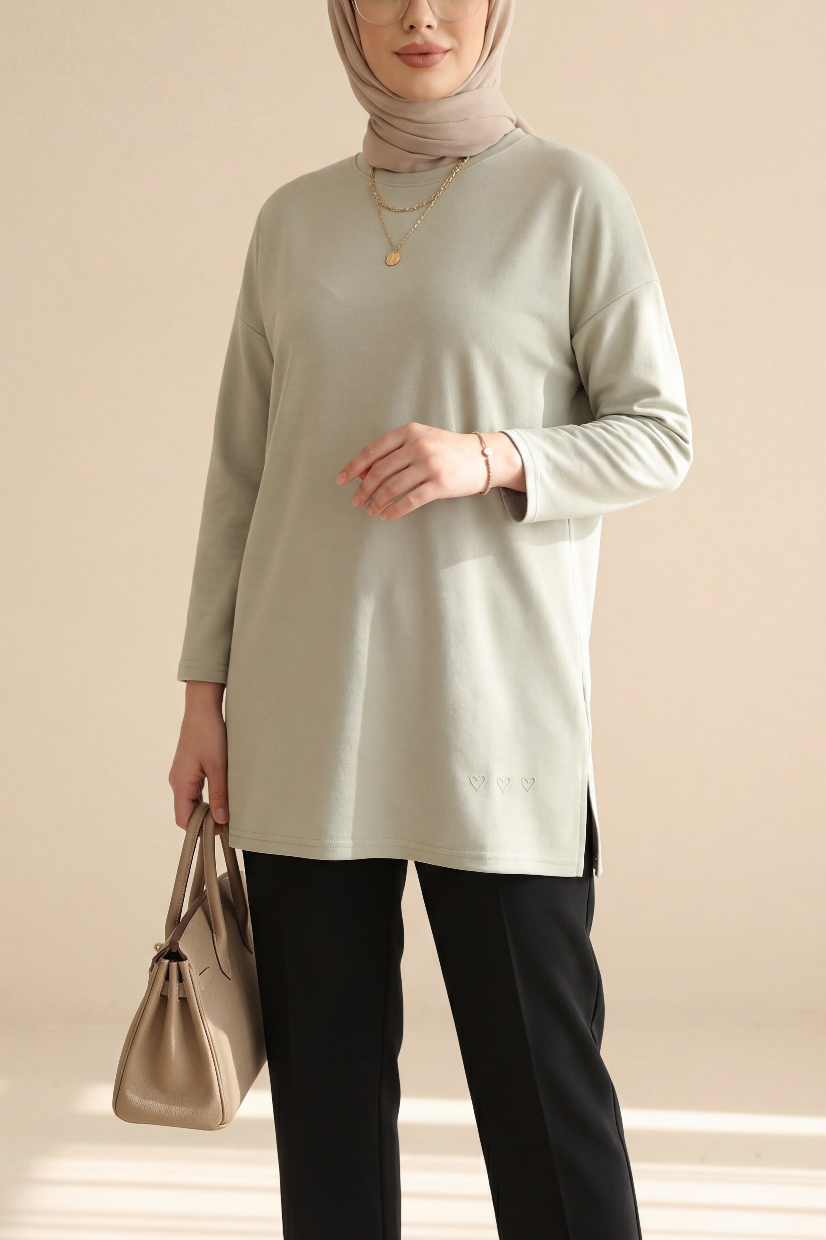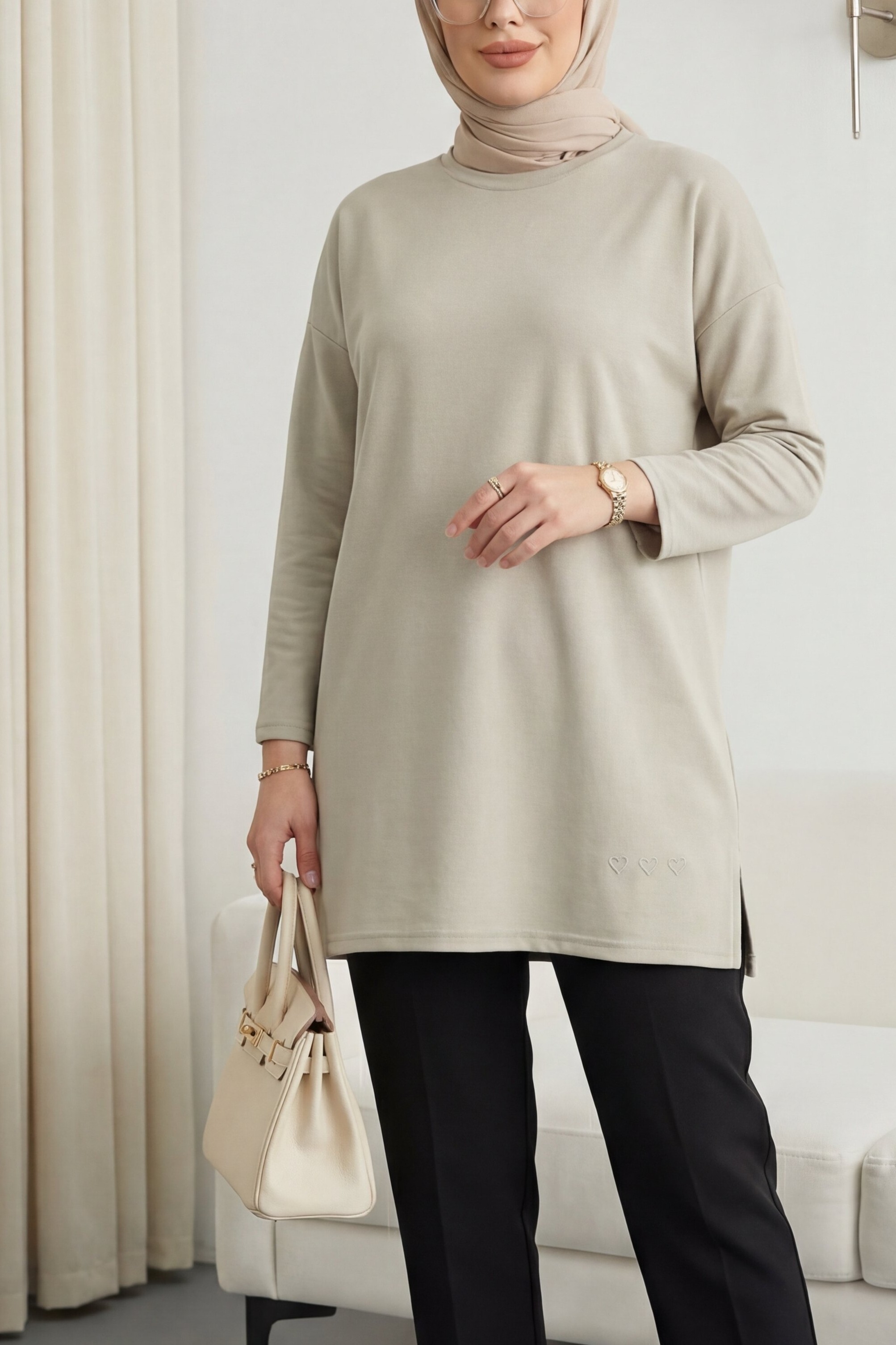 Eteği Kalp Detaylı Yırtmaçlı Salaş Penye Tunik, rahat ve enerjik bir stil sunar. Etek kısmındaki kalp detayı tasarıma hareket katarken, yırtmaç formu modern bir görünüm sağlar. Salaş kesimi gün boyu konfor sunar. Penye kumaşı yumuşak ve nefes alabilendir. Vücuda oturan fakat sıkmayan ideal kalıbı ile dengeli bir duruş sağlar.