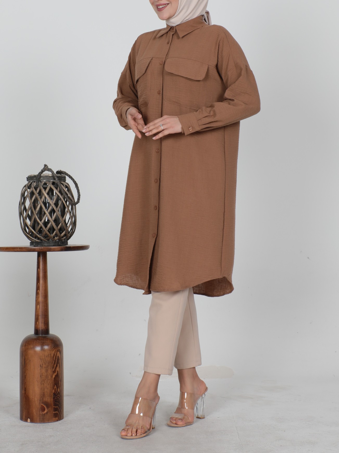 Önden düğmeli, 2 cepli, düşük omuz, salaş tunik modelimiz yeni sezonun en çok sevilen modelleri arasında yer almaktadır.
