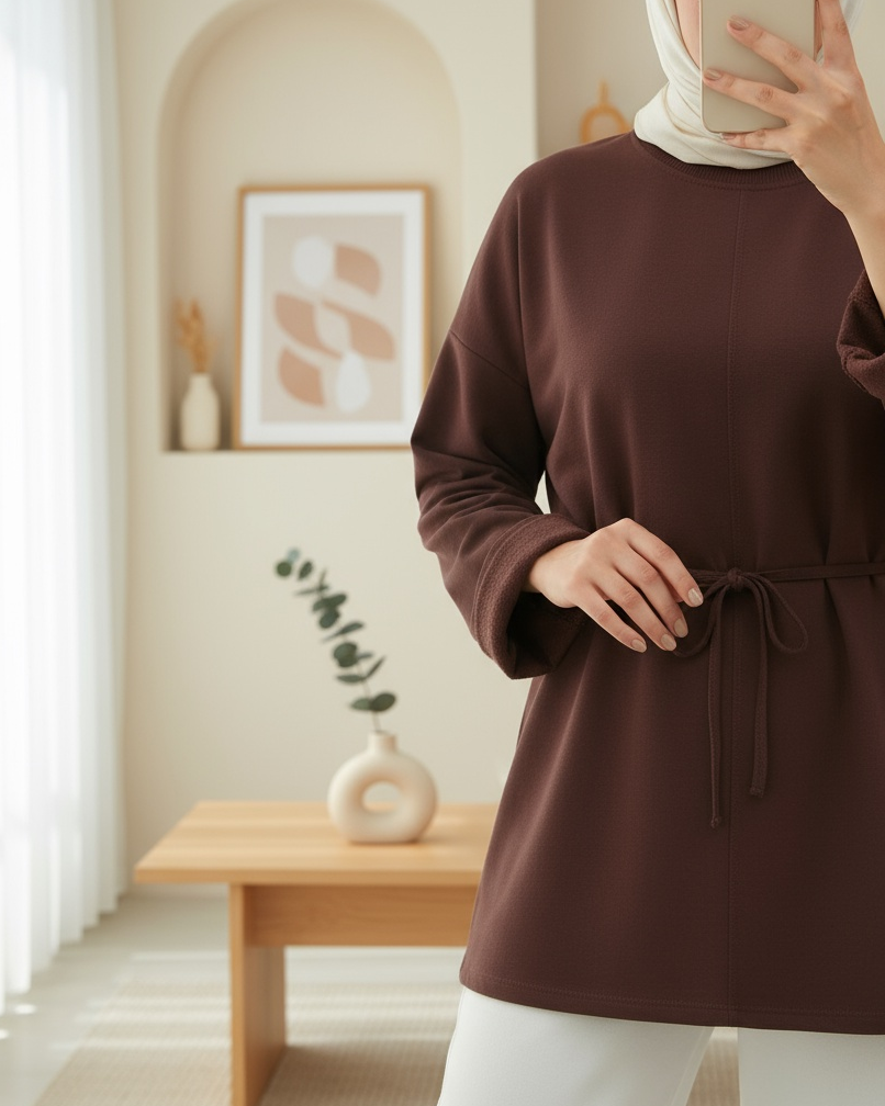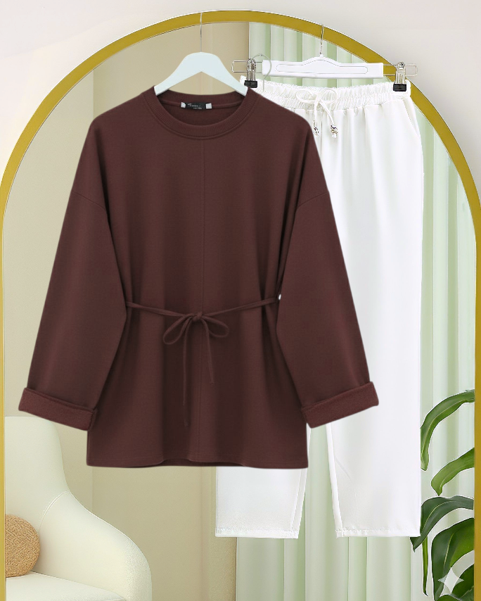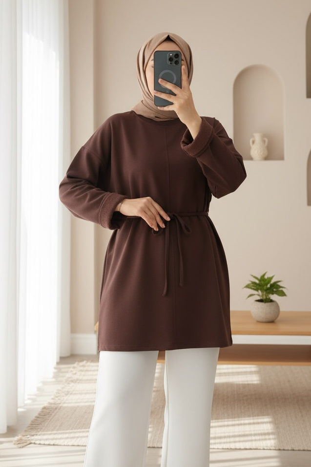 Kolu Katlı Beli Bağlamalı Yırtmaçlı Kompakt Penye Tunik -K. Kahve