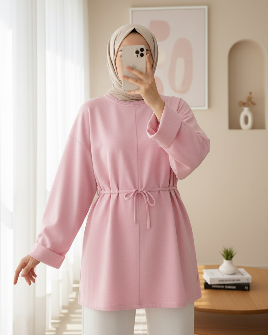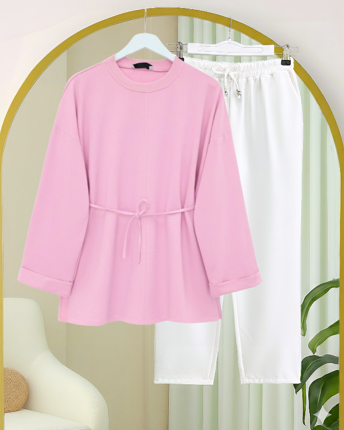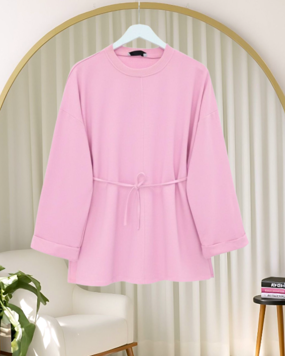 Kolu Katlı Beli Bağlamalı Yırtmaçlı Kompakt Penye Tunik -Pembe