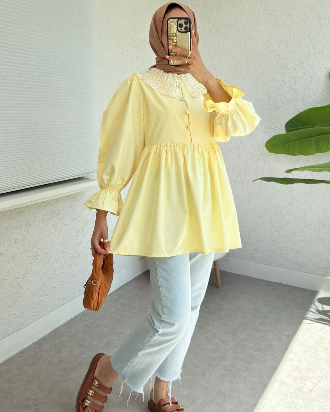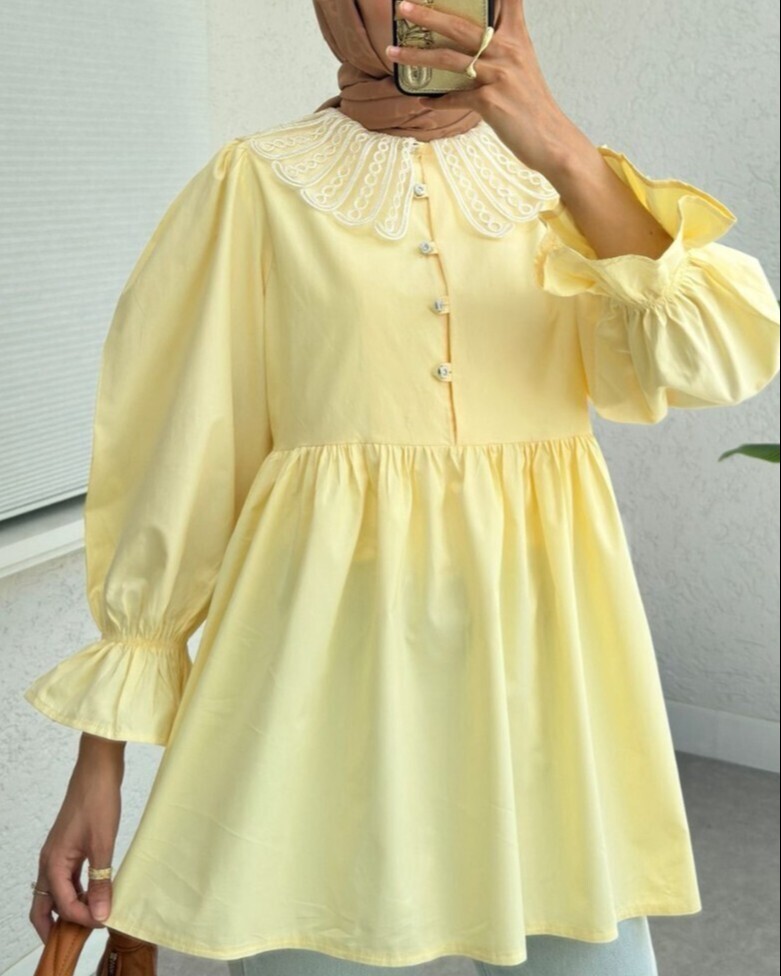 Kolu Lastikli Organze Bebe Yaka Yarım Düğmeli Tunik, zarif organze detayı ve nostaljik bebe yaka tasarımıyla romantik bir stil sunar. Yumuşak dokusu ve rahat kalıbıyla gün boyu konfor sağlar.