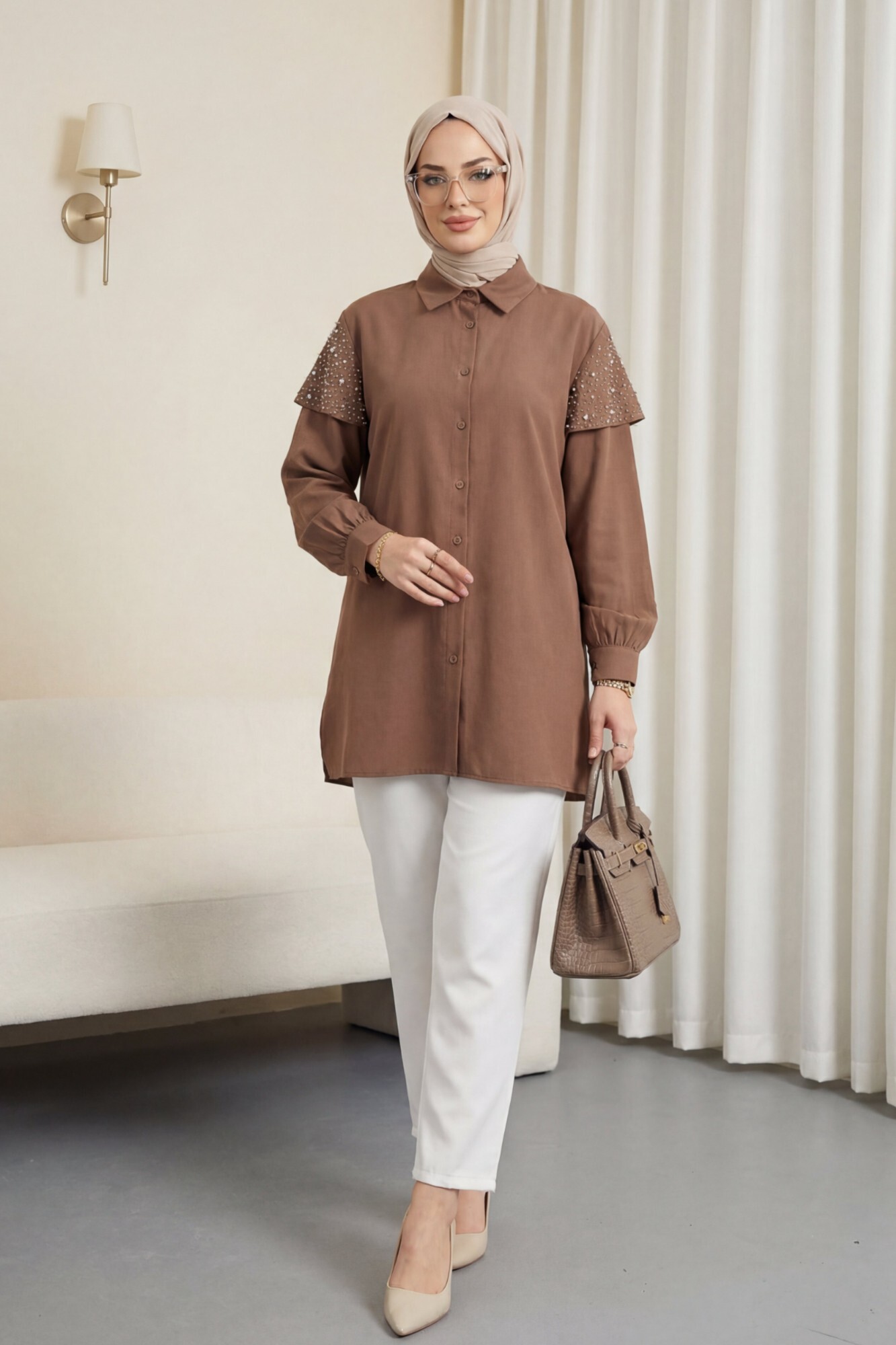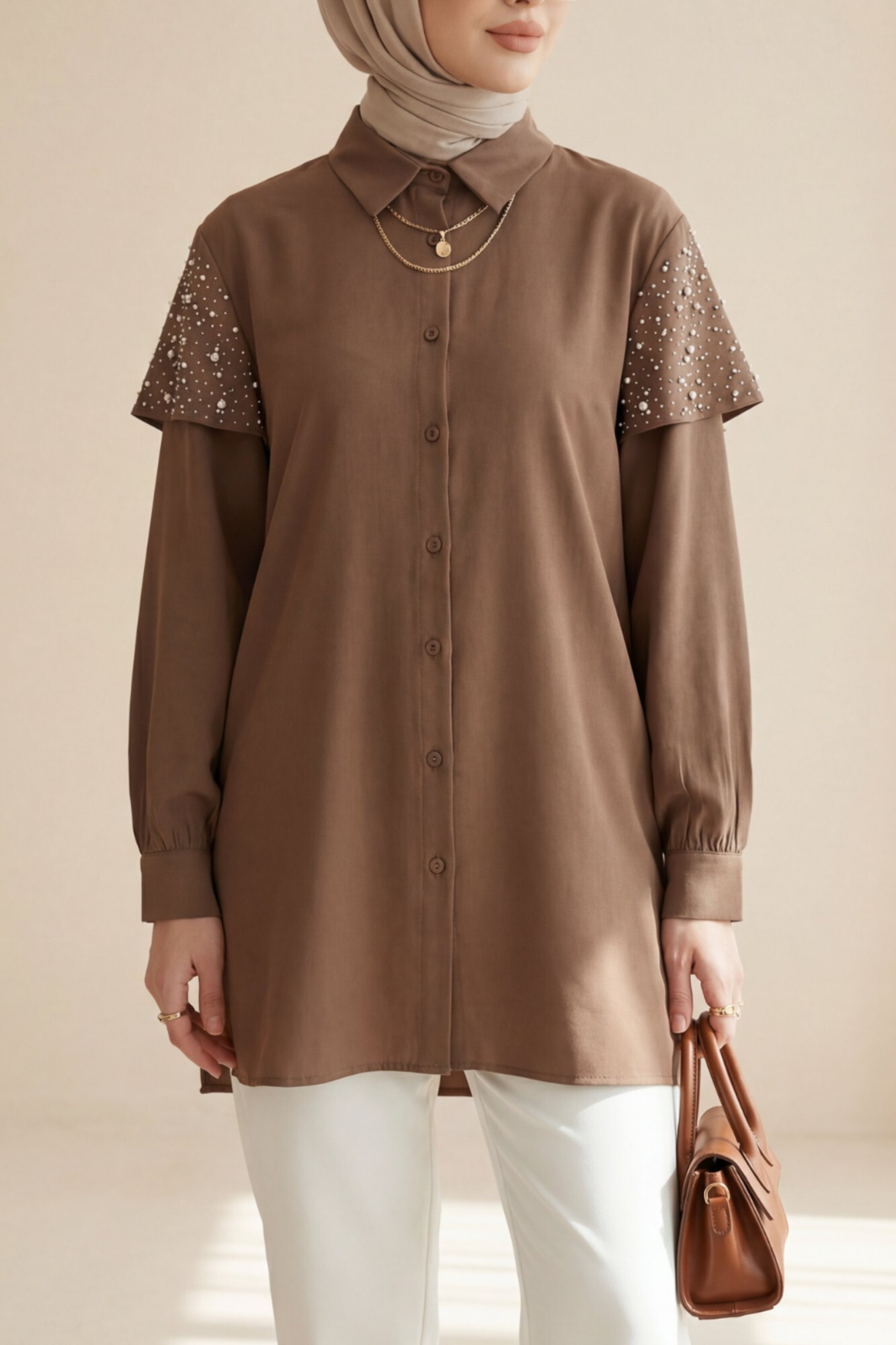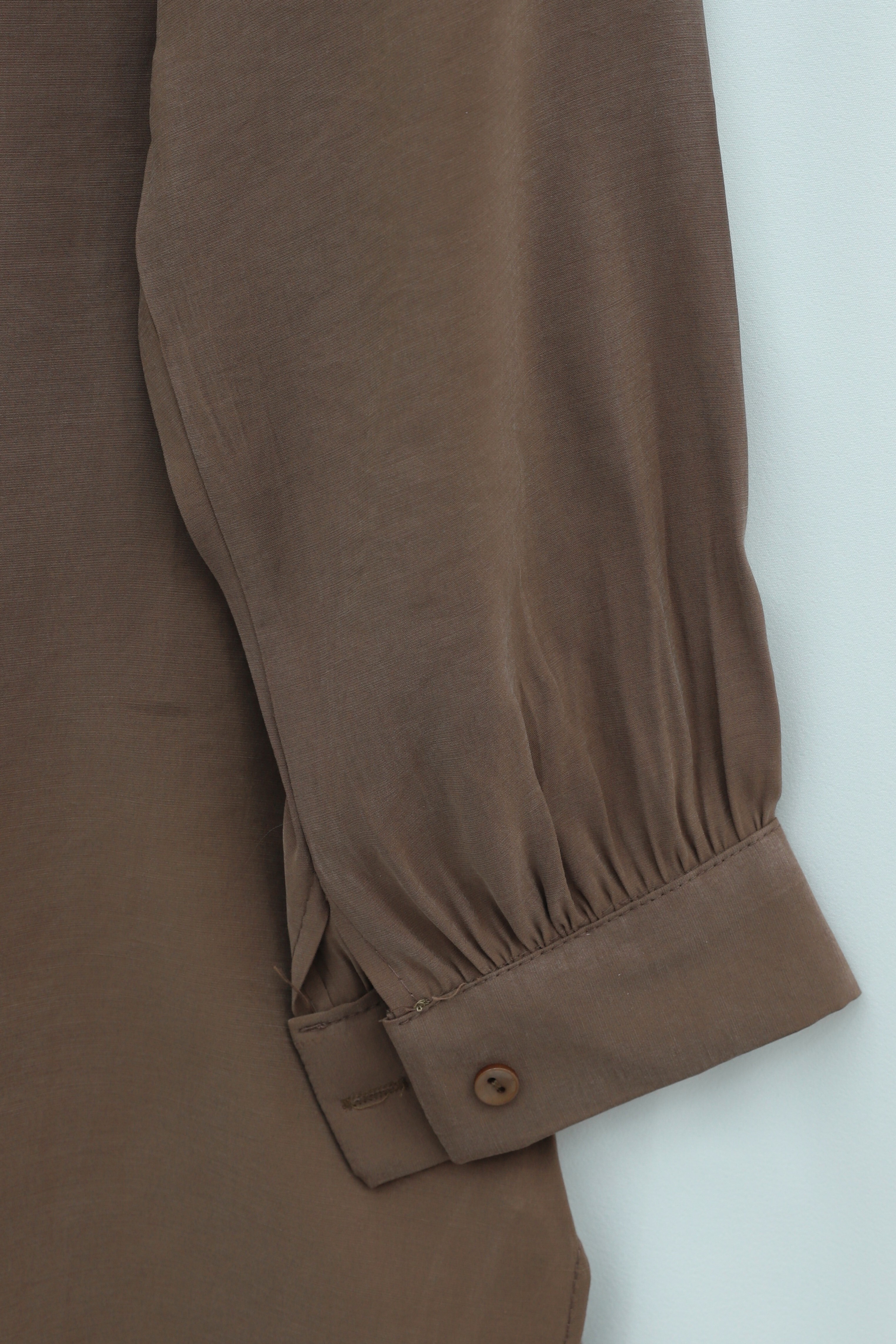 Omuzu Taş Detaylı Yırtmaçlı Düğmeli Cupra Gömlek -Kahve