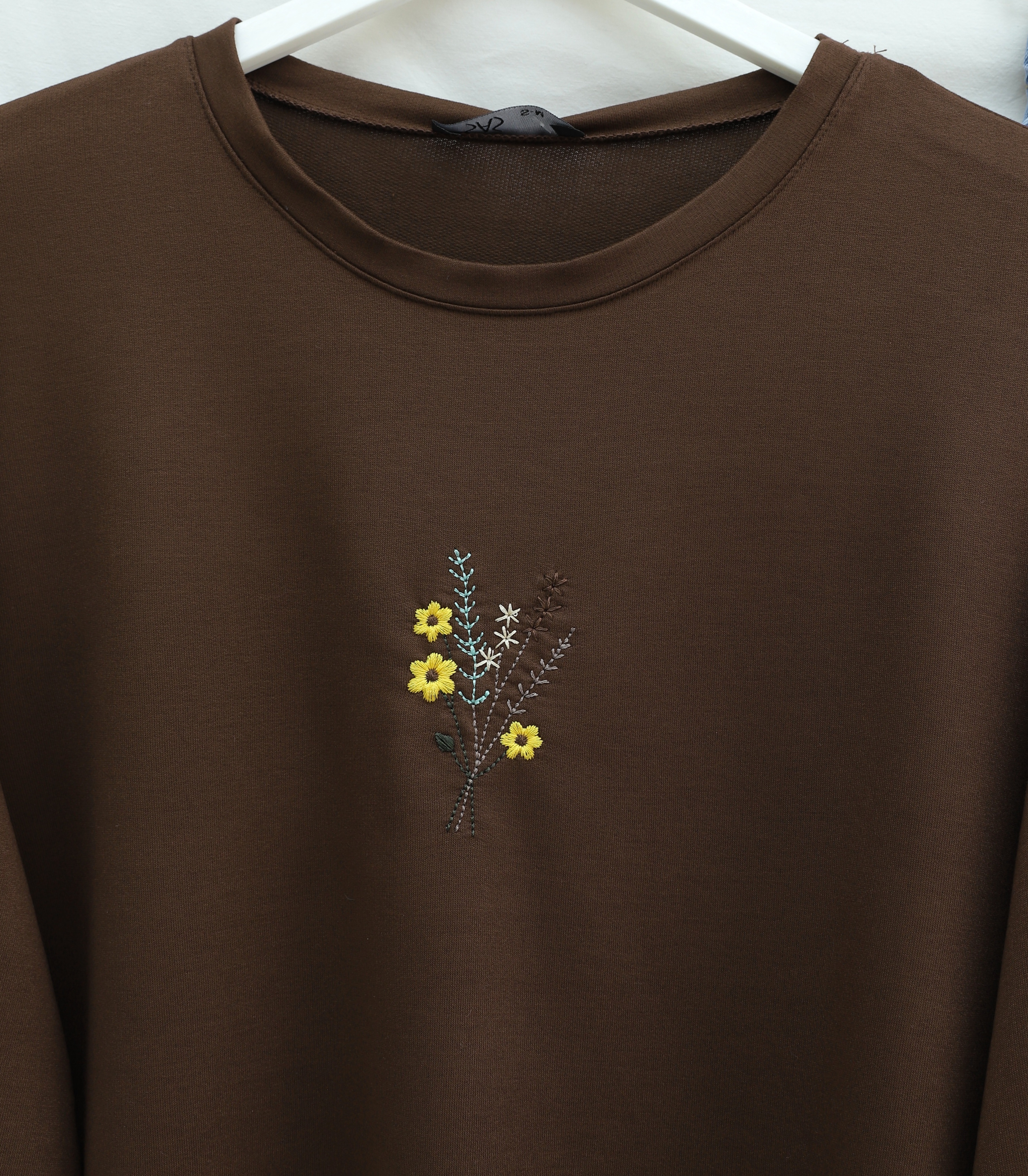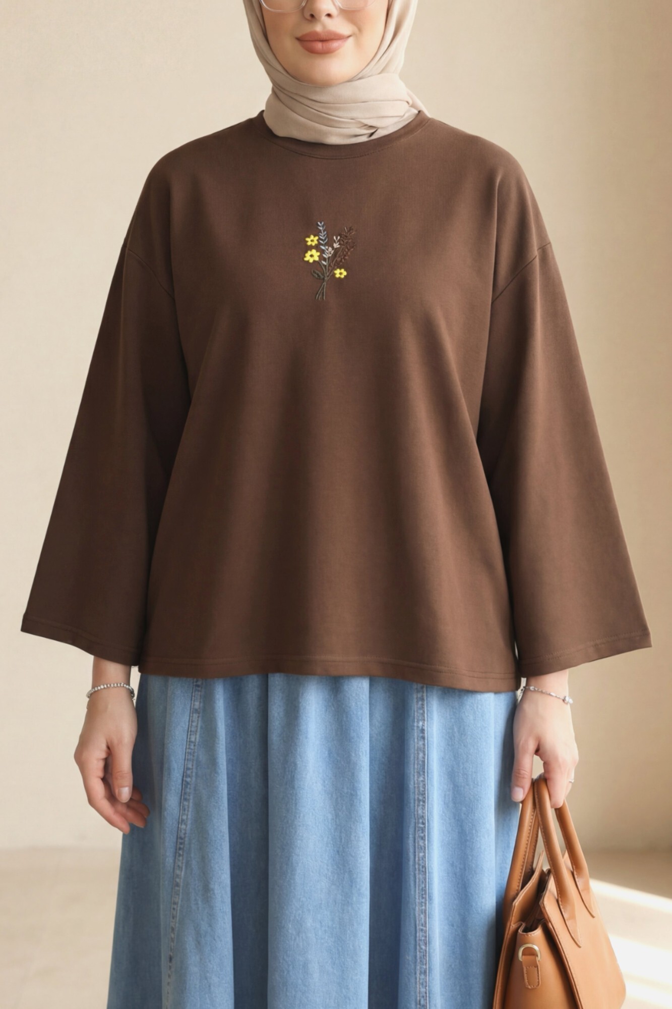 Önü Çiçek Nakışlı Yuvarlak Yaka Salaş Penye Bluz -Kahve