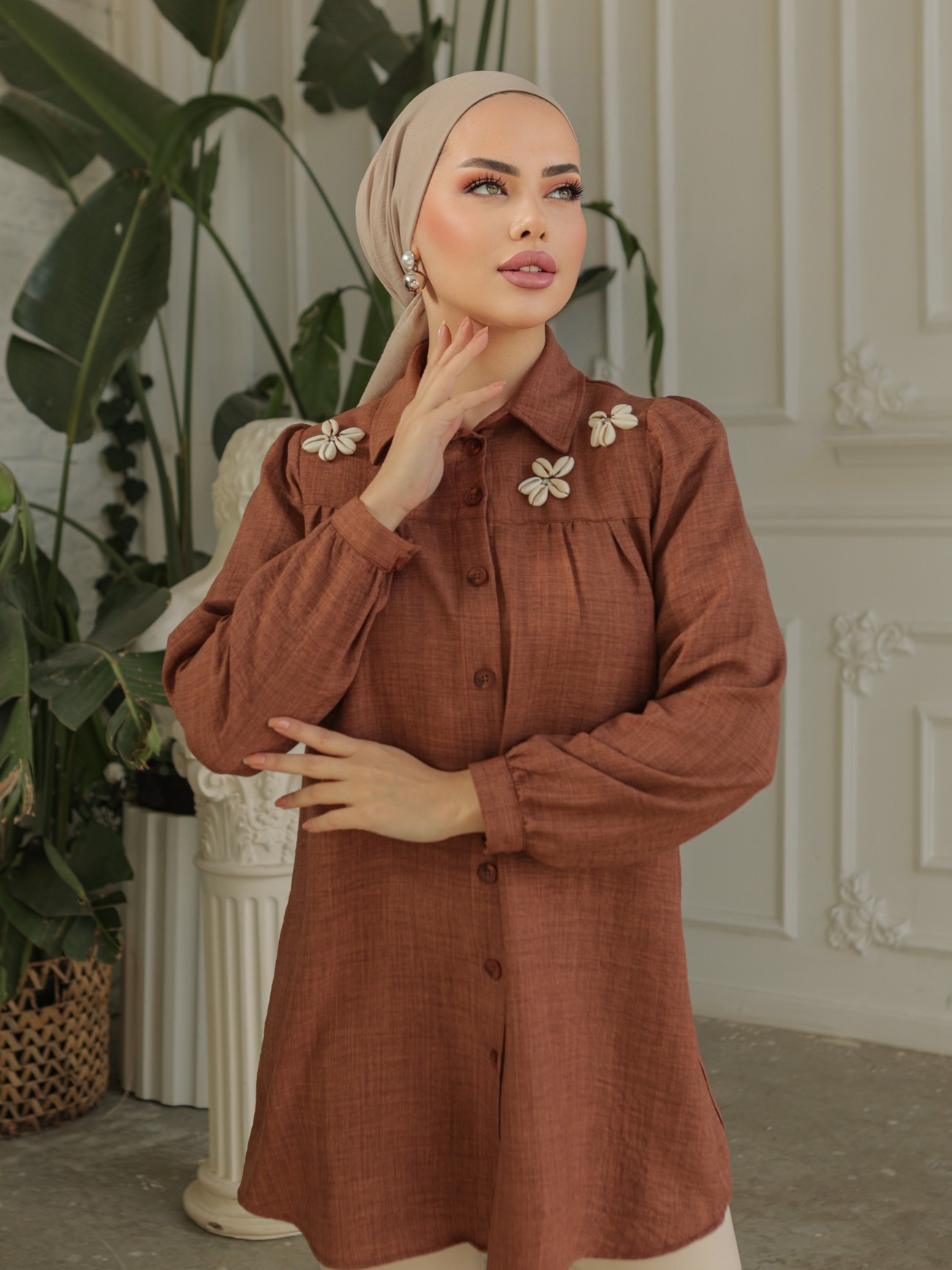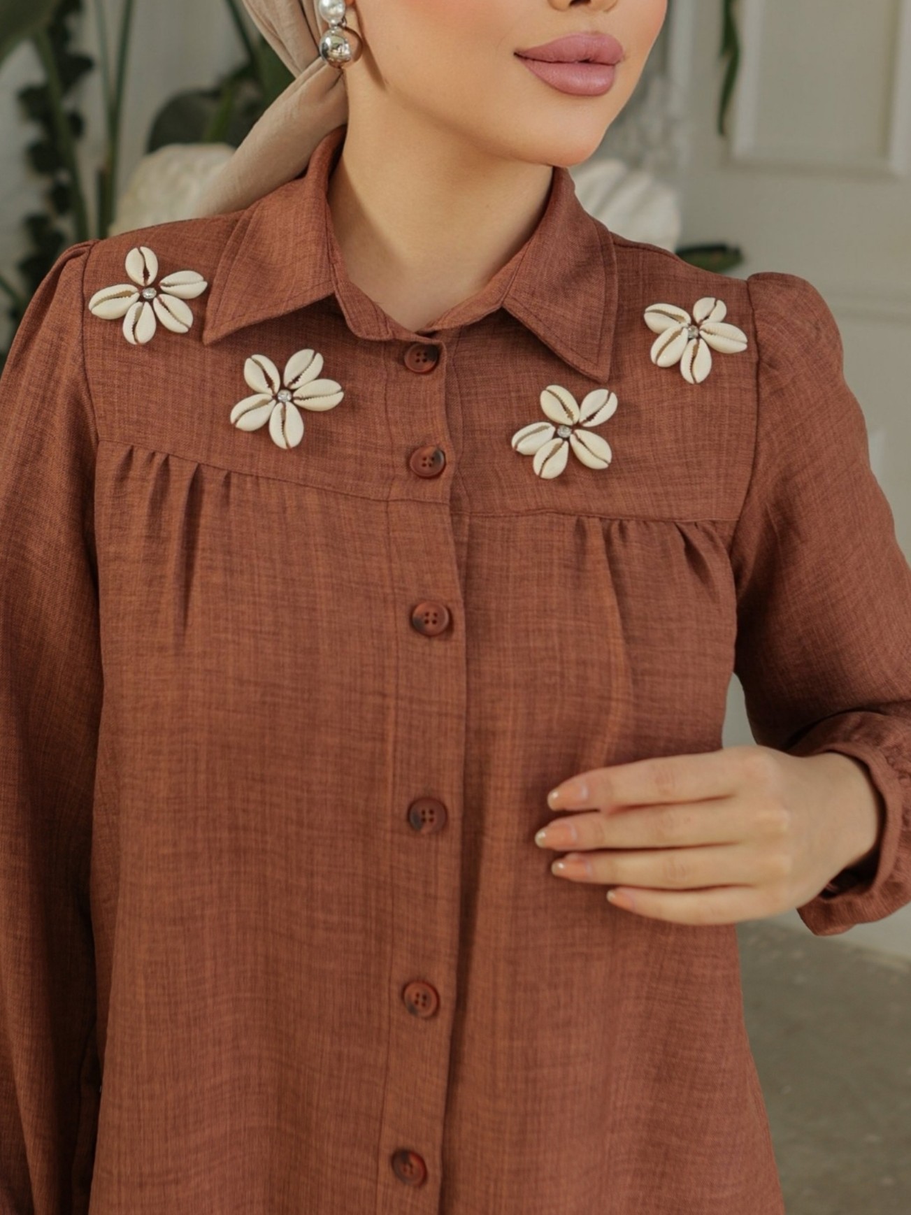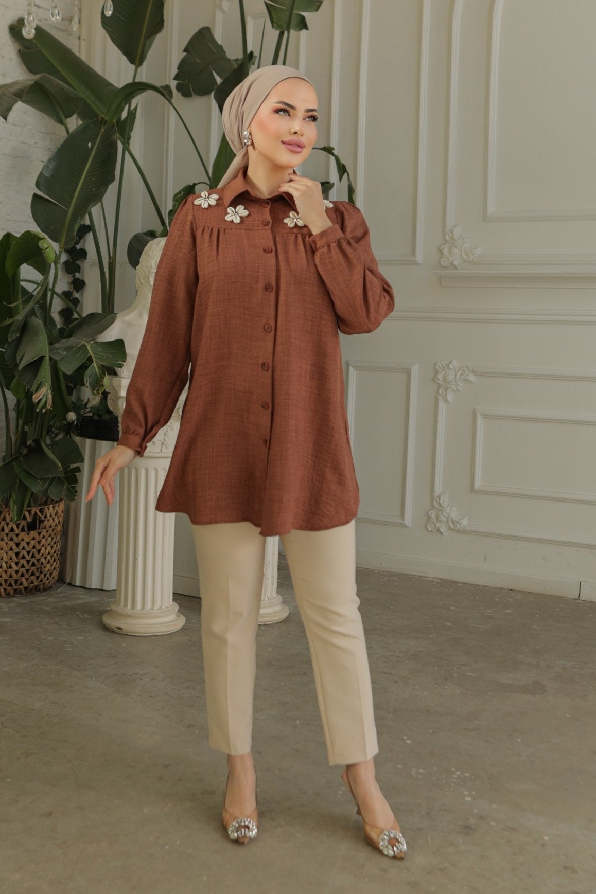 Robadan Büzgülü Ozel Aplikeli Keten Tunik -K. Kahve