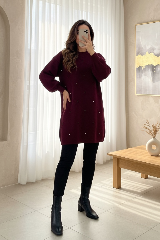 Taş Detaylı Kare Desenli Triko Tunik -Bordo