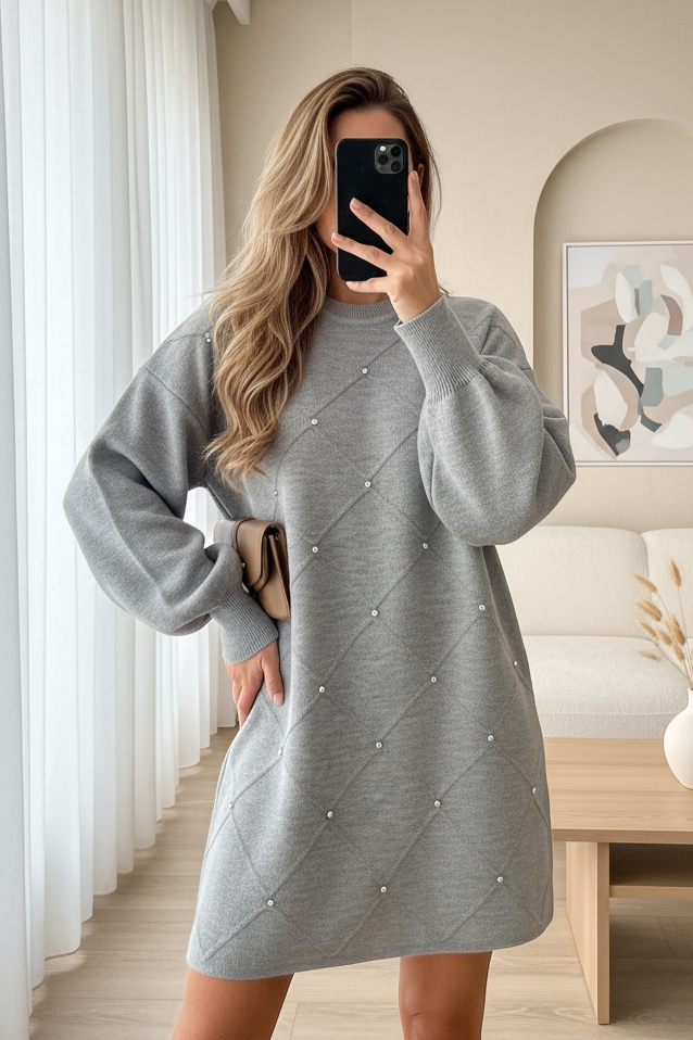 Taş detaylı kare desenli triko tunik, zarif detaylarıyla şıklığınızı ön plana çıkarır. Hem rahat hem de göz alıcı bir görünüm için mükemmel bir tercih.