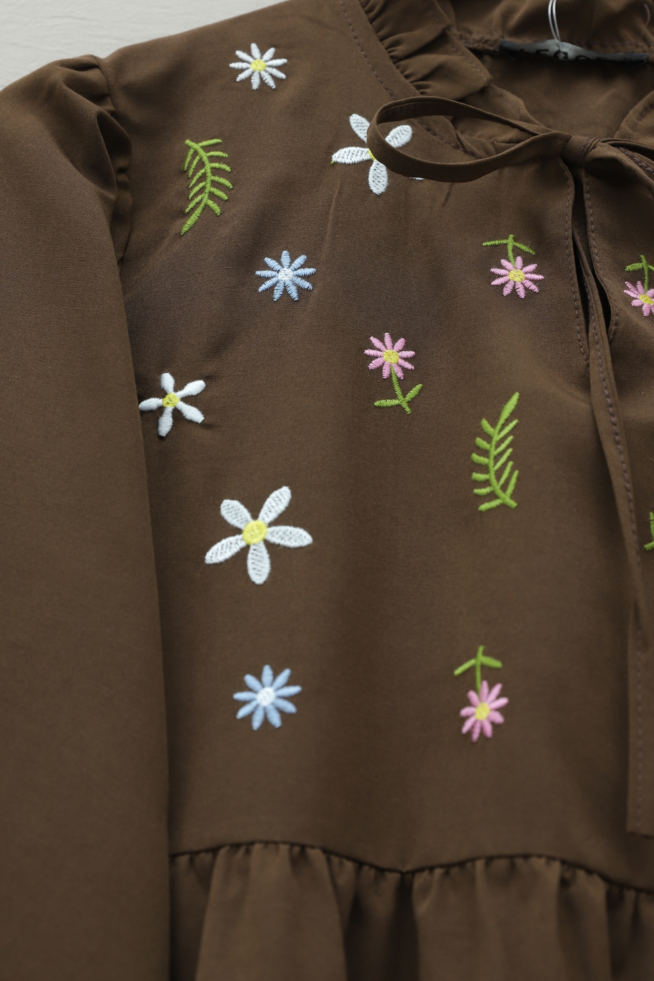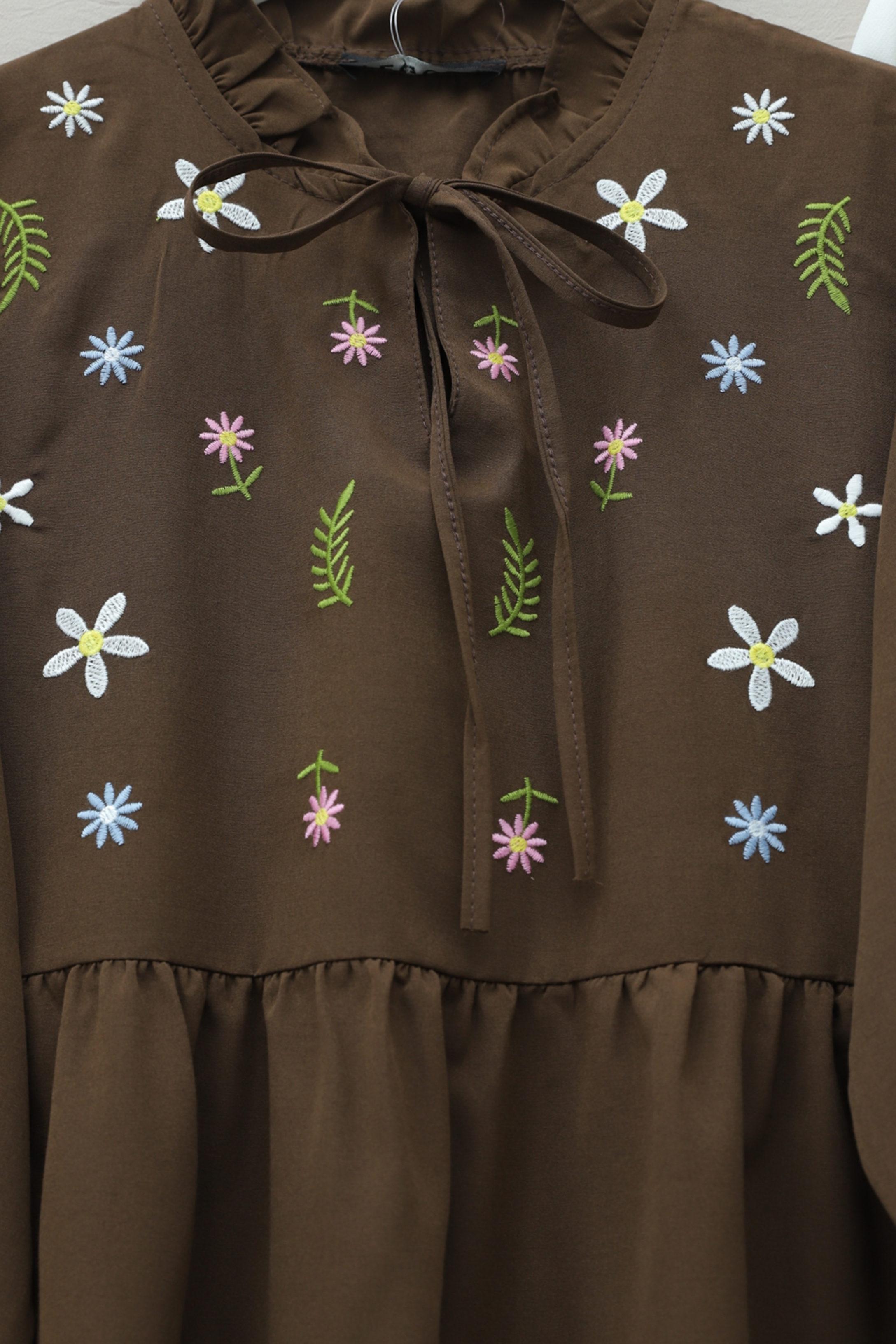 V Yaka Bağlamalı Yakası Fırfırlı Çiçek Nakışlı Poplin Tunik, romantik ve zarif bir stil sunar. V yaka ve bağlama detayı feminen bir görünüm kazandırırken, yaka fırfırı ve çiçek nakışları tasarıma zarif bir hareket katar. Poplin kumaşı hafif ve nefes alabilendir. Günlük ve şık kombinlerde rahatlıkla tercih edilir.