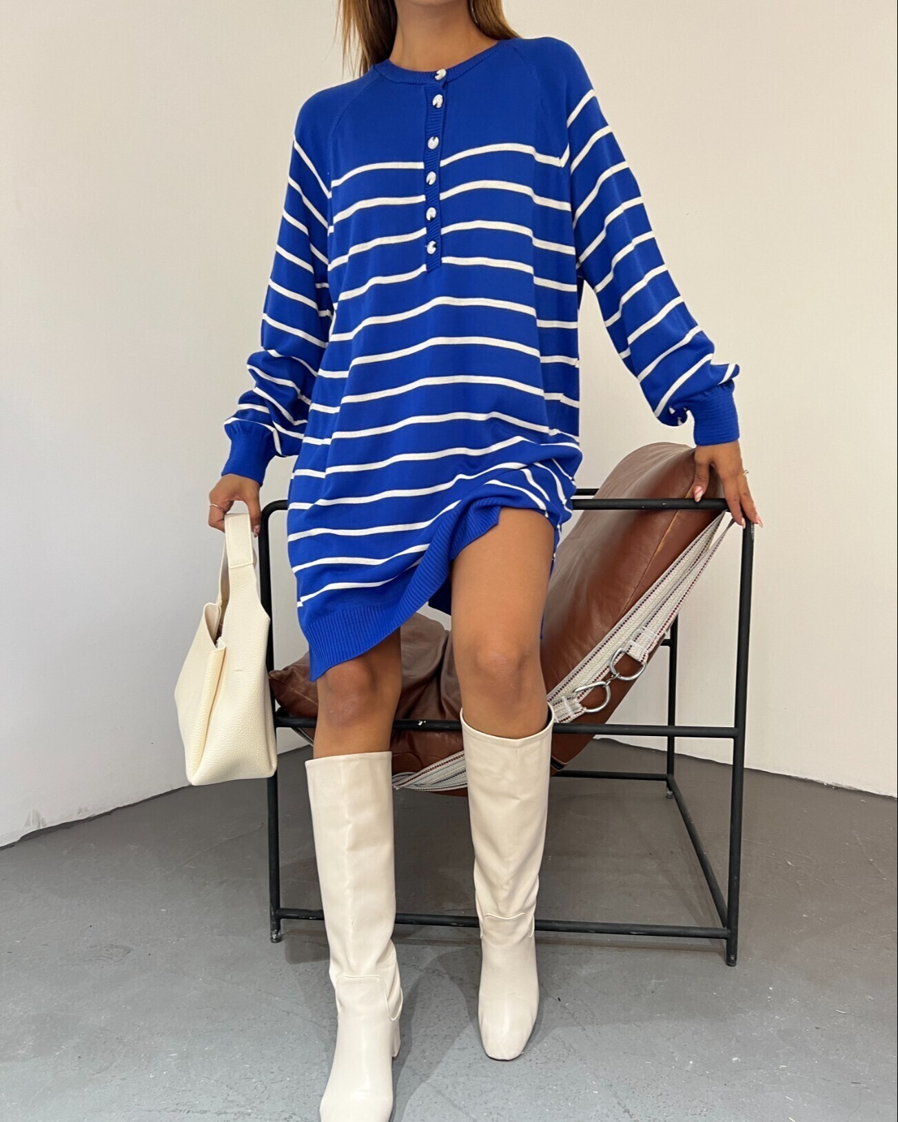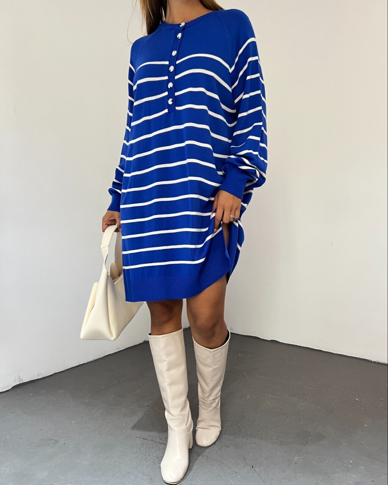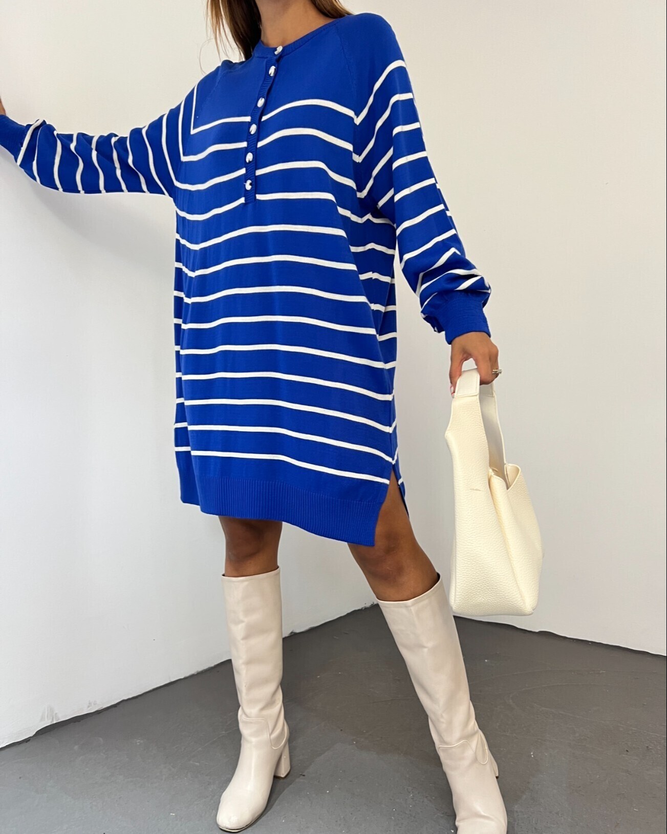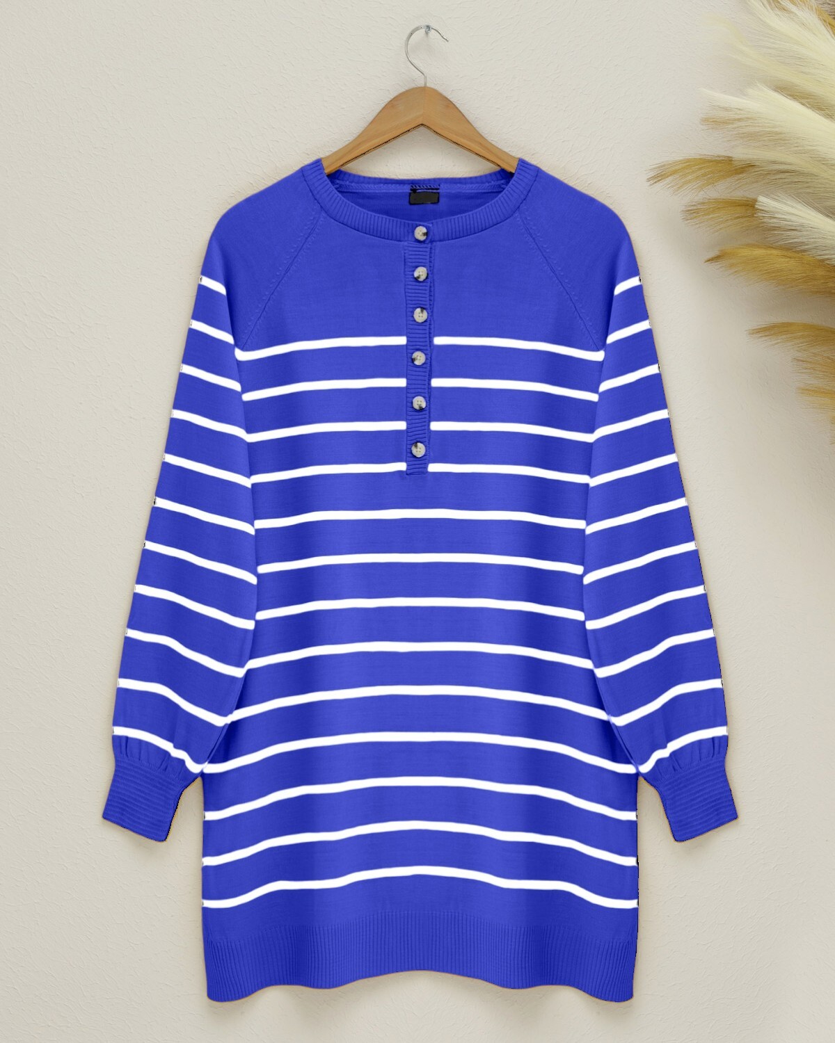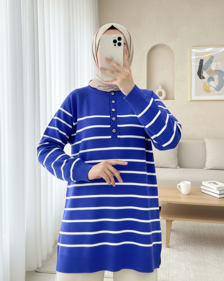 Bisiklet yaka, önden yarım düğmeli, yandan yırtmaçlı, çizgili triko tunik modelimiz yeni sezonun en çok sevilen modelleri arasında yer almaktadır.