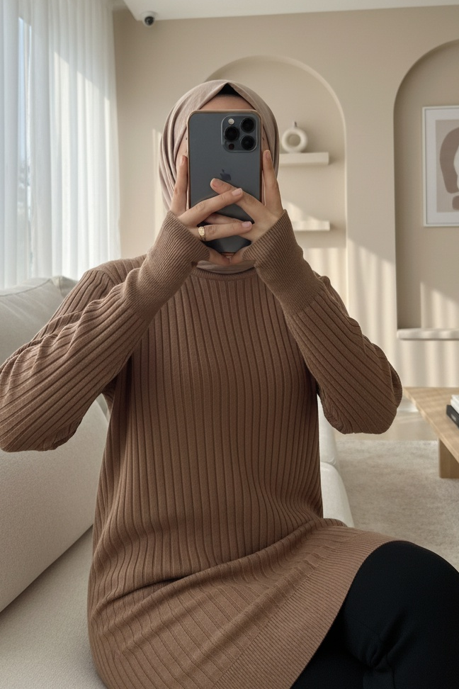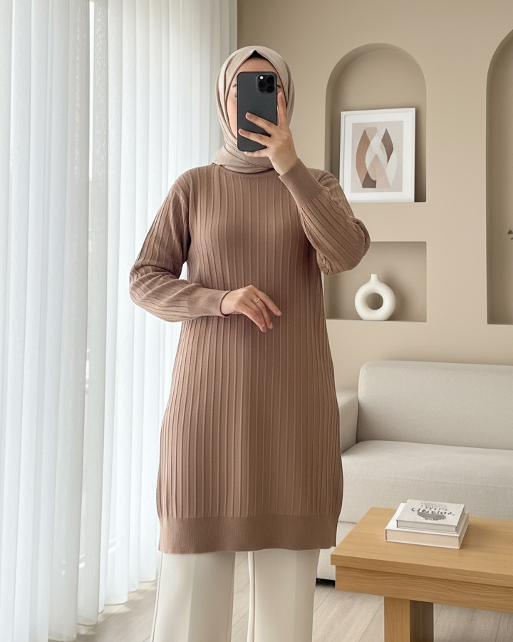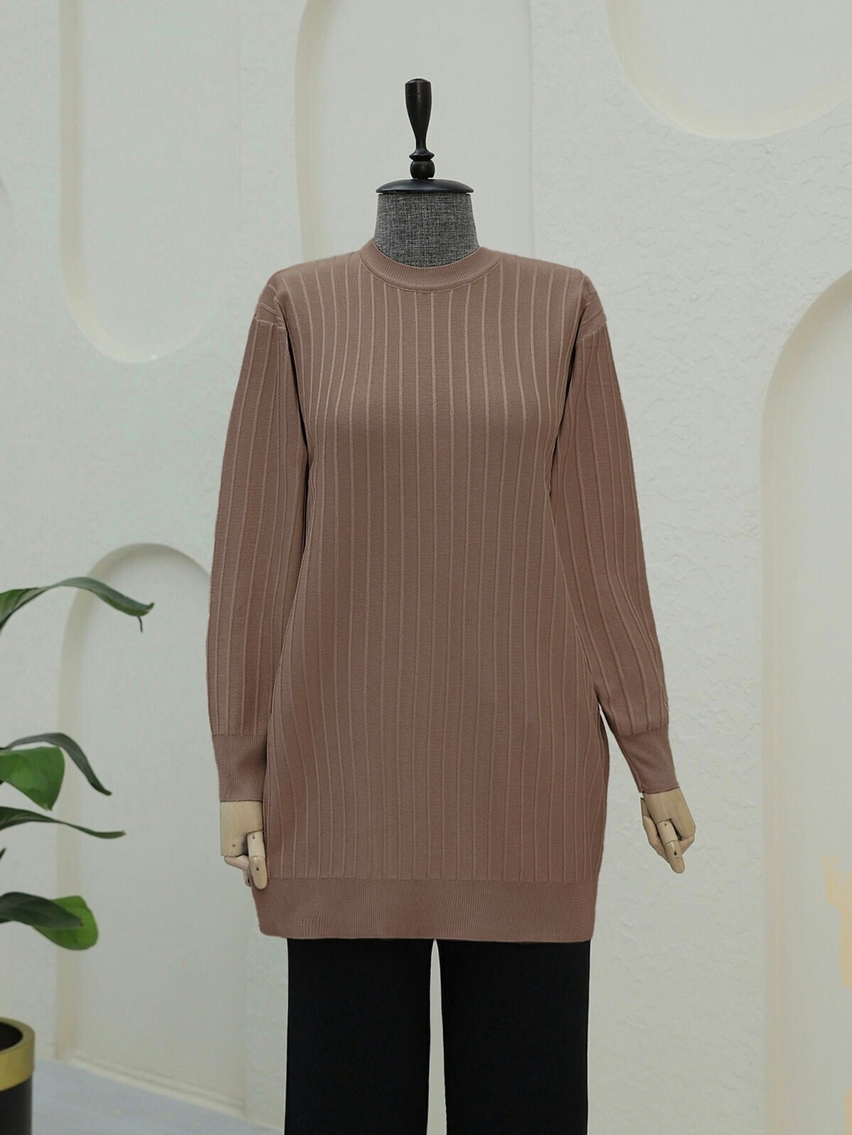 Yuvarlak Yaka İnce Çizgili Triko Tunik -Kahve