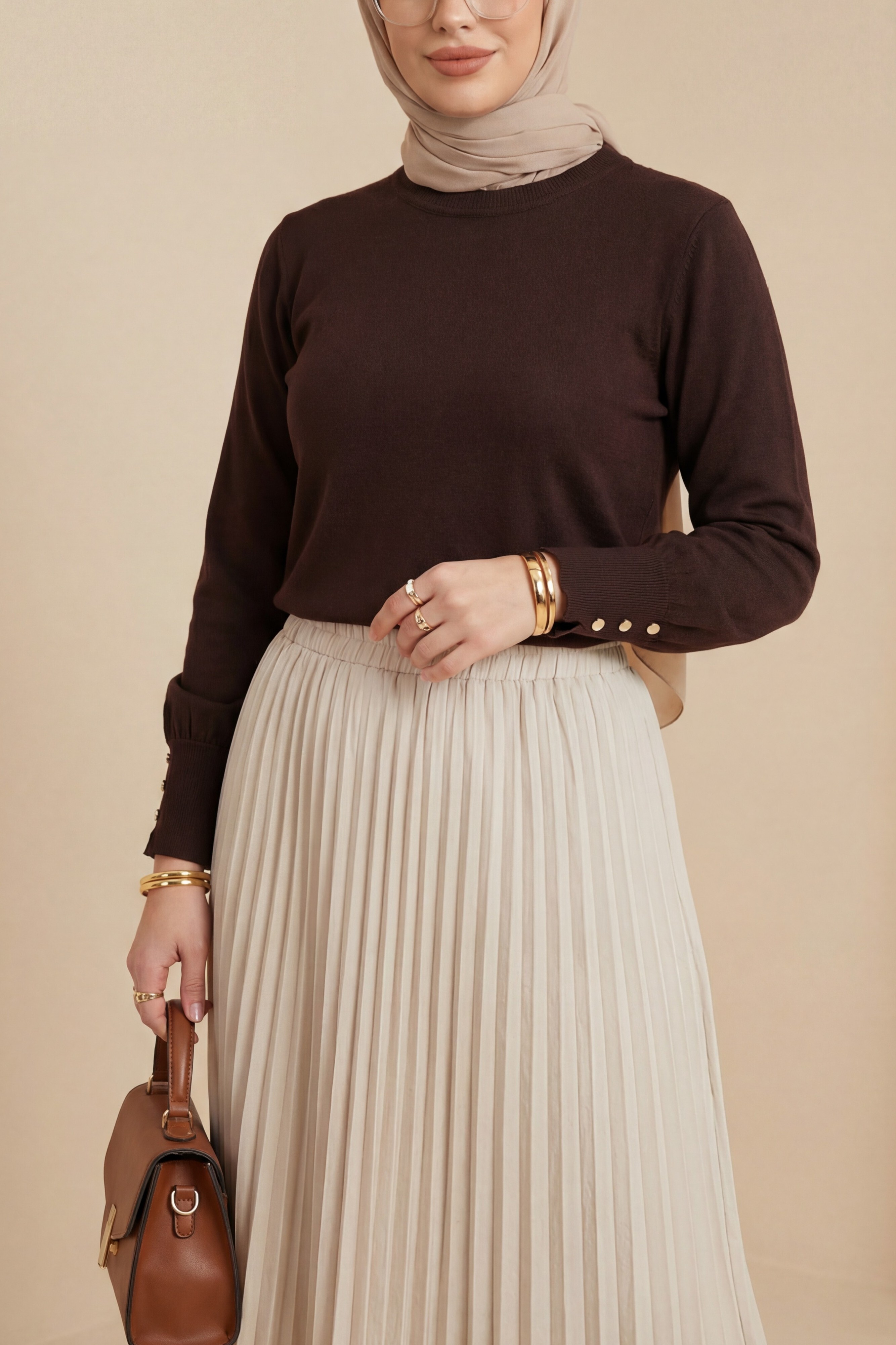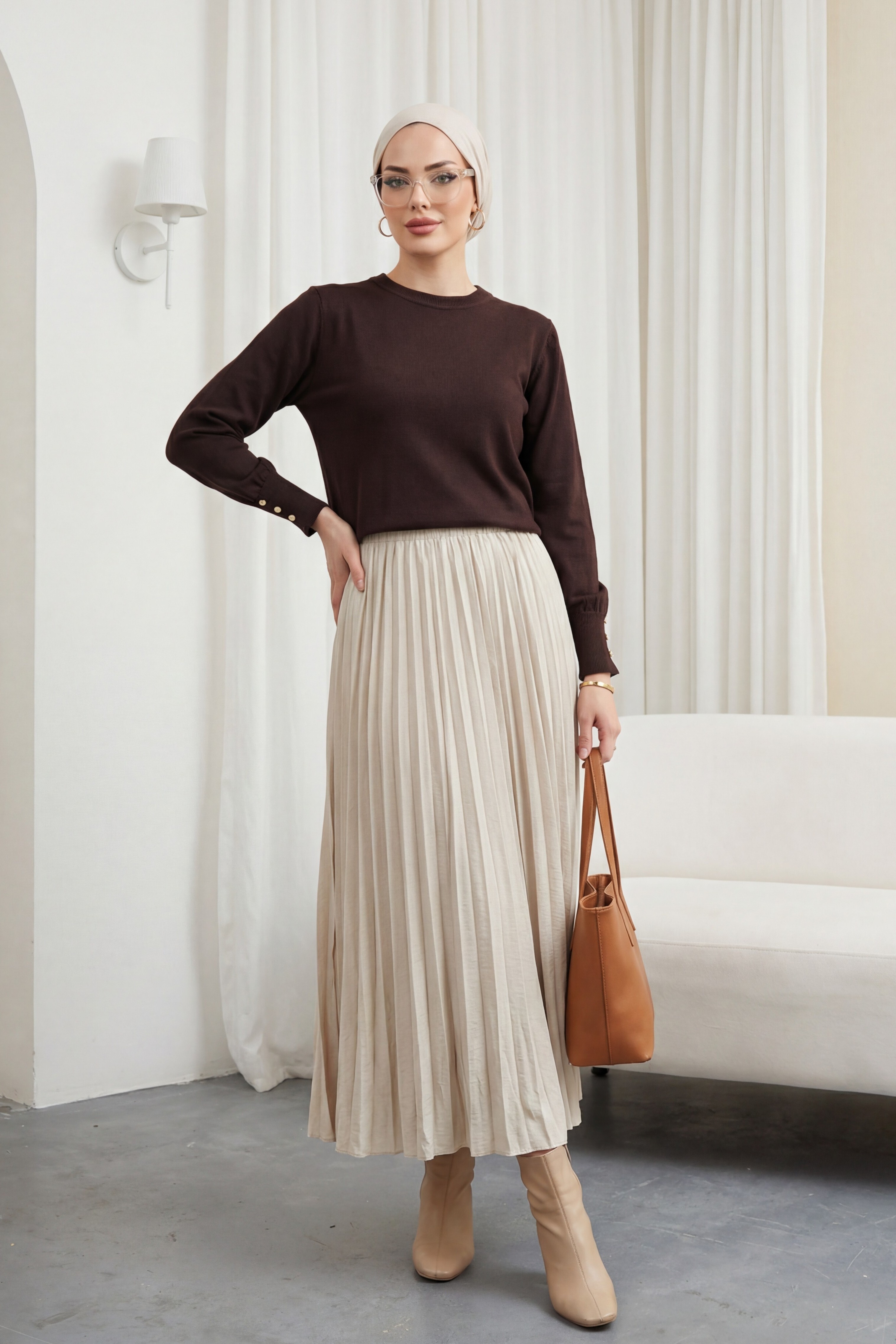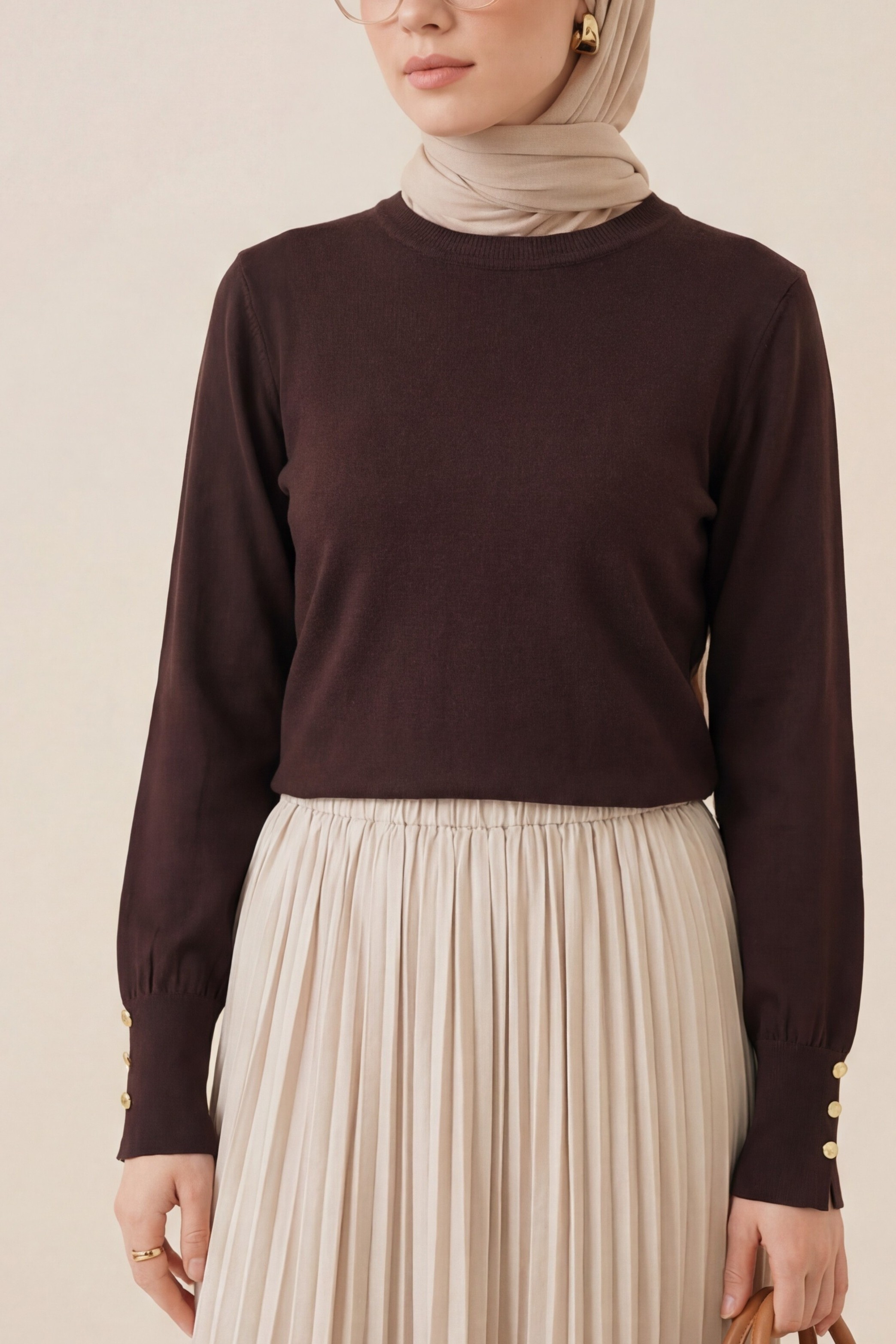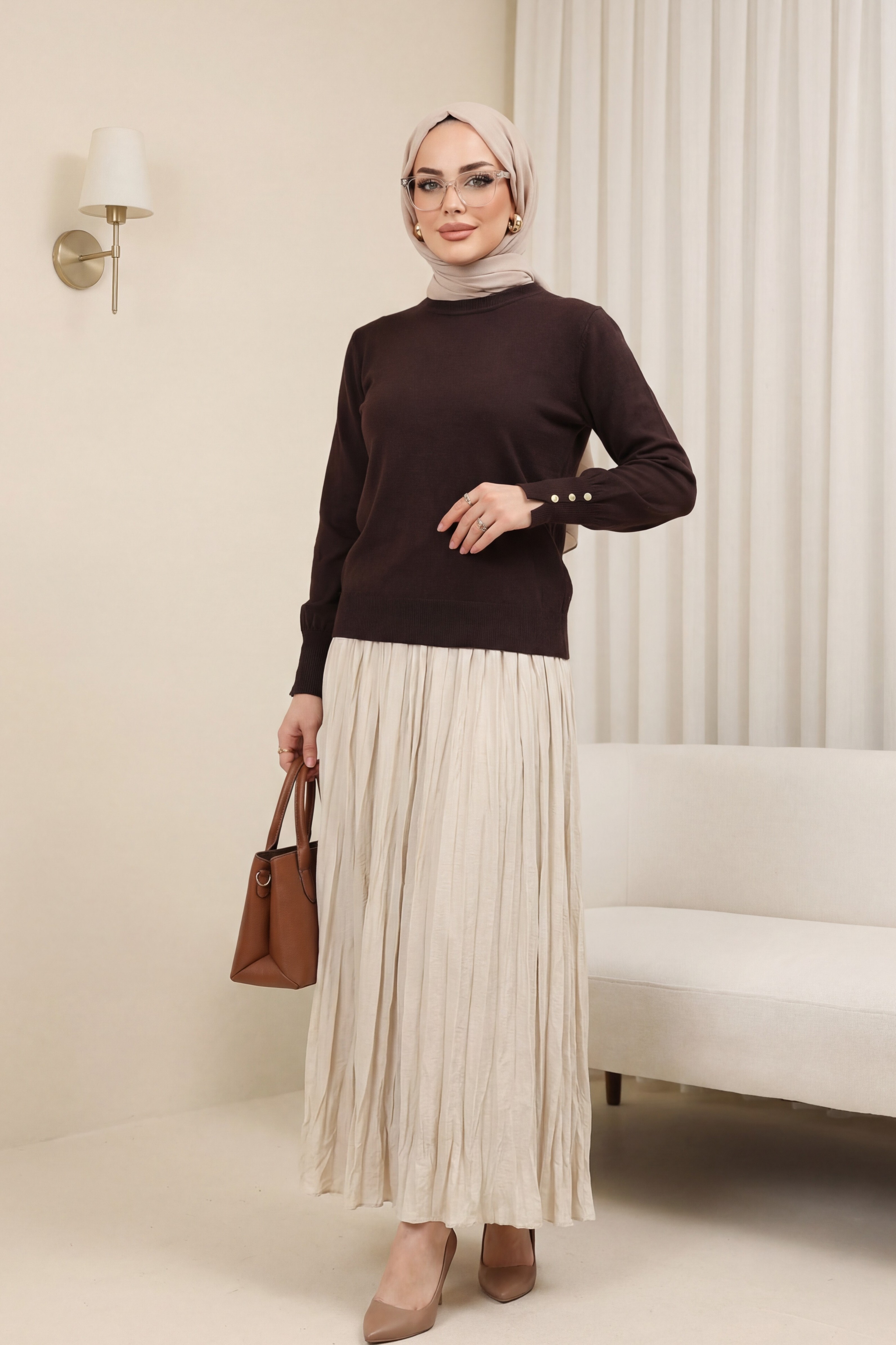 Yuvarlak Yaka Kolu Düğme Detaylı Triko Tunik -K. Kahve