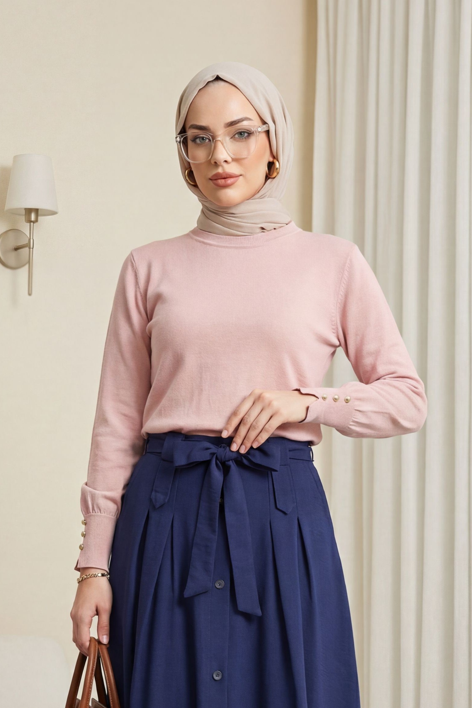 Yuvarlak Yaka Kolu Düğme Detaylı Triko Tunik -Pudra