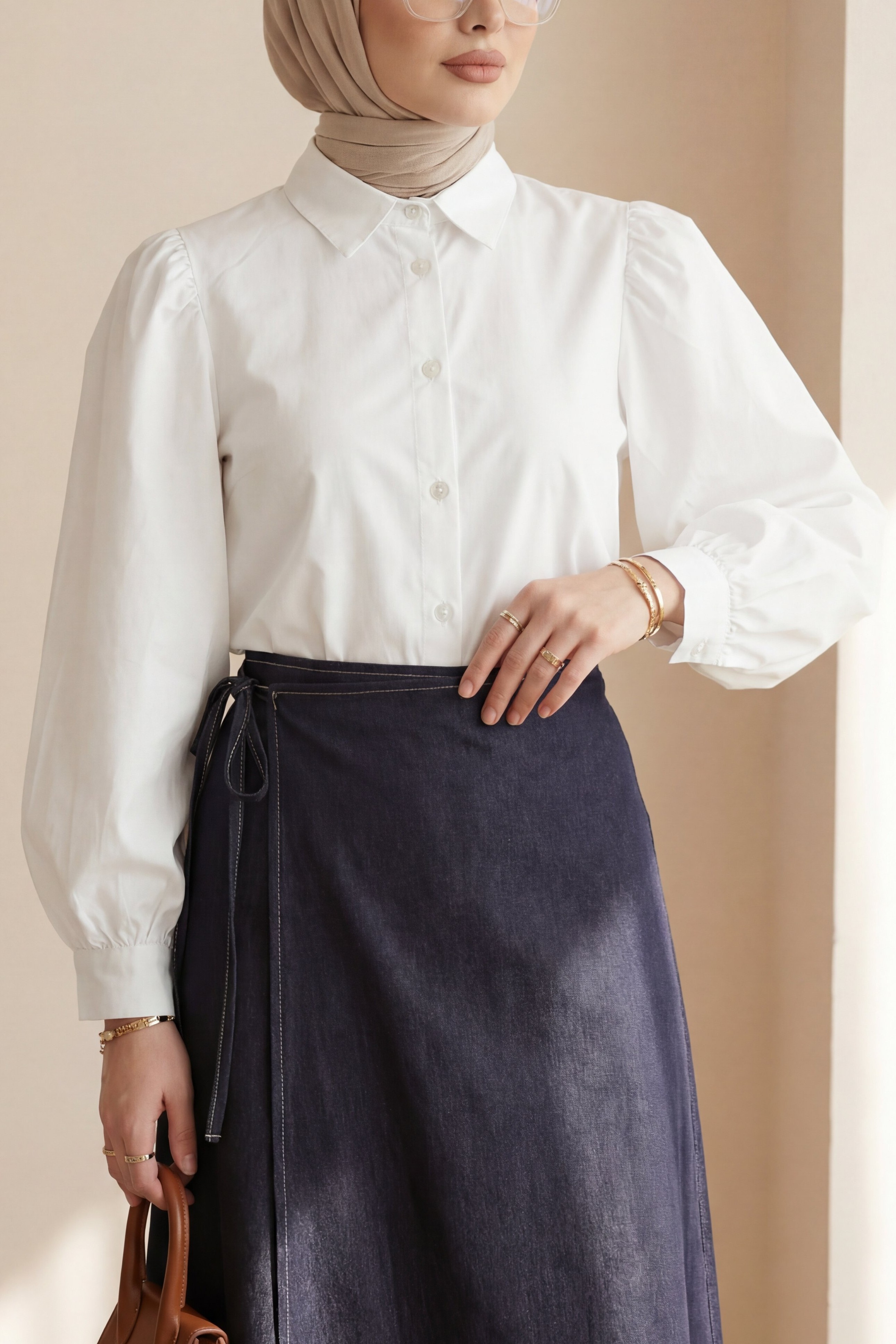 Kombindeki şal, çanta, ayakkabı ve takılar aksesuar olarak kullanılmıştır.