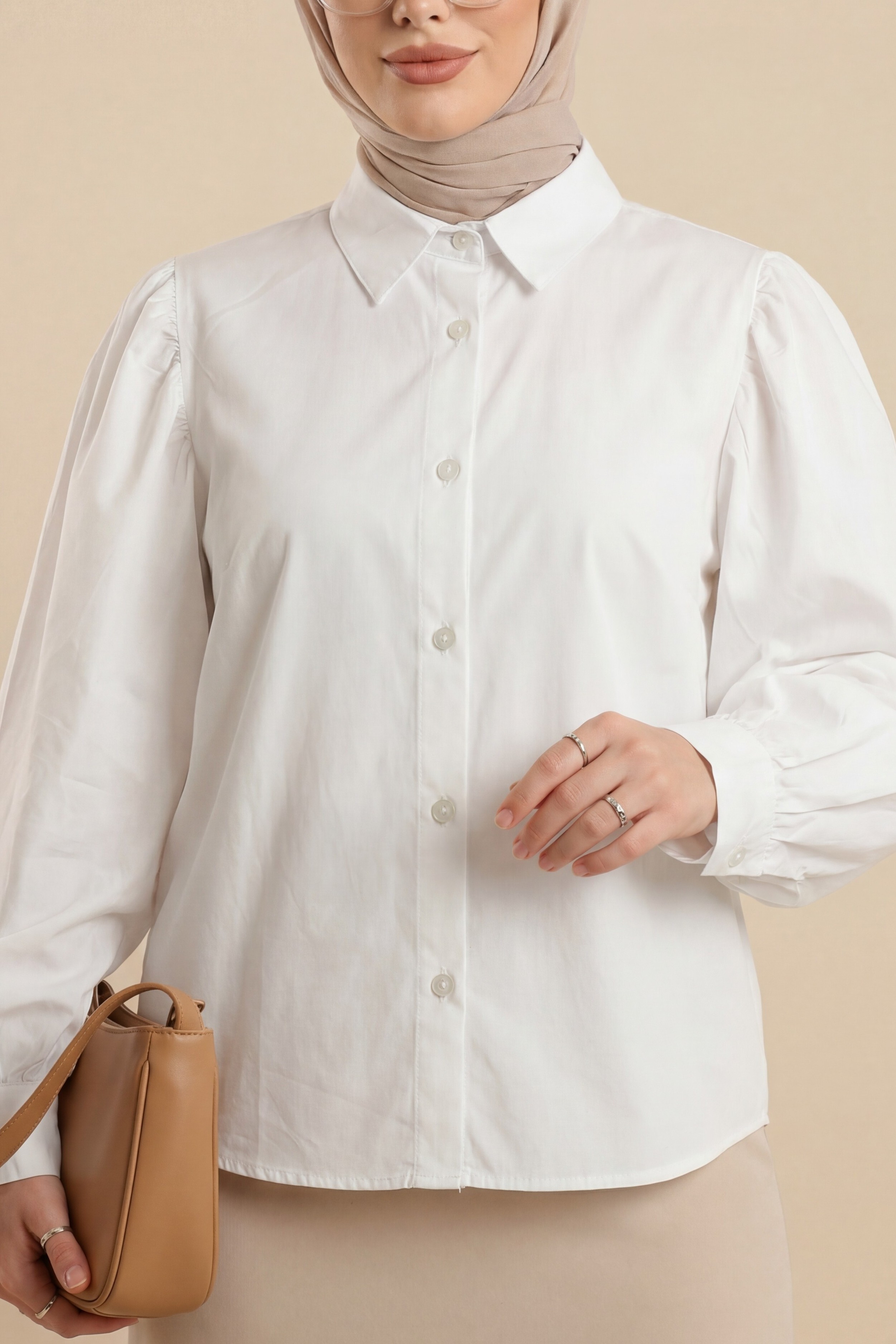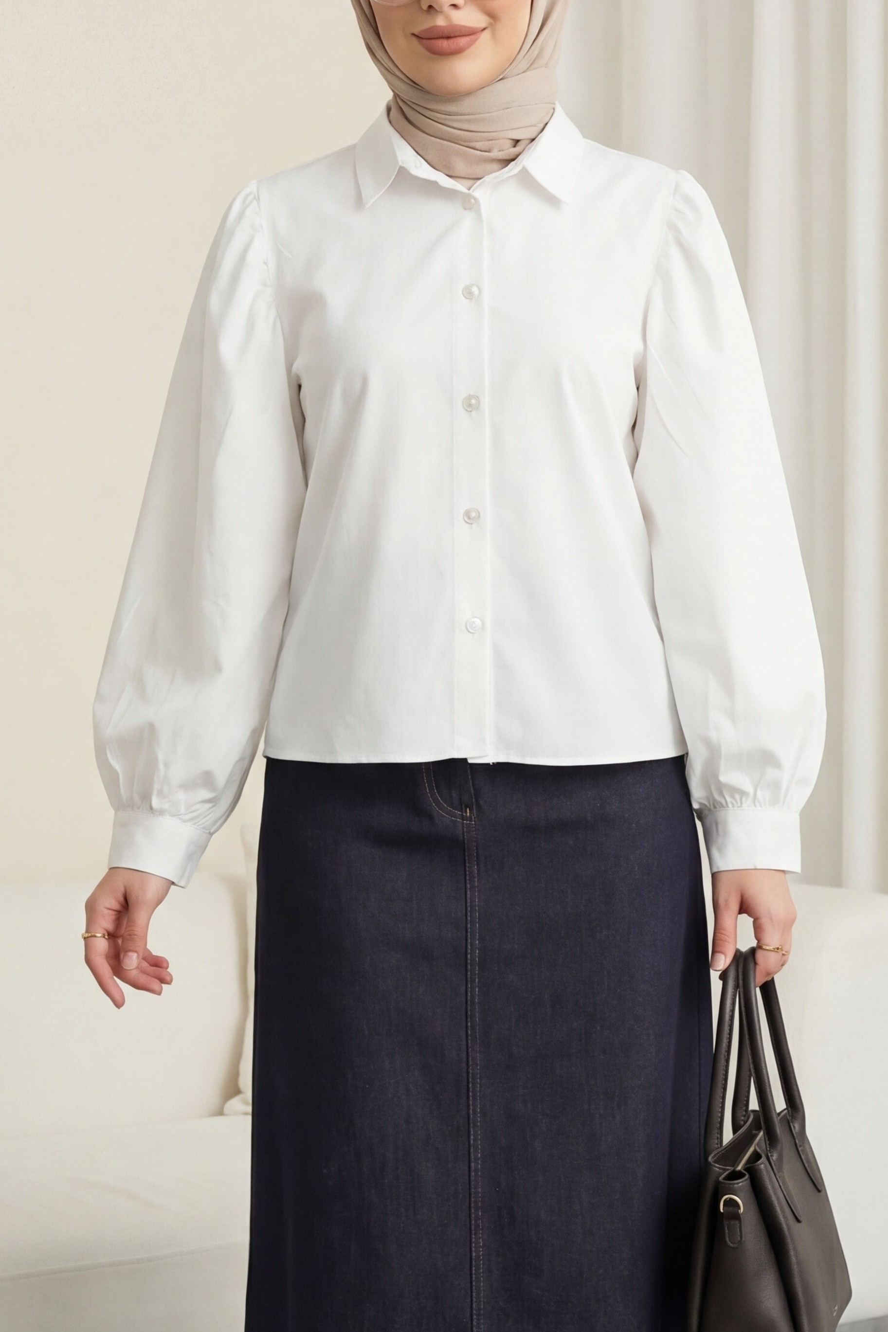 Balon Kol Düğmeli Kısa Poplin Gömlek -Beyaz
