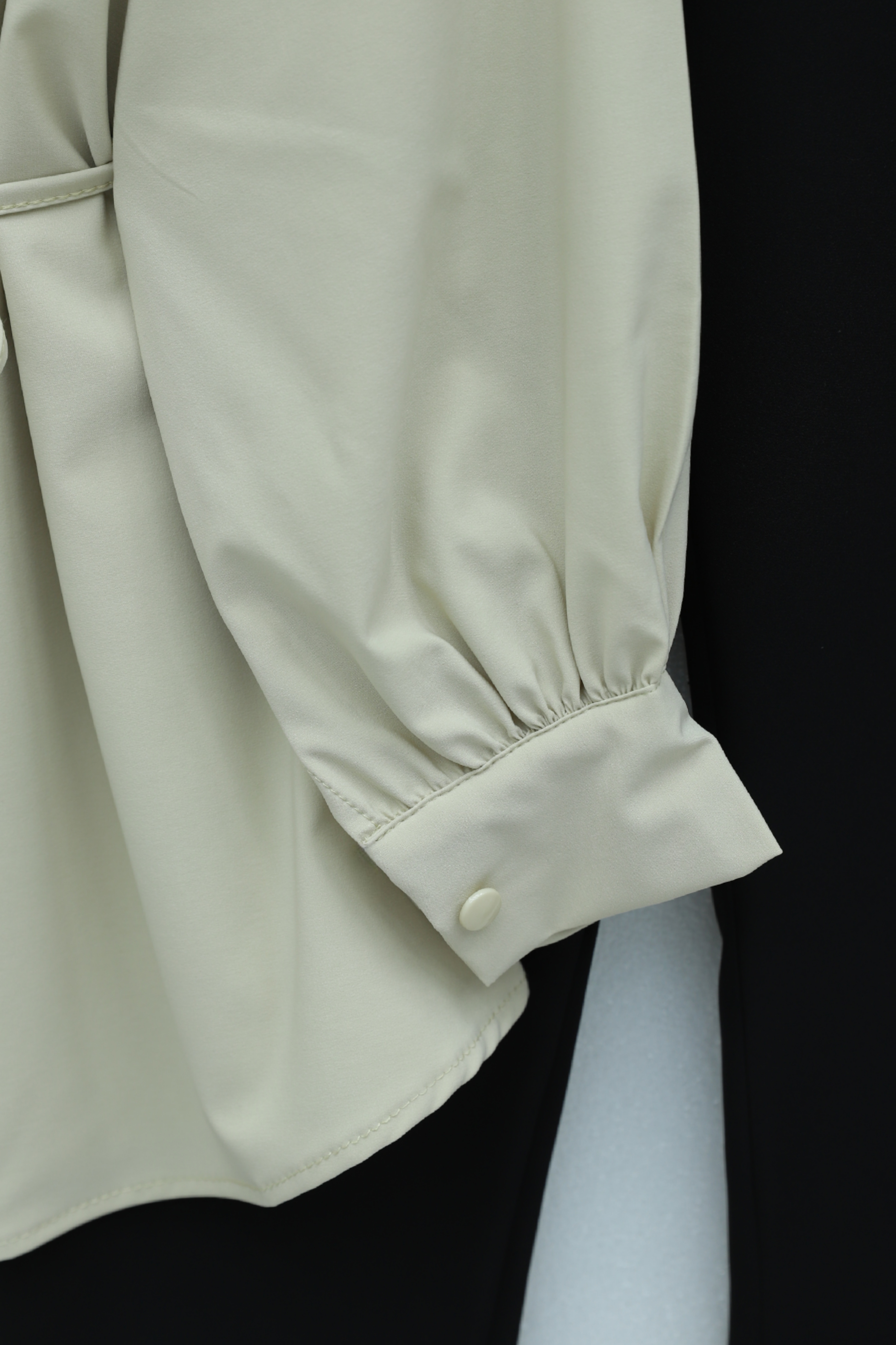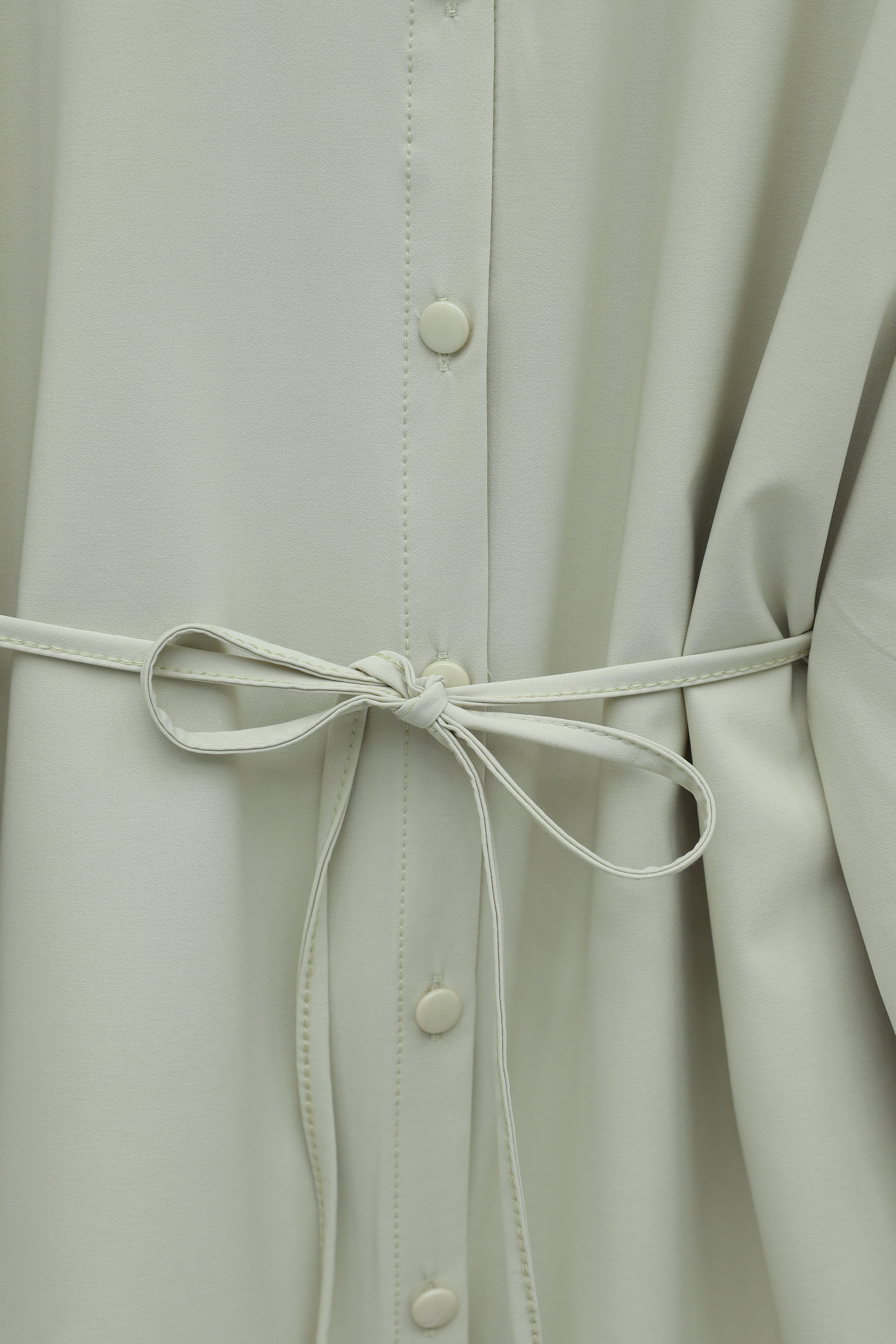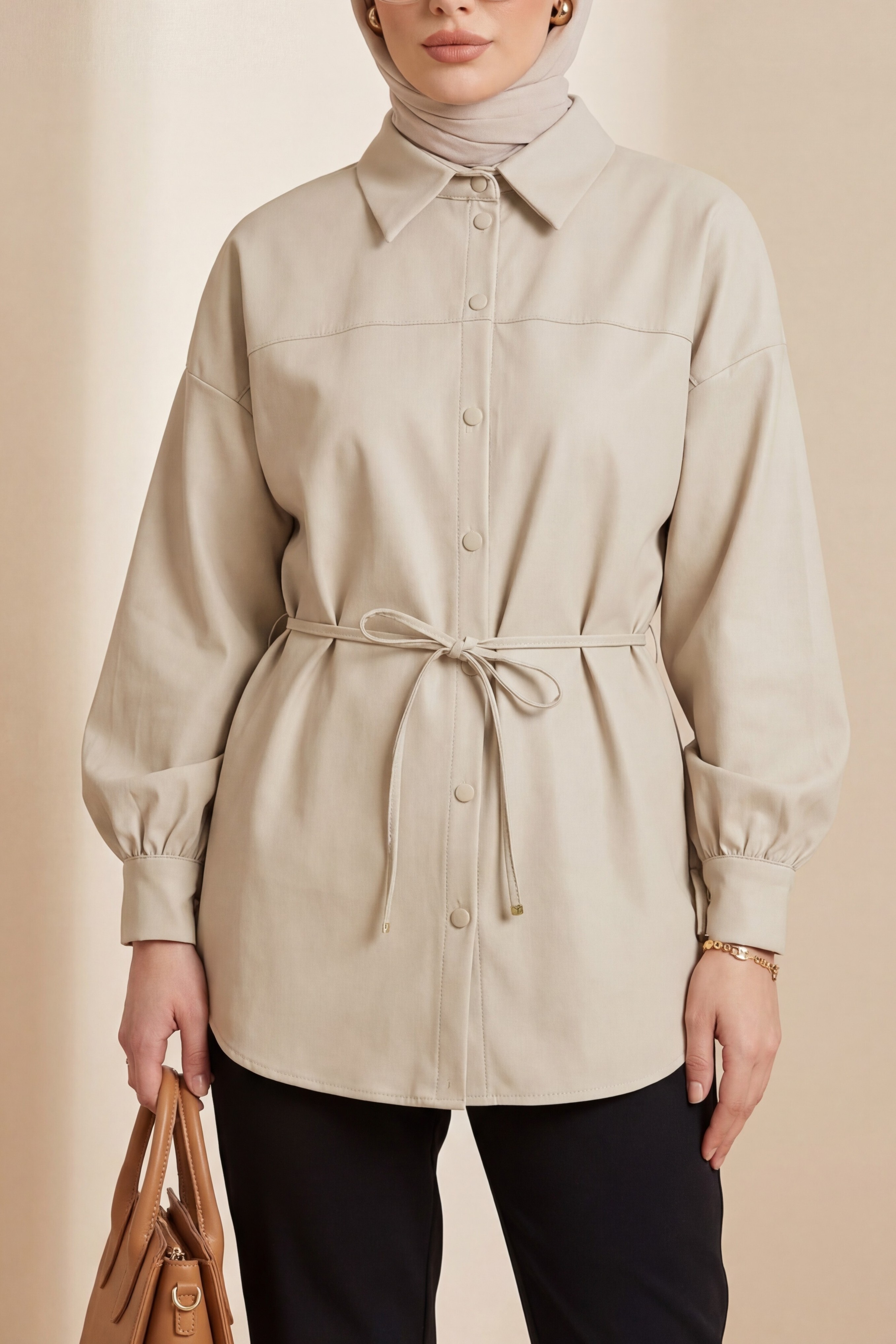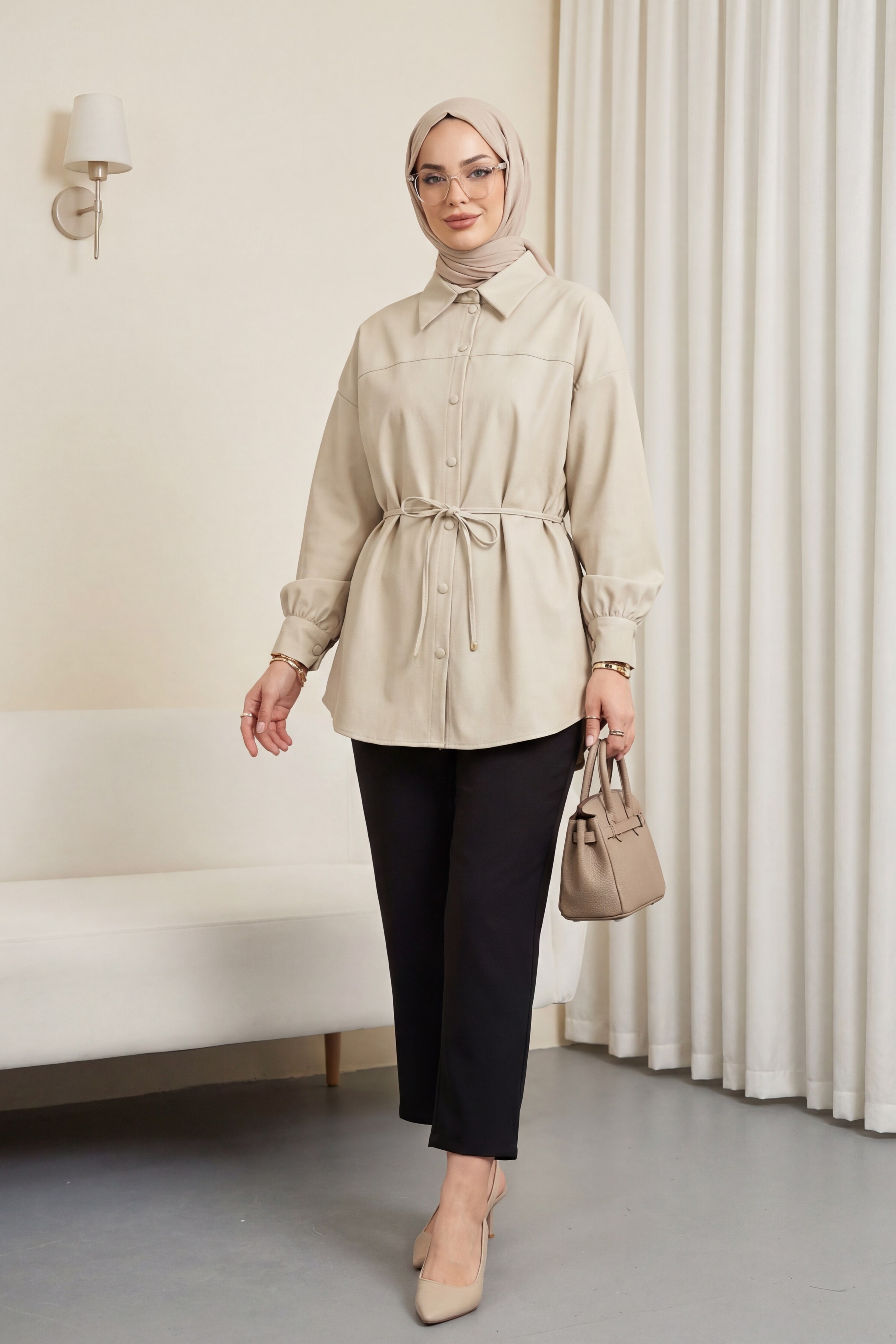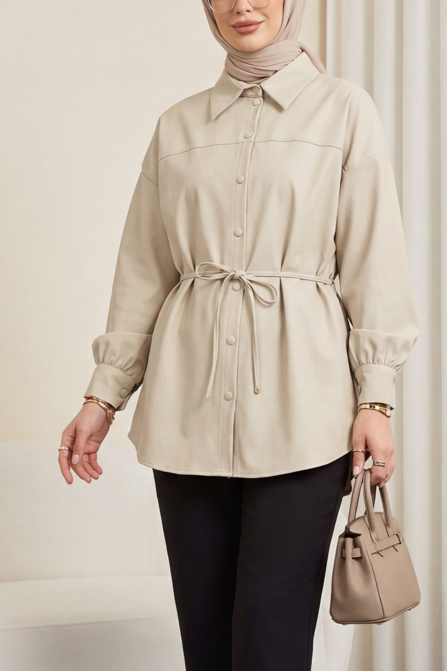 Beli Bağcıklı Düğmeli Oversize Modal Tunik -Bej