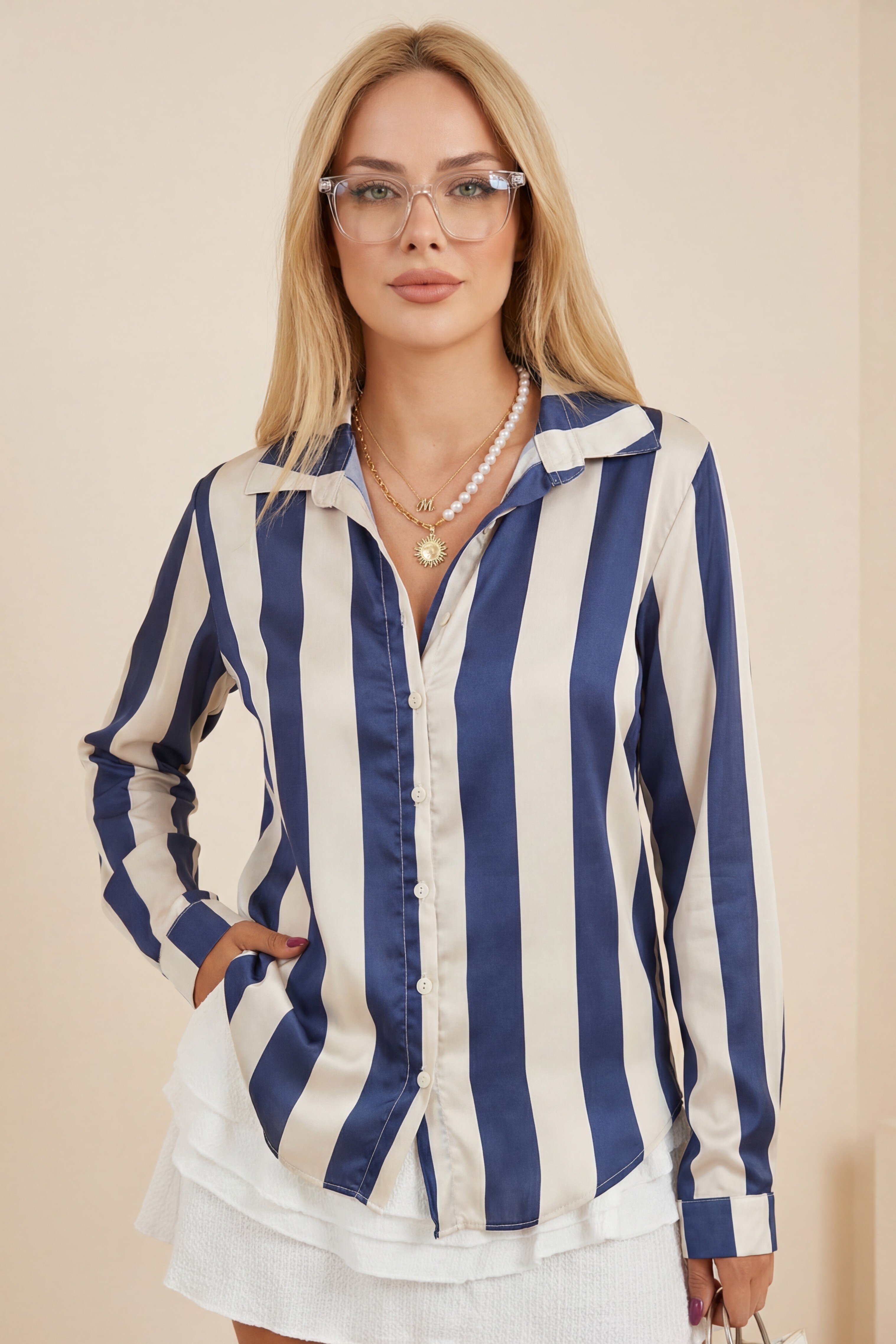 Önden düğmeli, çizgi desenli, önü kısa arkası uzun saten gömlek modelimiz yeni sezonun en çok sevilen modelleri arasında yer almaktadır.