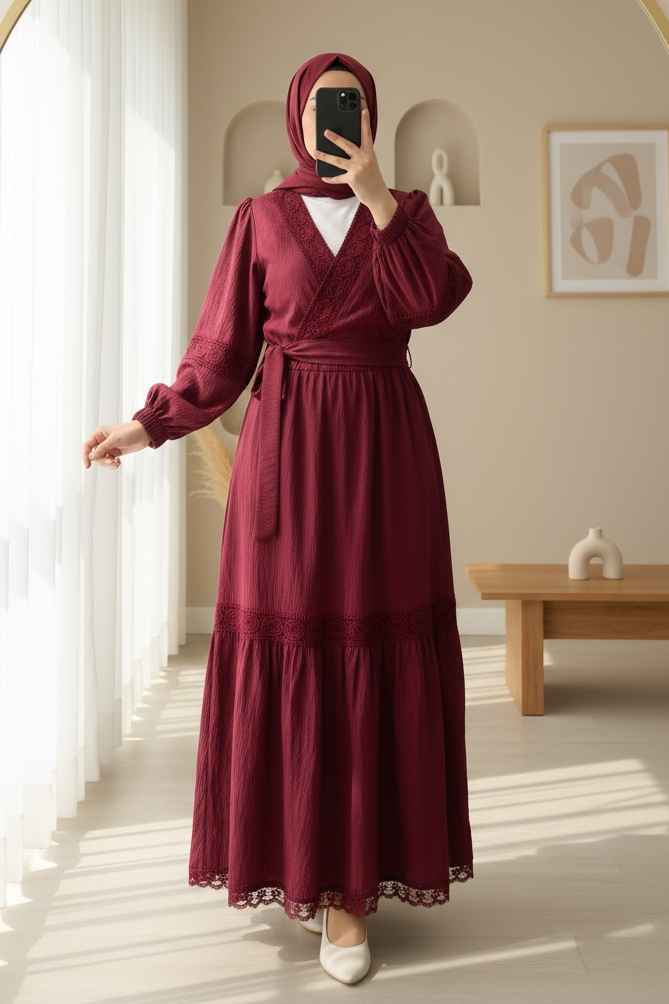Dantel Detaylı Bağlamalı Kolu Lastikli Kraş Etekli Takım, zarif dantel ve rahat kol lastiğiyle feminen bir şıklık sunar. Bağlamalı tasarımı ve kraş eteğiyle modern ve rahat bir kombin oluşturur.
