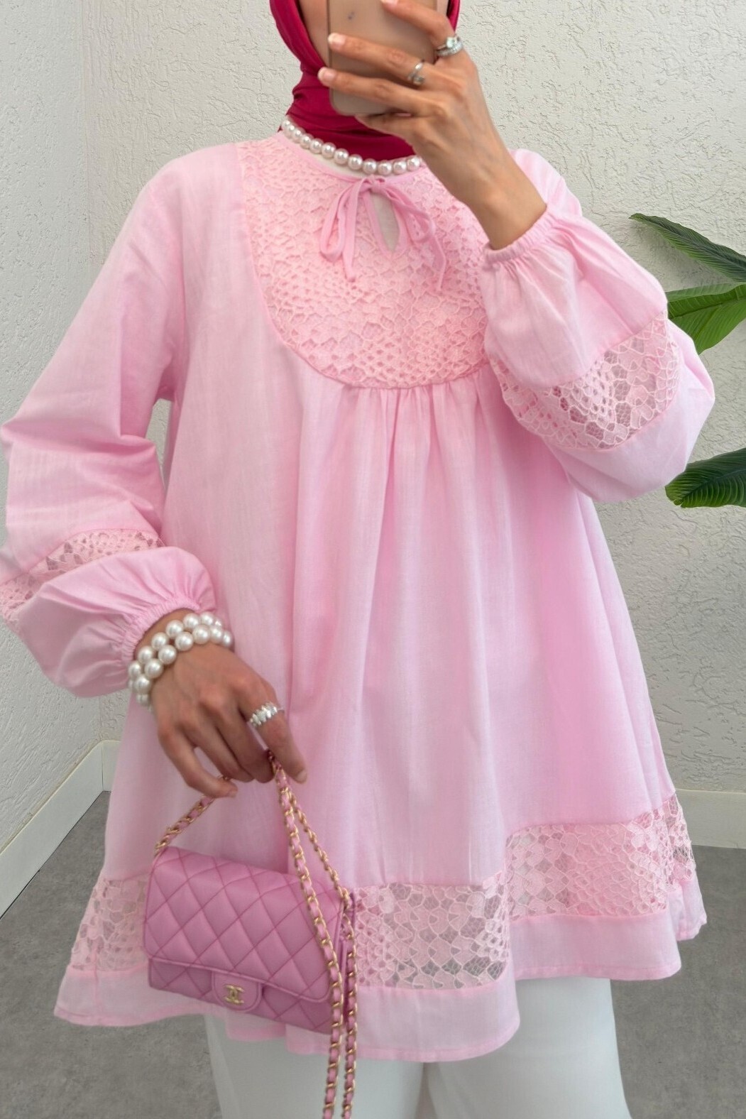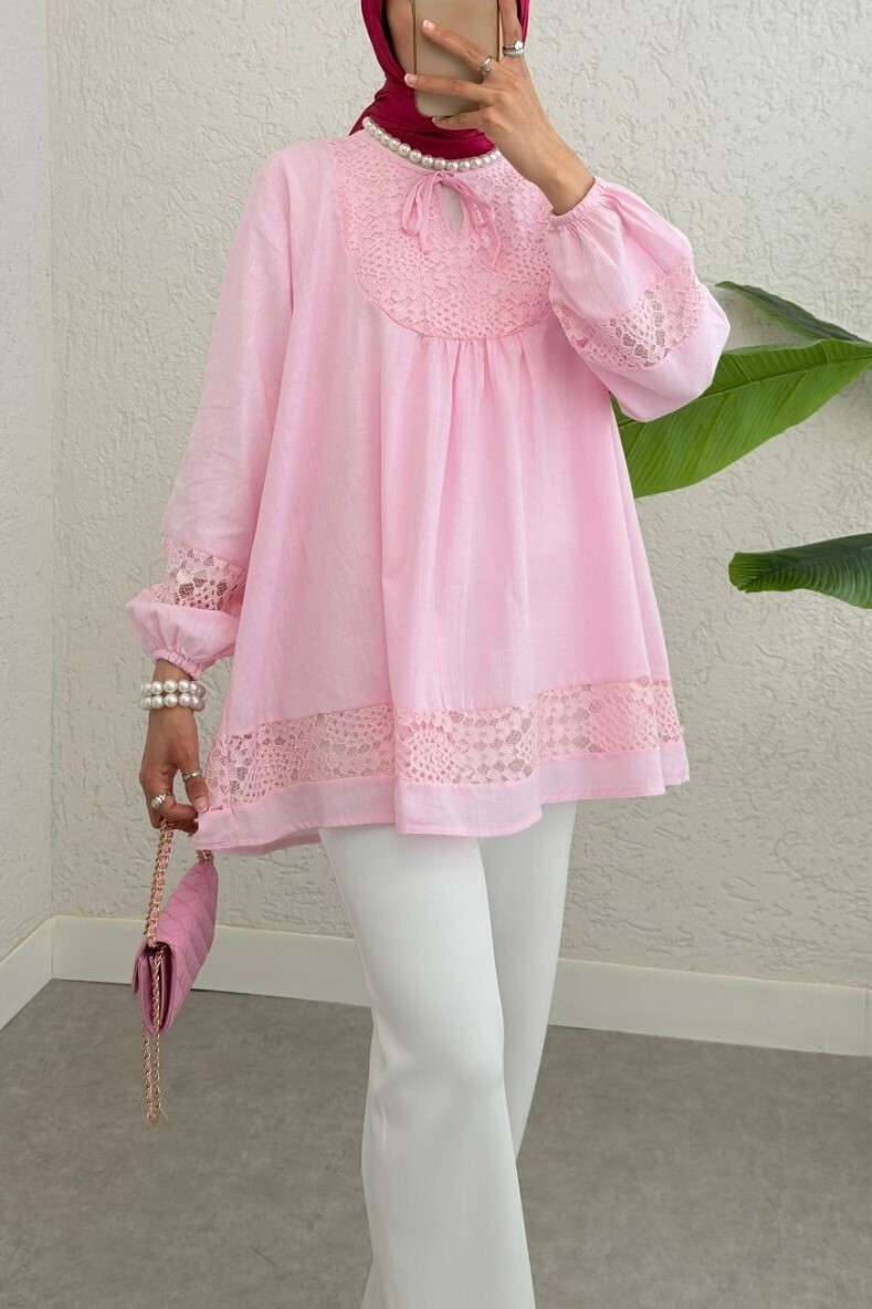 Dantel Detaylı Yakası Bağlamalı Kolu Lastikli Gömlek