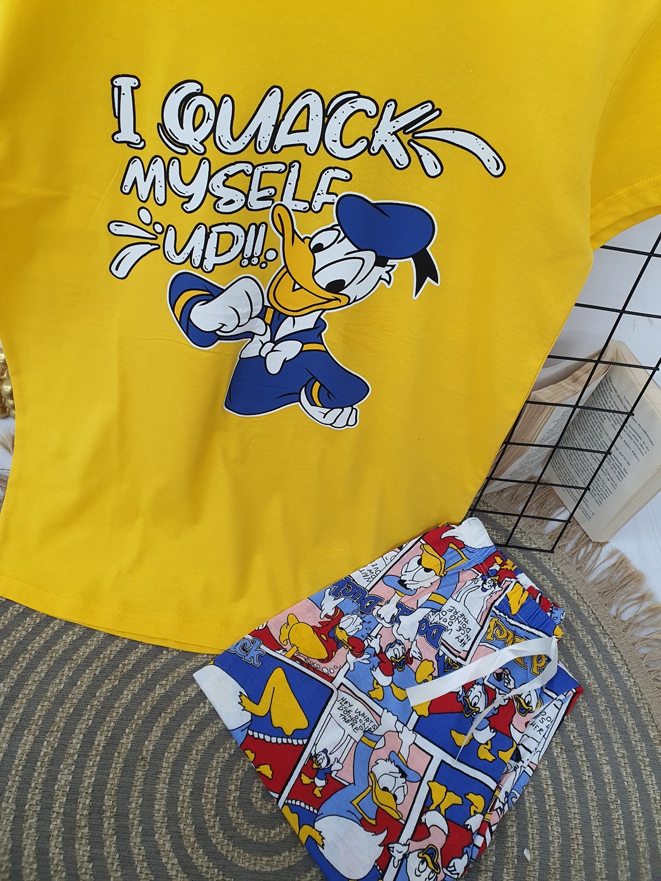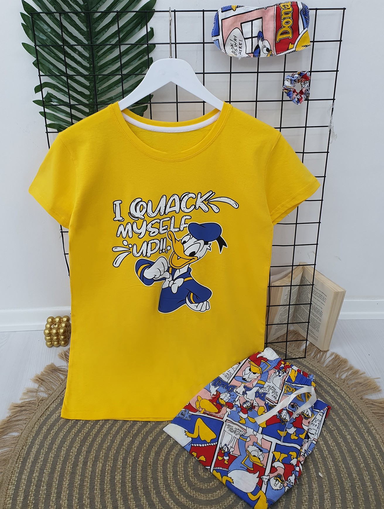 Bisiklet yaka, önü baskılı, kısa kollu; pijama altının beli ve paçası lastikli, cepsiz, içerisinde toka ve göz bandı bulunan pijama takımı modelimiz yeni sezonun en çok sevilen modelleri arasında yer almaktadır.